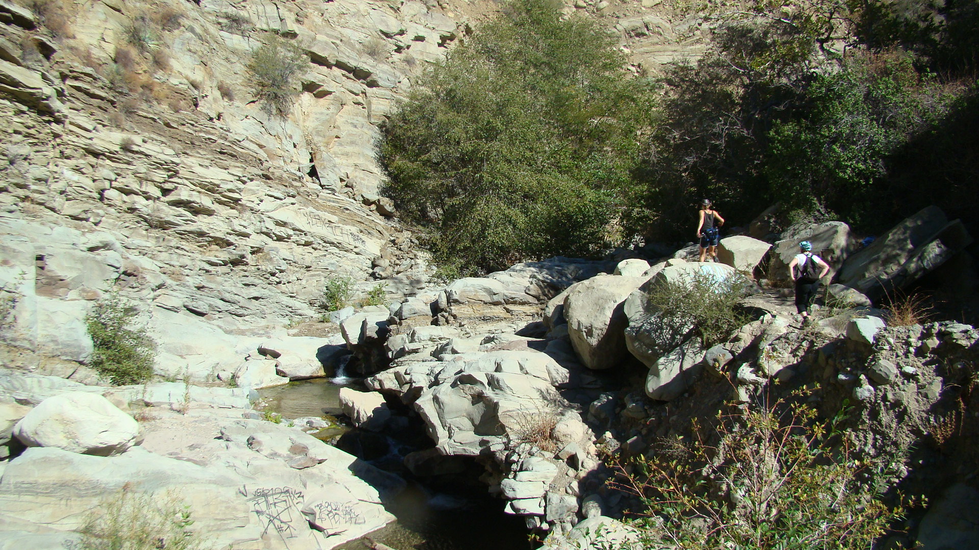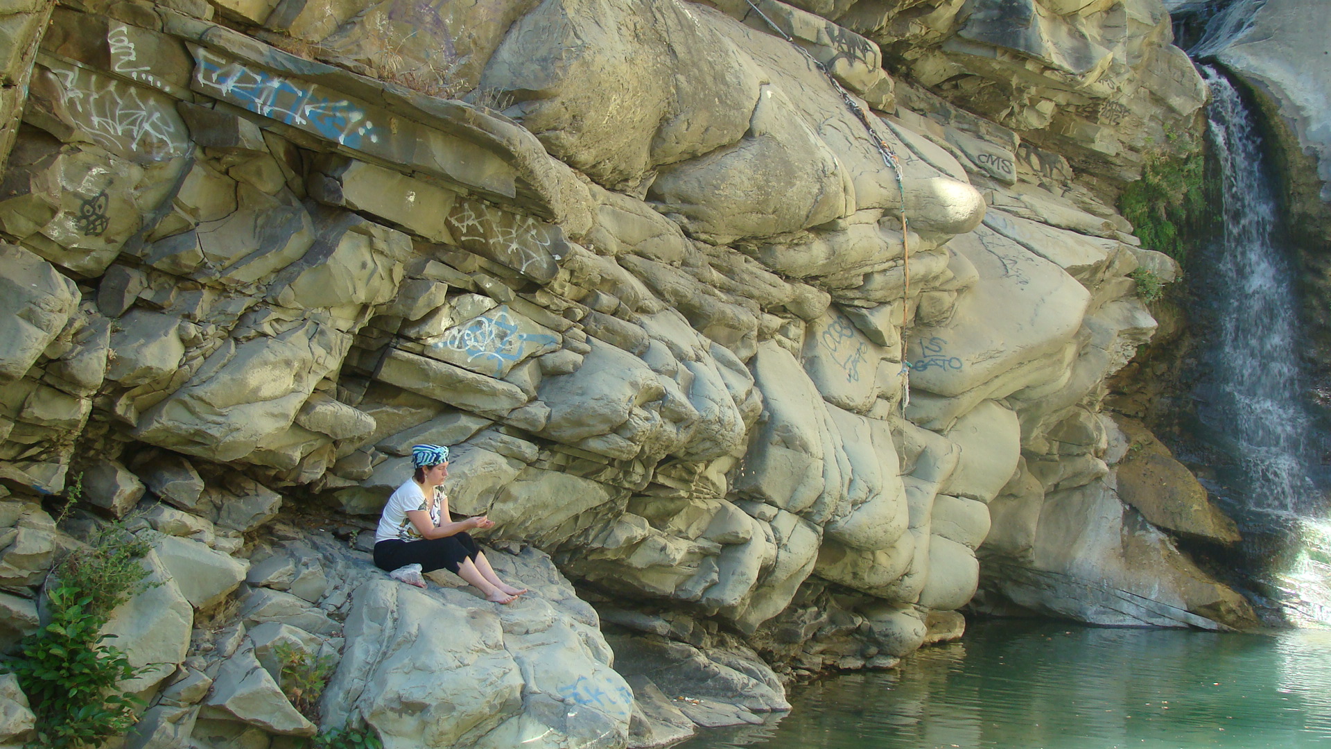 Uz beigām taka pazūd vispār un mēs rāpjamies pa lieliem un maziem akmeņiem, lai tiktu uz priekšu. Mani spēki ir galā, bet laimīgā kārtā arī ceļš ir galā. Mēs esam pie kalnu baseina, kurā krīt neliels ūdenskritums. Biju pārliecināta, ka par spīti visam, metīšos iekšā un peldēšos, tomēr to nedaru. Ūdens ir visai auksts un izskatās ne pārāk tīrs. Augšup tas ir tīrāks un skati vēl smukāki – tur ir arī dabīga akmens nogāze, pa kuru kā pa akvaparka reni var šļūkt dabīgajā baseinā. To es gan redzu tikai Džima bildēs, jo tālāk uzkāpt nav jaudas. Arī parējie ir noguruši ne pa jokam un dodamies atceļā kopā. Pat Džims atzīst, ka šādā karstumā nav kāpis.