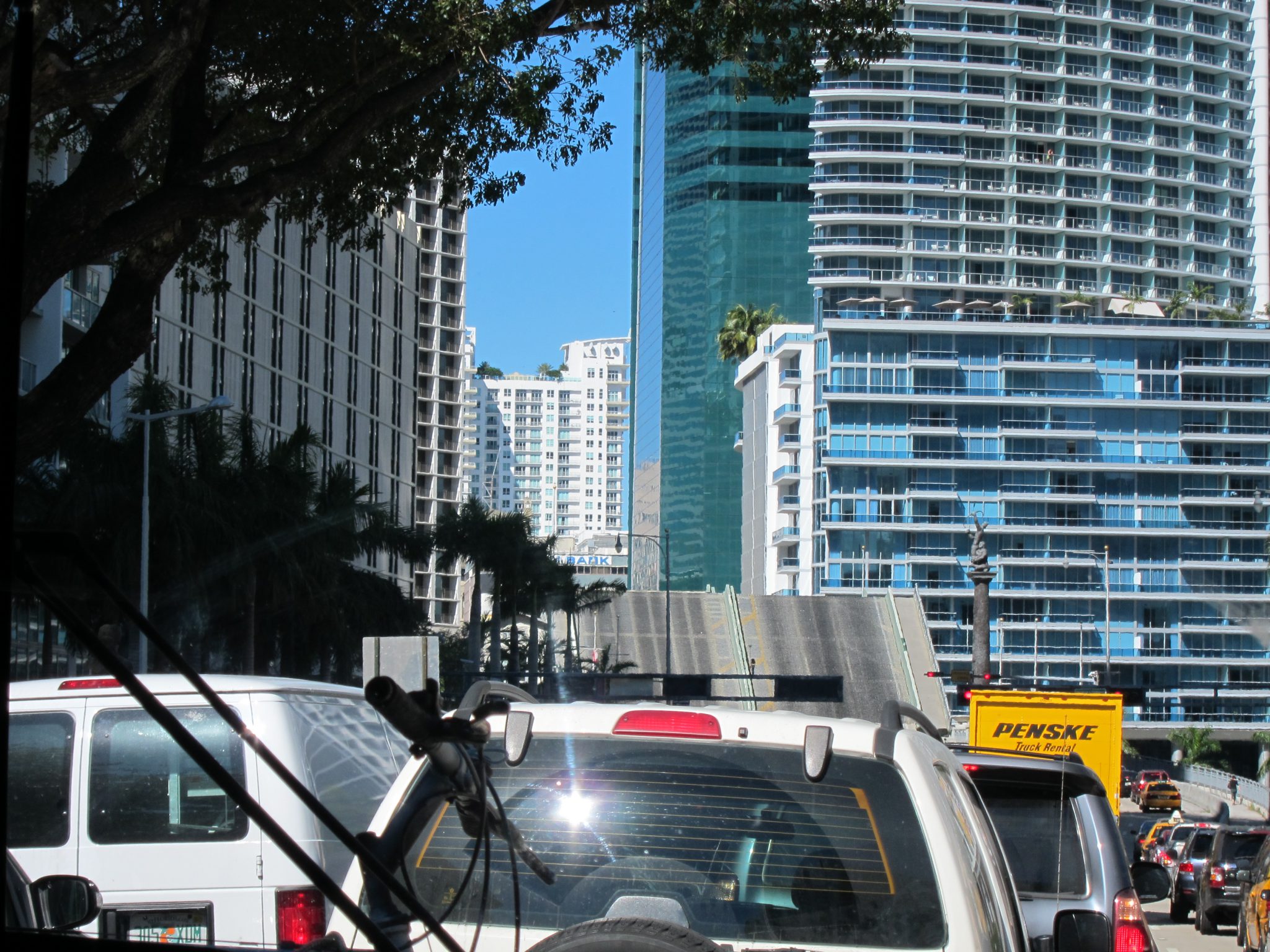 Pēc nepilnas stundas esam nonākuši centrā un mūs uz brīdi apstādina Brikelas tilta pacelšana. Iedomājoties skatu, kā tilta lūzuma vietā pirms pāris mēnešiem cenšas noturēties baltais plušķis, un to, nevarēdams, ieveļas ūdenī, mazliet nodrebu. Esmu no sirds pateicīga Džima draugam, kas redzot šo situāciju, nepalika vienaldzīgs un izglāba Brikelu. Braucu garām arī savai pirmajai mājvietai un man šķiet sireāli, ka mitinājos te pirms pāris dienām.