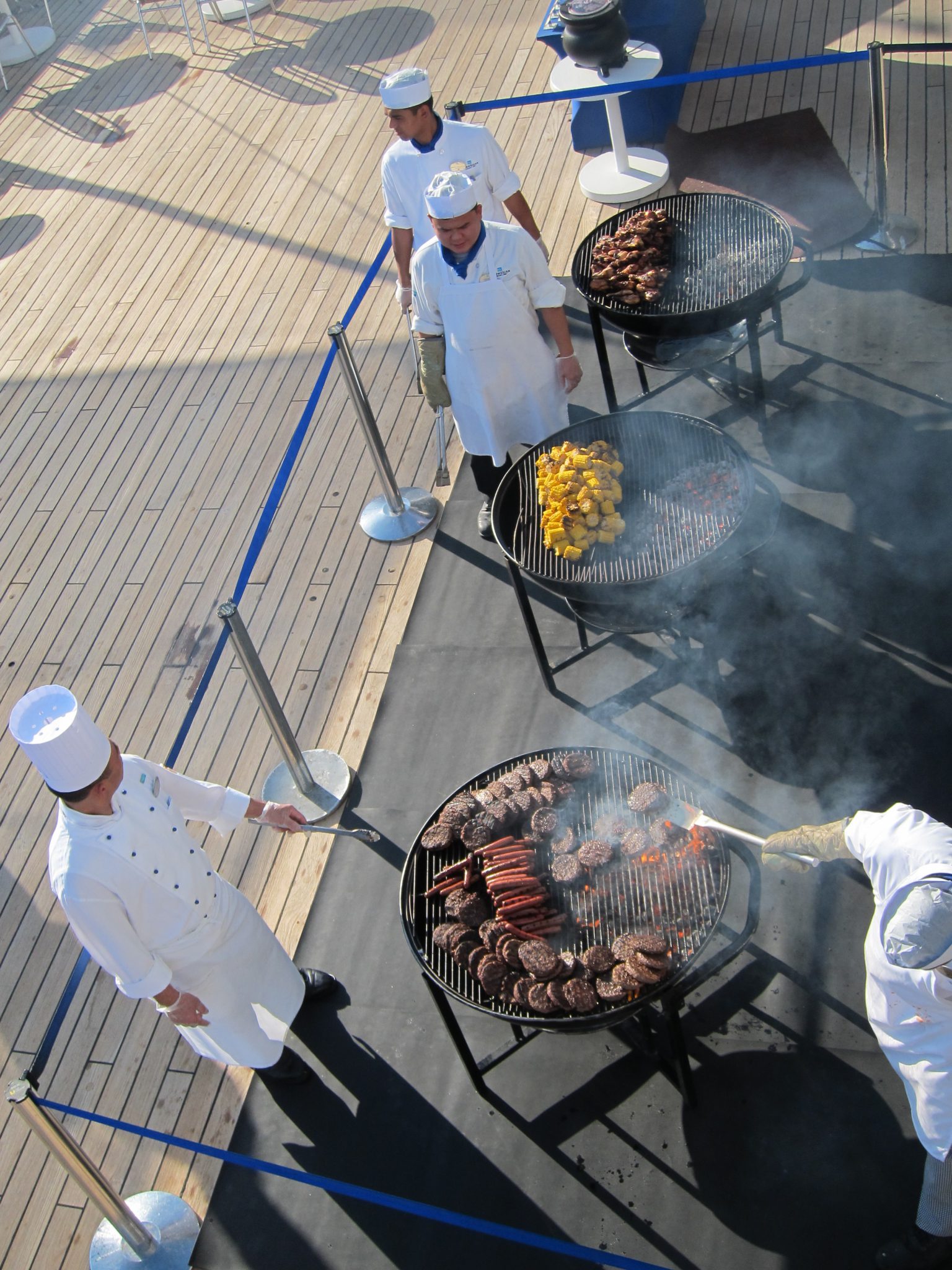 Tad nāsis sakņudina gardo ēdienu smarža un dodos novērtēt piedāvājumu. Saldējuma bārs, augļu bārs, otrie, wok, zupas, salāti, saldie utt. utt. – ēdienu klāsts ir tik plašs, ka visu pat nav iespējams nogaršot. Paņemu pa bišķiņam no vairākiem ēdieniem un ieturu gardu maltīti. Tikmēr aiz borta vērojams saulriets un visi steidz fotografēties uz rietošās saules un tālumā samanāmā Mimai fona. Netālu no manis sēž ģimene no Francijas – viens jaunākas pāris un viens vecāks, ka arī divi bērni – puika un meitene. Izskatās, ka abiem bērniem kas kaiš, viņi īsti nevar paiet, arī citas kustības ir traucētas. Bet viņi smejas, samīļo savus vecākus (?) un vispār visi kopā izskatās ļoti laimīgi. Iespējams, ka tur ir daudz ciešanu arī, bet to neredz, viņi ir tik cilvēciski skaisti.