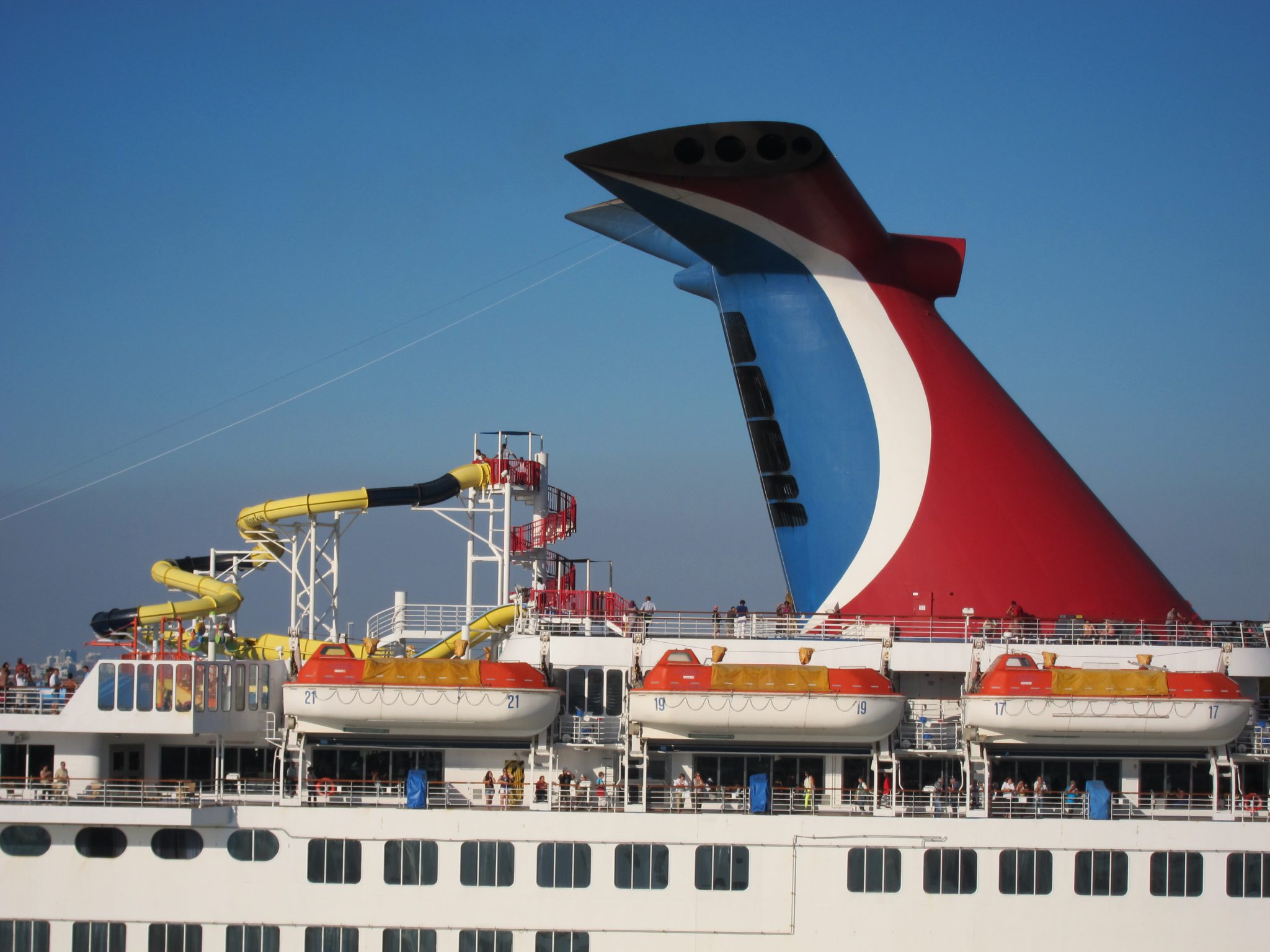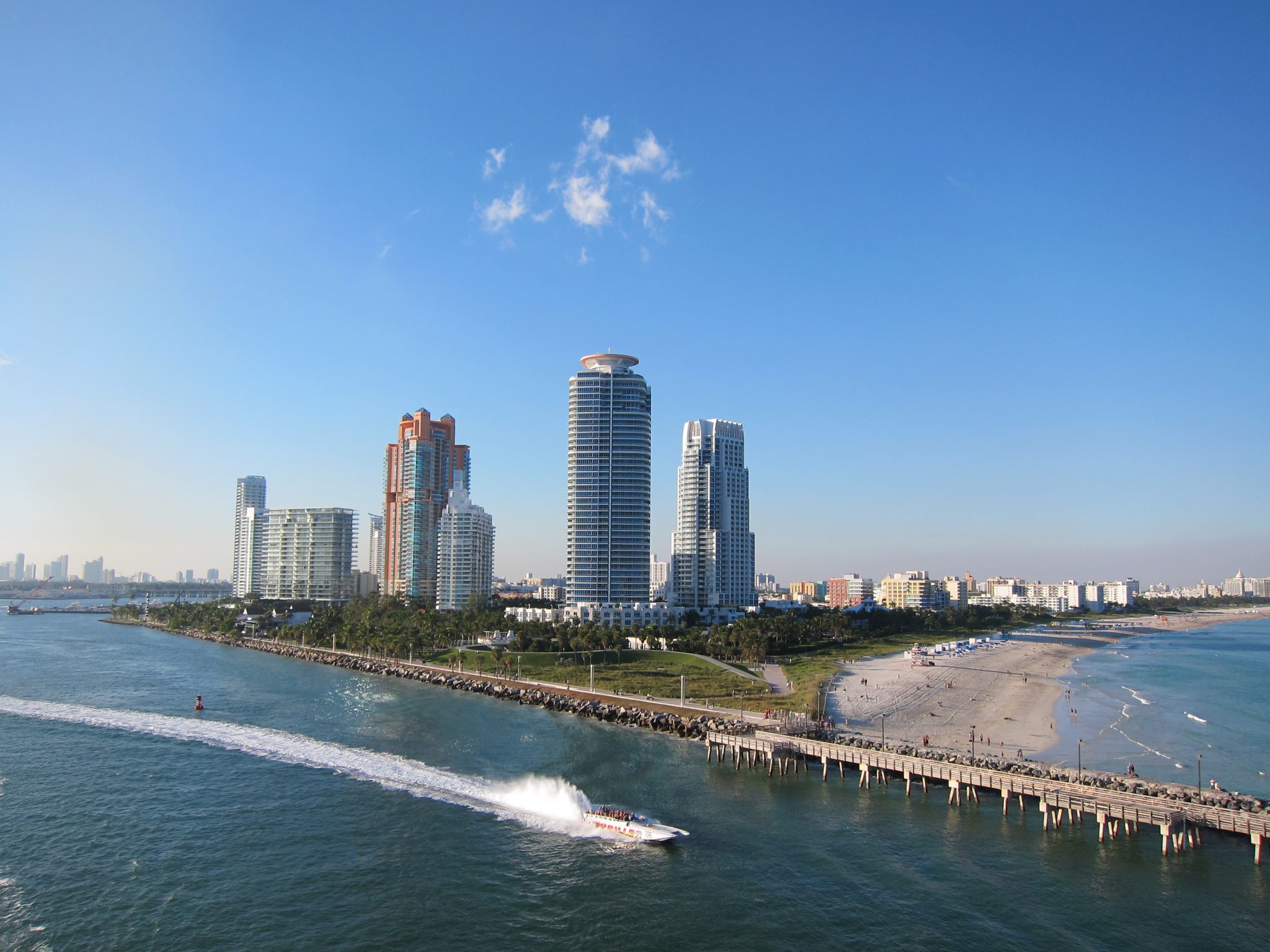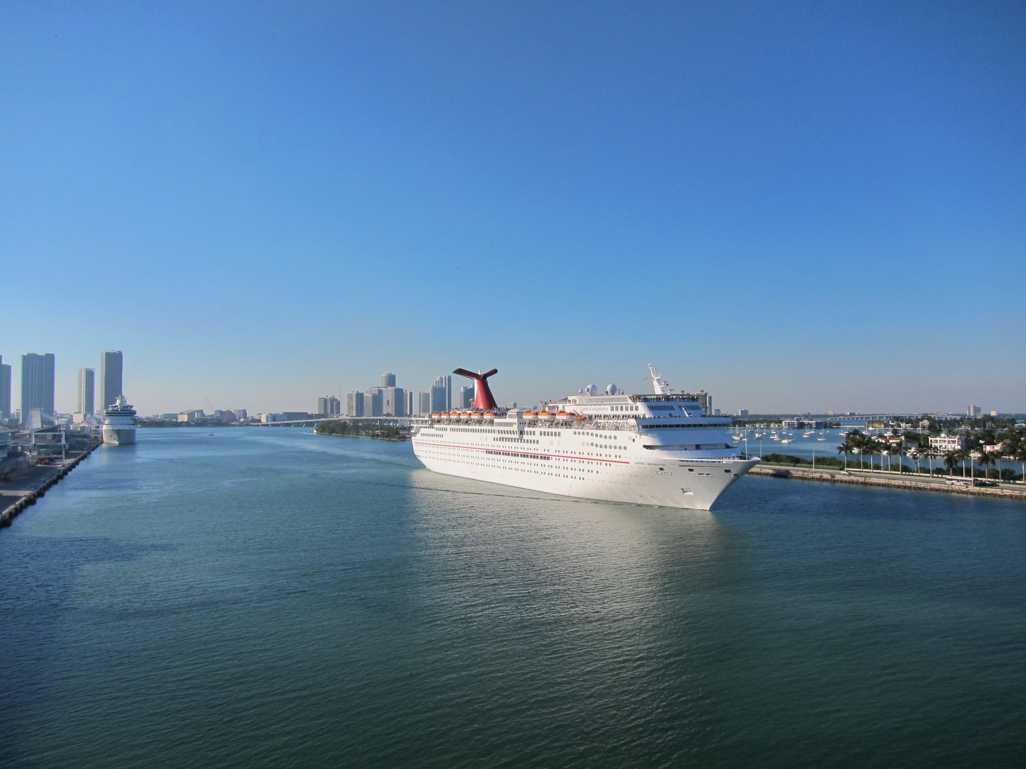 Izmetu nelielu lociņu pa augšējiem klājiem un paspēju piefiksēt tur esošos baseinus, džakuzi, un basketbola laukumu. Piebāzējos kuģa pakaļgalā pie maza galdiņa un vēroju kuģa izbraukšanas procesu. Kuģis ilgāku laiku brauc gar MacArthur Couseway, kuru mērojot kājām, biju redzējusi jūrā iebraucam kruīza kuģus. Drīz jau esam pie South Beach un vēroju kā attālinās pludmale un pazīstamie Maiami debesskāpji.