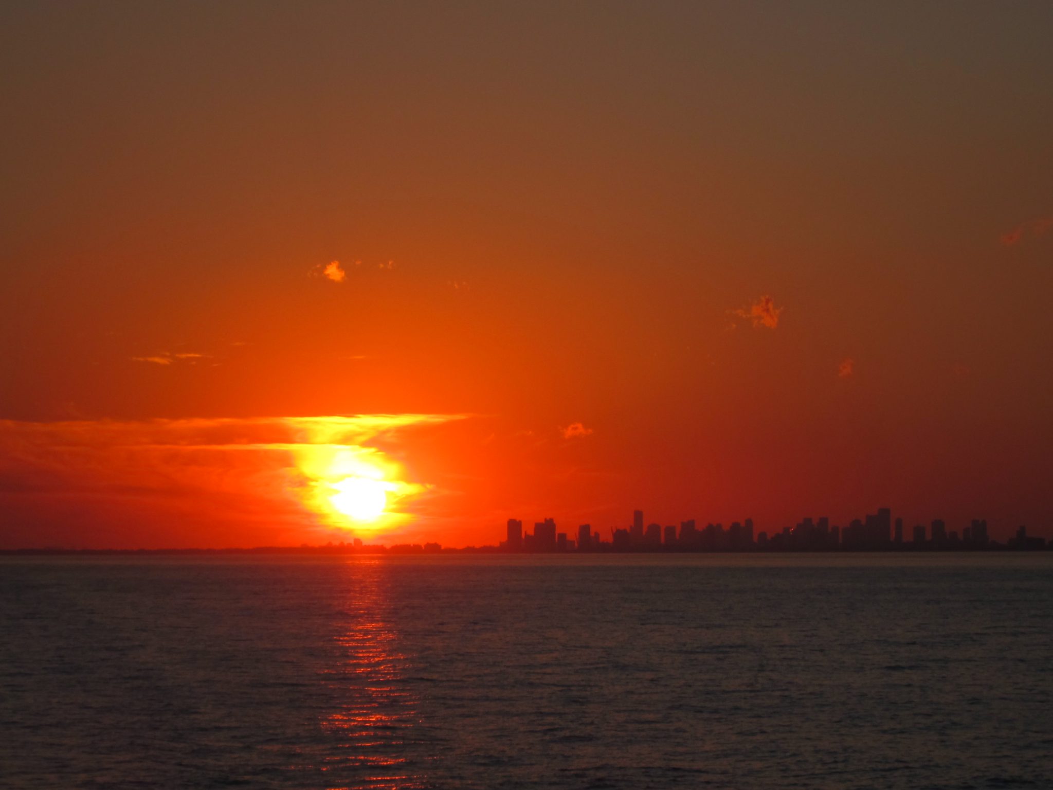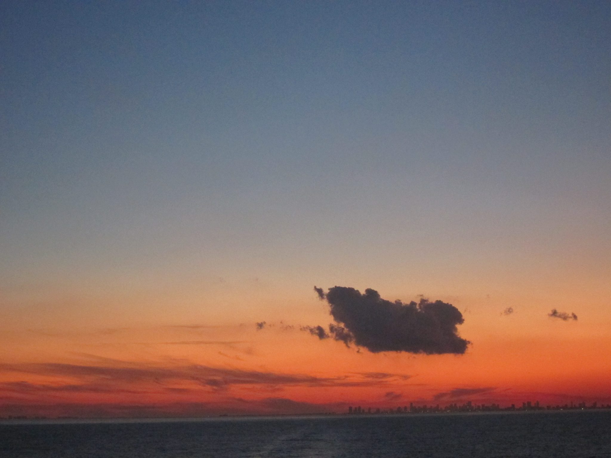 Kad saule norietējusi, vairums tautas pazūd kuģa iekštelpās un es mierīgi varu piesēst pie sava iepriekšējā galdiņa un noskatīties izrādi līdz galam. Tā turpinās vēl kādu stundu. Debesis kļūst te tumšākas, te gaišākas. Brīžiem vadošais ir sarkanais tonis, tad dzeltenais, tad purpura. Viens tumšs mākonis karājas gaisā virs Miami centra un saspēlējas ar dūmiem no kāda cita kruīza kuģa. Izrādes muzikālo fonu nodrošina pamatā albumi Viegli un Vēl viena klusā daba. Atkal piezogas tādas Titāniskas sajūtas, šoreiz tās šarmantās. Netālu redzu pārīšus mijam skūpstus un glāstus. Es novelku zandales un uzstutēju plikās kājas pāri reliņiem un ļauju vējam darīt visu, ko viņš vēlas – ar kājām, matiem un pārējo.