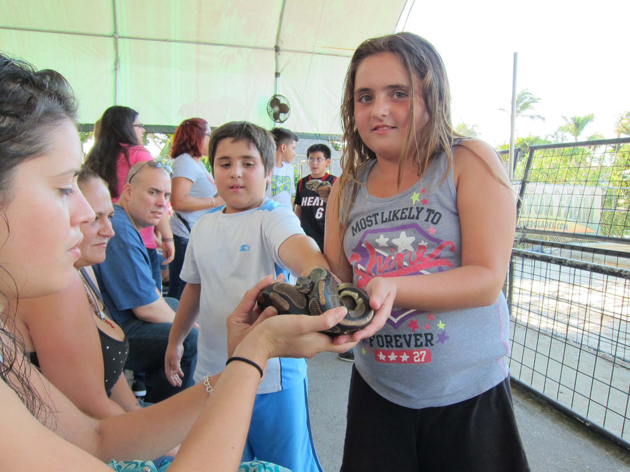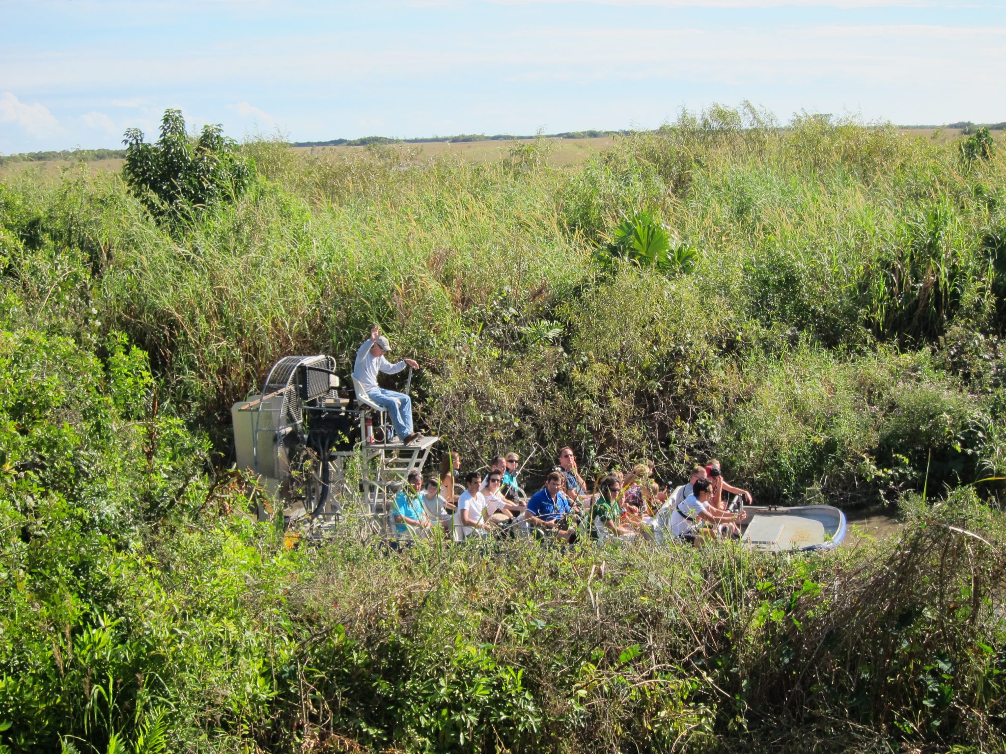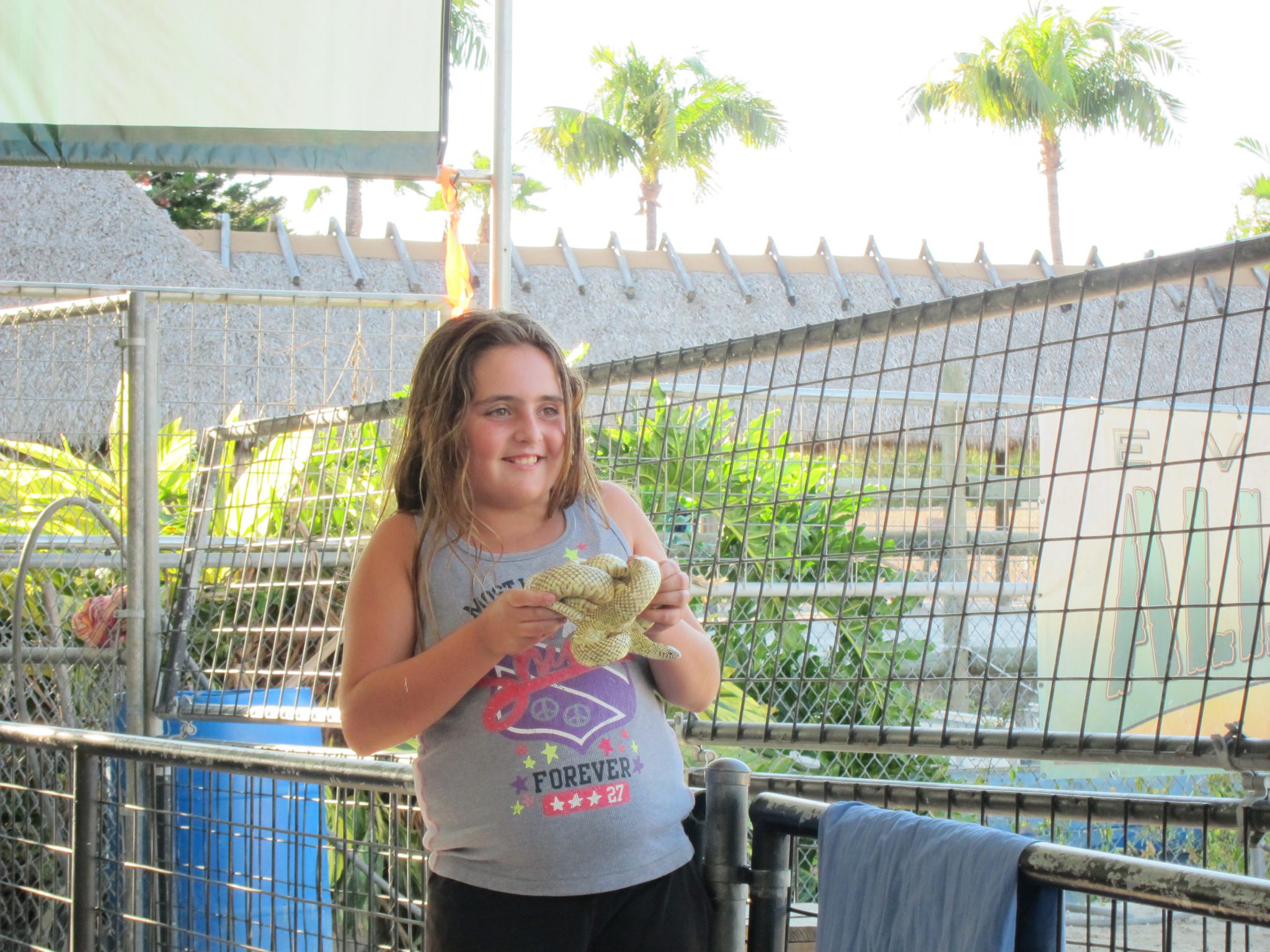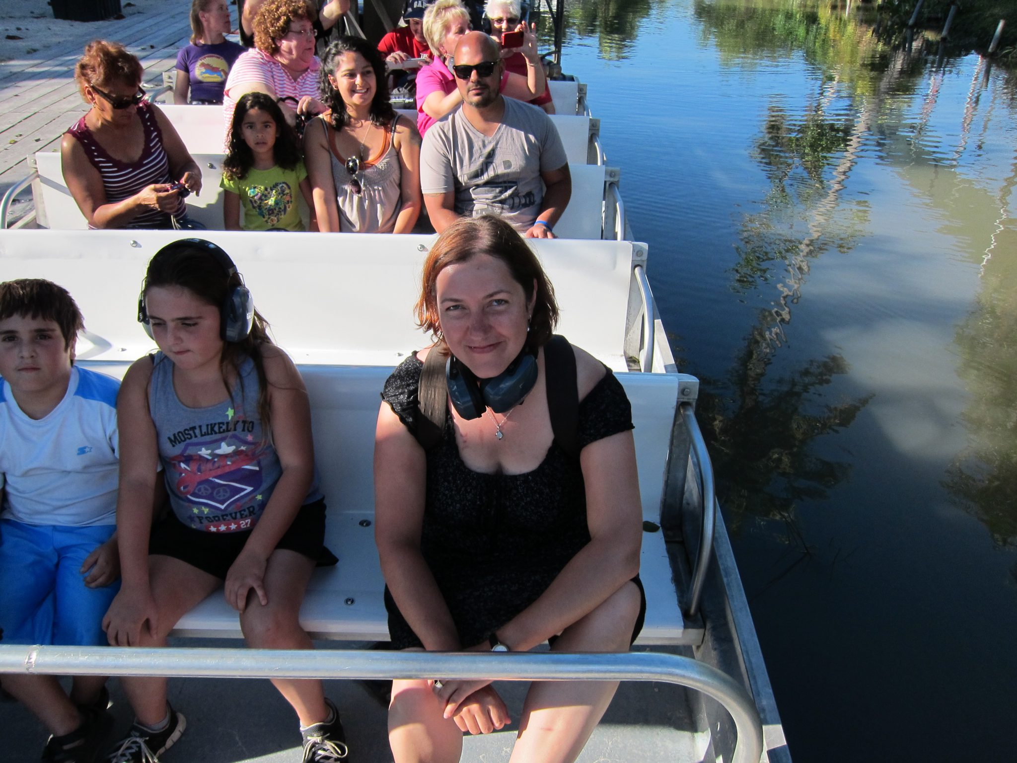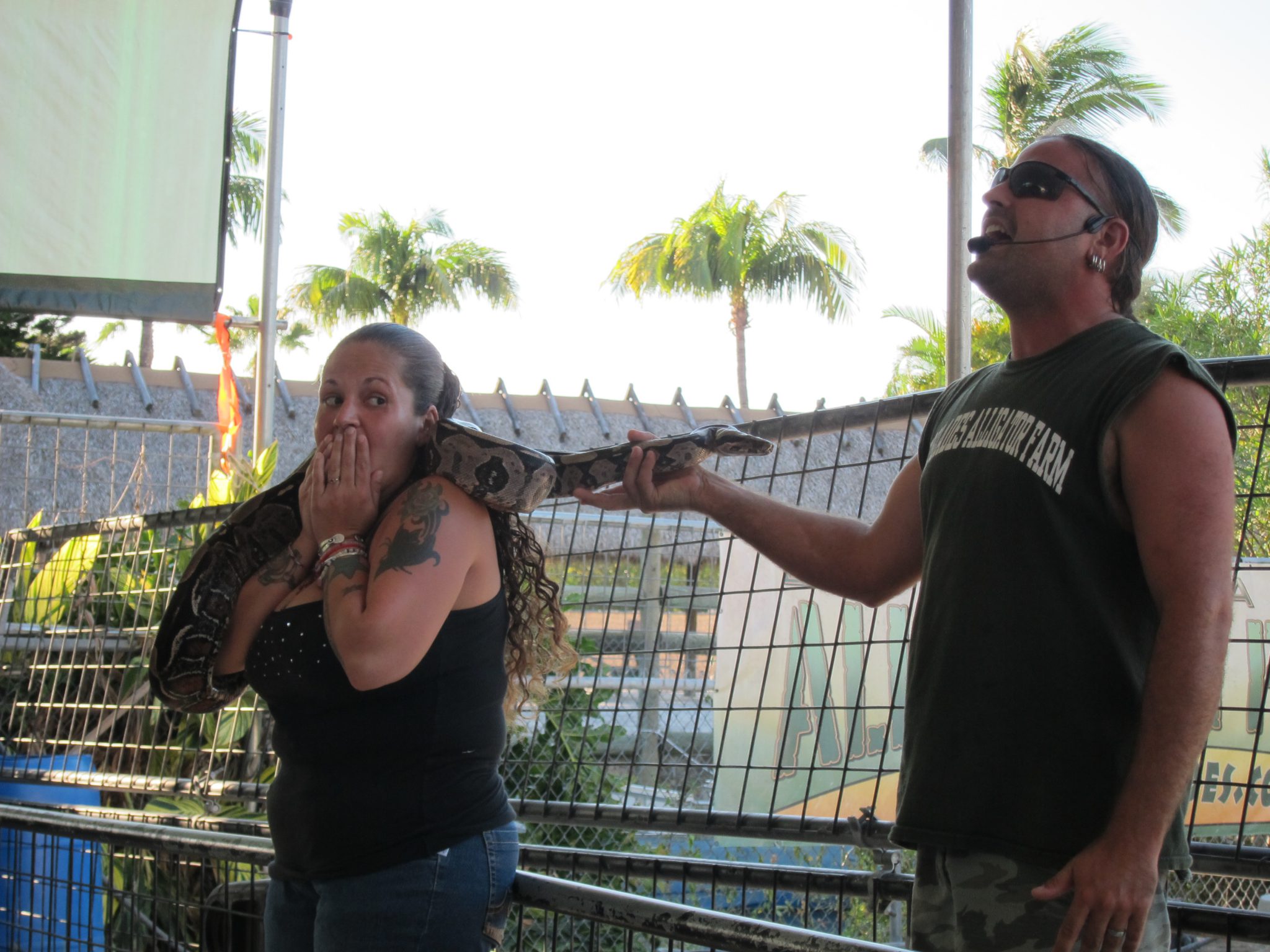 Pēc tam dodos uz otru “must do” atrakciju – izbraucienu ar Air boat, kā es to smejoties saucu, Horācija laivu. Vairākas reizes saņemam brīdinājumus, ka pēc brauciena būsim slapji, īpaši pirmās rindas. Tomēr tieši tur es nosēžos kopā ar pāris bērniem. Laivas stūrmanis piedāvājas mani nofočēt pirms un pēc brauciena. Sākumā lēnām dudinām pa aizaugušu upi. Ir mazliet jocīgi redzēt blakus peldam krokodilus un pieredzēt situāciju, ka starp jums nav sēta. Tad tiekam brīvajos ūdeņos, visi tiek aicināti uzlikt troksni slāpējošas austiņas un laiva uzņem ātrumu. Mes traucamies brīžiem pa ūdeni, brīžiem pa zāli, ir tieši tik forši, kā biju to iedomājusies. Vietām vadītājs sagriež laivu piruetē un tad mums tiek mazliet ūdens. Es varētu tā braukt stundām, bet mēs stūrējam atpakaļ pārāk ātri. Kad esam atkal lēnajā režīmā, šoferīts vaicā mums kā paticis. Es pagriežos pret viņu un paziņoju, ka mēs diemžēl neesam slapji kā bija solīts. Uz to blakus sēdošā meitenīte velta man frāzi “You rock!”. Pēc izbrauciena sākas čūsku šovs un kāds brīvprātīgais tiek aicināts izvilkt čūsku no maisa. Piesakās mana pirmītējā blakussēdētāja un godam paveic uzdevumu. Tad viņas mammai savukārt ap kaklu tiek aplikts jau krietni lielāks eksemplārs, šī neizskatās laimīga. Man šodien nav noskaņojams īpaši mīļoties ar čūskām un mazliet noglāstījusi vienas maigo ādu, dodos prom.