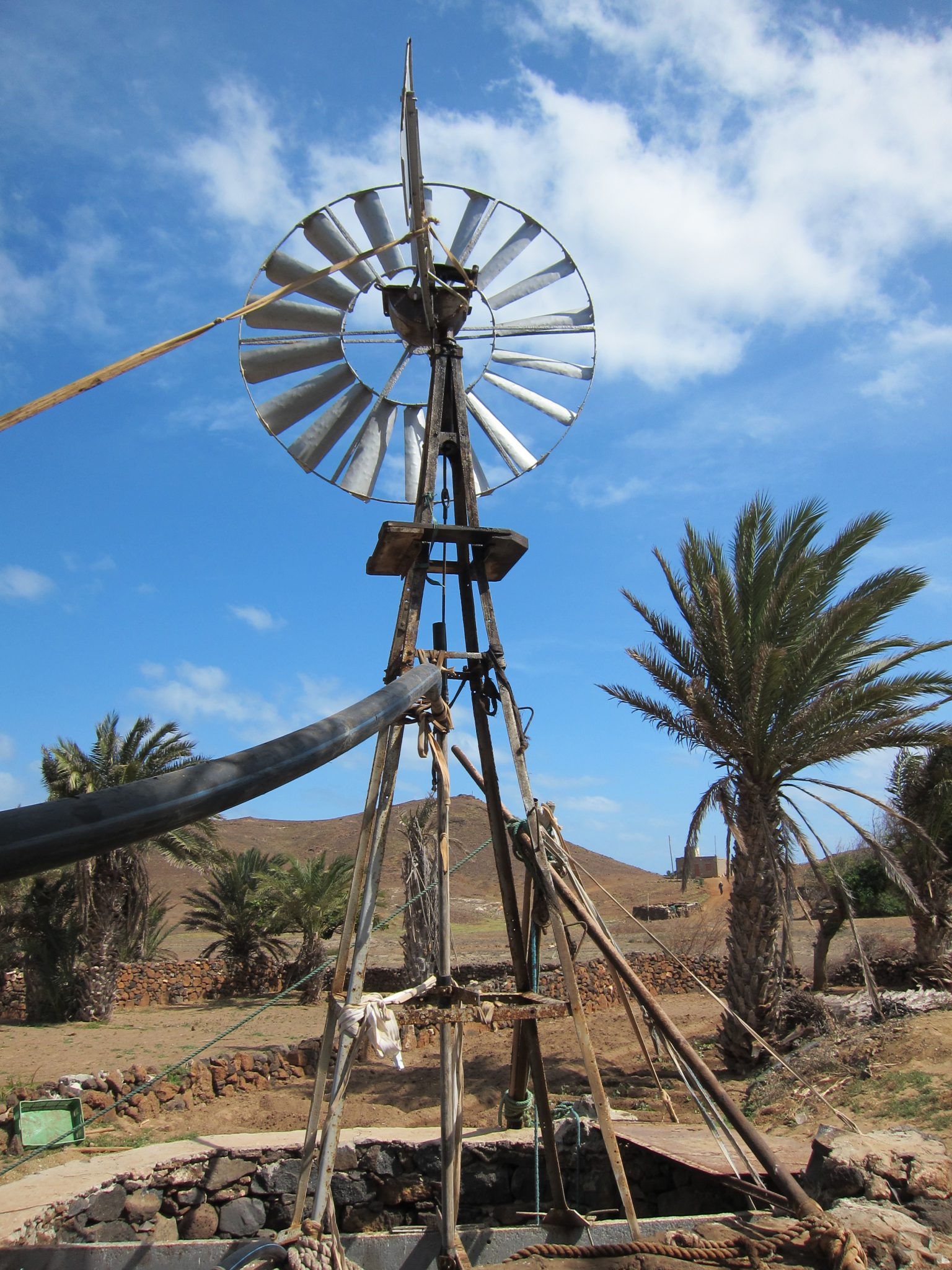 Brīdi papriecājušies par okeānu un salīdzinoši mežonīgo apkaimi, dodamies atpakaļ. Šeit ir populāri vēja, hmm… ģeneratori, dzirnavas – pat nezinu kā pareizi lai dēvē šīs ierīces (skat. bildes). Ivo man skaidro to darbības principu, es uzdodu tik daudz (droši vien nesakarīgu) jautājumu, ka viņš saka, lai vienkārši piebraucam pie viena no tiem. Tā arī darām. Aplūkojam gan pašu ietaisi, gan aku ar ūdeni dziļumā, gan trubu sistēmu pa kurām vējš palīdz tikt ūdenim augšup. Uzsūknēts ūdens tiek uzkrāts lielos rezervāros un izmantots augu laistīšanai un citām saimniecības vajadzībām.