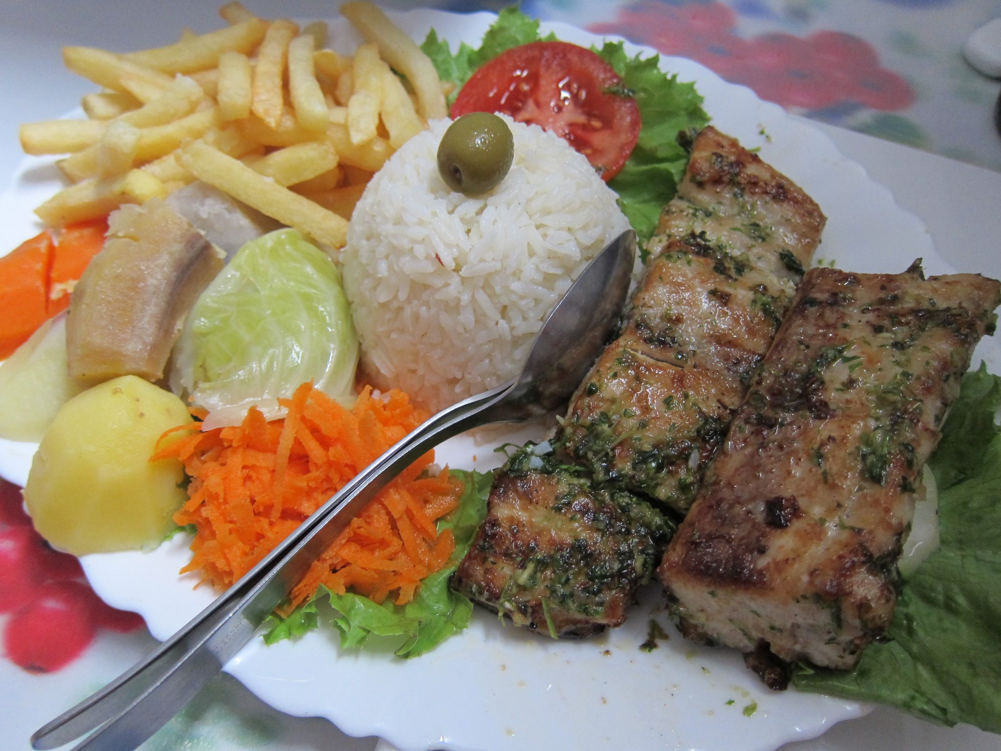 Iebraucam paēst pusdienas kādā nelielā pilsētiņā, tās kā vienmēr ir izcili garšīgas. Tomēr ēdiena pagatavošana un notiesāšana prasījusi vairāk laika kā plānots un, paskatījies pulkstenī, Ivo paziņo, ka tālāk viņš sēdēs pie stūres. Manis pēc. Tad nu traucamies ap 100 km/h lidostas virzienā. Ne tikai man jāpaspēj uz lidmašīnu, arī Ivo jāpaspēj nodod mašīna un tikt uz prāmja, kas ved atpakaļ uz viņa dzimto salu Santo Antao.
