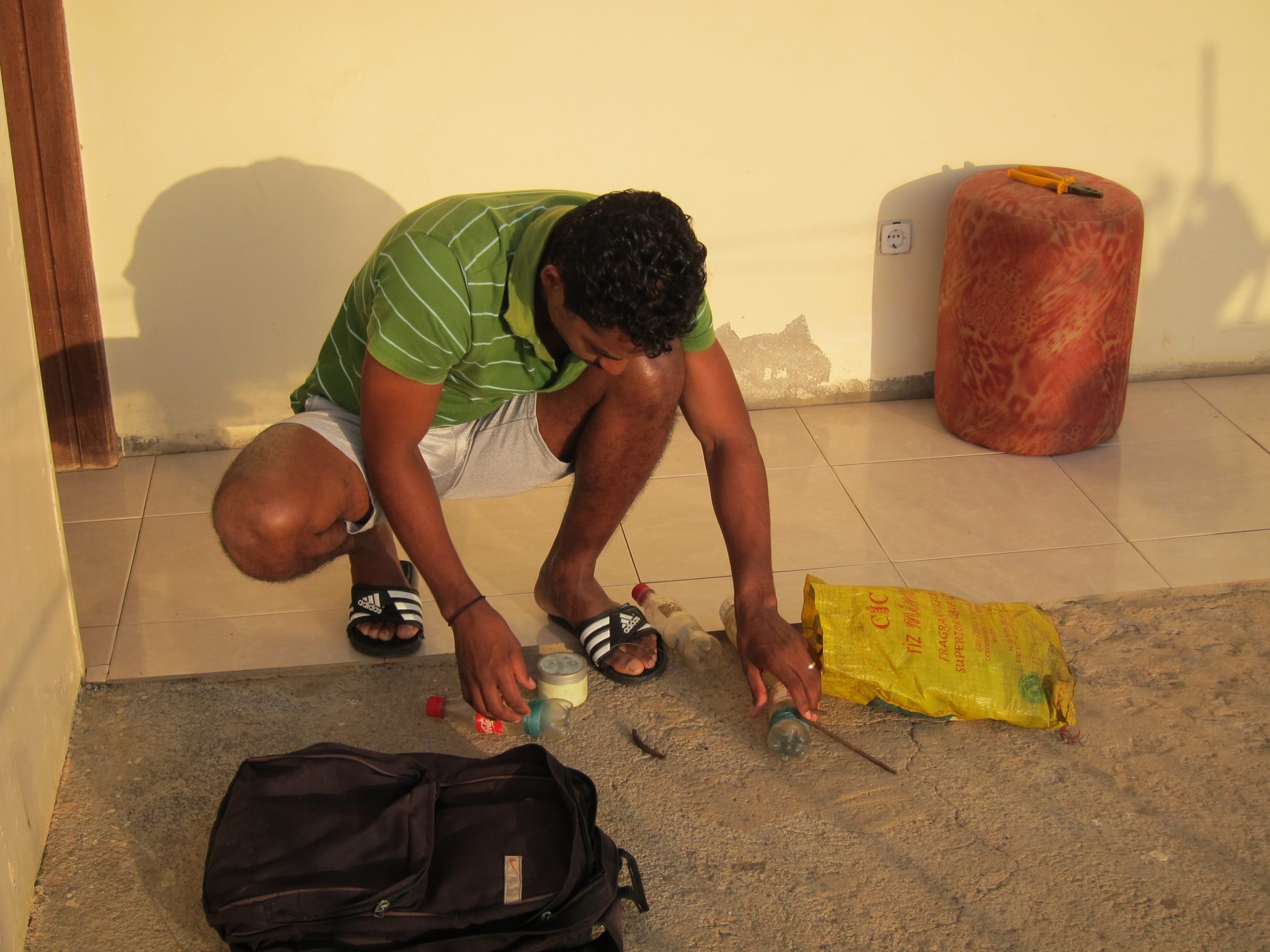 Es sakrāmeju koferi un tad skatos kā Emanels sariktē zvejas rīkus – puslitrīgās plastmasas coca-cola pudelītes, uz kurām uztītas makšķerauklas ar āķiem galos. Iemetam vēl somā pāris banānus brokastīm un dodamies ceļā. Man, protams, galvā dzīvo jautājums par zivju ēsmu, tomēr esmu nolēmusi būt pacietīga un saņemt šo un vēl citas ar zveju saistītas atbildes, kad pienāks laiks tās uzzināt.