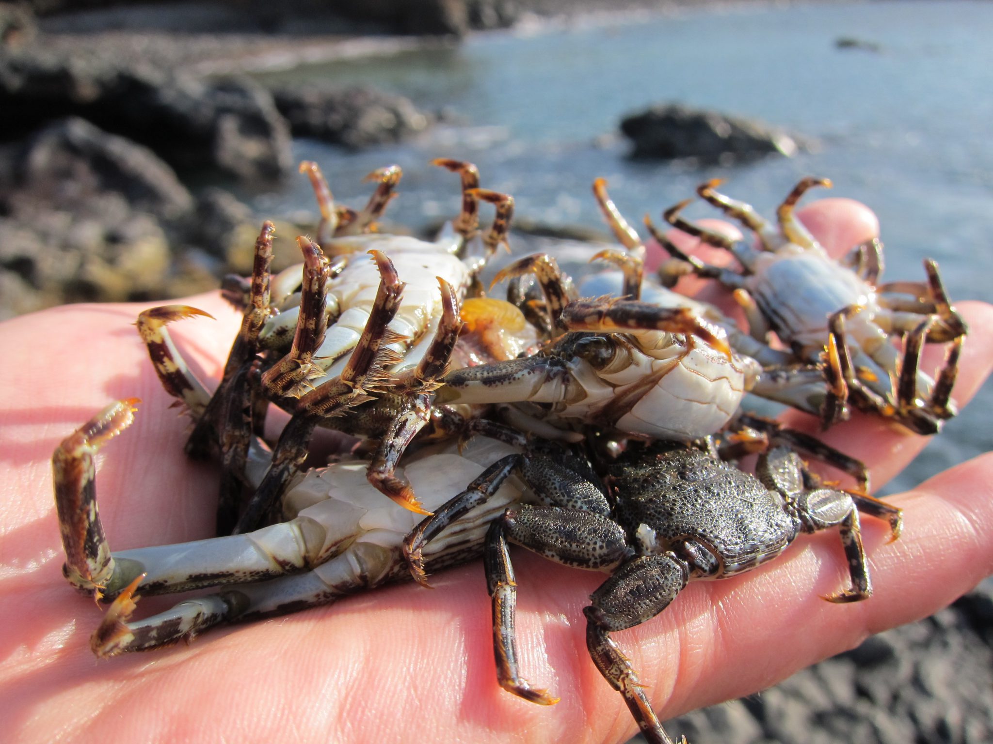 Tikmēr Emanels saķēris veselu sauju un sauc mani, lai paņemu tos, lai būtu vieglāk ķert jaunus. Mazliet bailīgi turu saujā krabju ķermenīšus un drusku jau ir žēl radības, kas tikko vēl naski rāpoja pa klintīm un tagad kalpos kā ēsma, lai izvilinātu no dzelmes un nobeigtu vēl citas, lielākas radības. Tomēr ilgi filozofēt man neiznāk, jo Emanuels met treknu krabi manā virzienā. Paņemu to un iespiedzos.