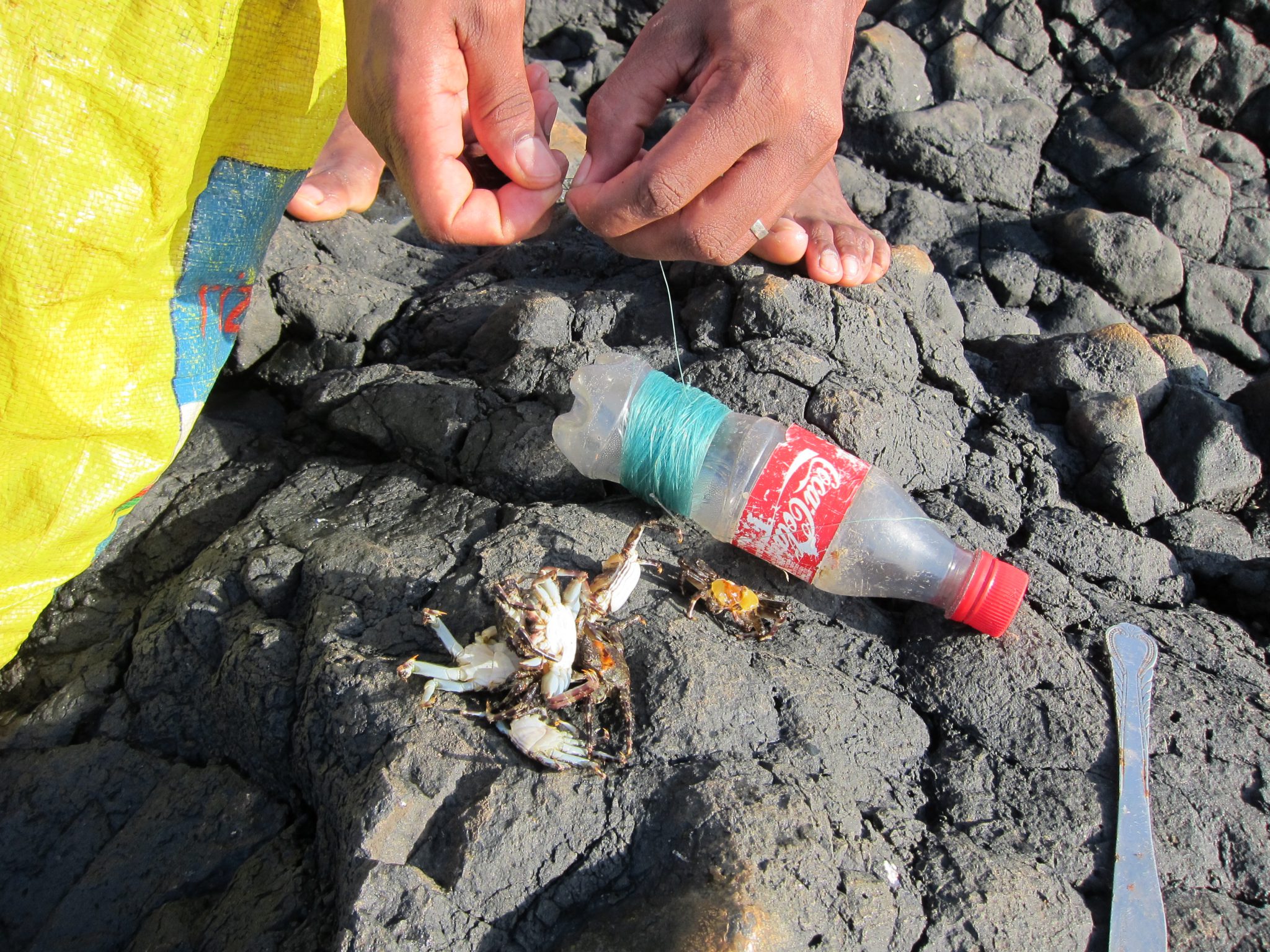 Sākumā Emanuels sagatavo makšķeres, piesiedams netālu no āķiem armatūras stienīti – tas kalpos kā svins, lai auklu varētu iemest pēc iespējas tālāk okeānā. Tad Emanules sāk lodāt gar klints malām. Pat noguļas, pārkāries ar pus ķermeni pār klinti, un uzmanīgi pēta ūdens malu. Nekā. Izrādās – viņš meklē krabīšus ēsmai un tie, it kā nojauzdami nelabo likteni, visi aizdevušies prom. Emanuels aiziet meklēt krabjus gabaliņu tālāk, tikmēr es sēžu un pētu kādu jau sen galu dabūjušu, izžuvuši krabīti. Joka pēc aizeju līdz klints malai uz pamanu arī dzīvu krabi. Tomēr arī viņš pamana mani un nozūd, pirms es vispār paspēju apdomāt, no kura gala šis būtu ķerams.