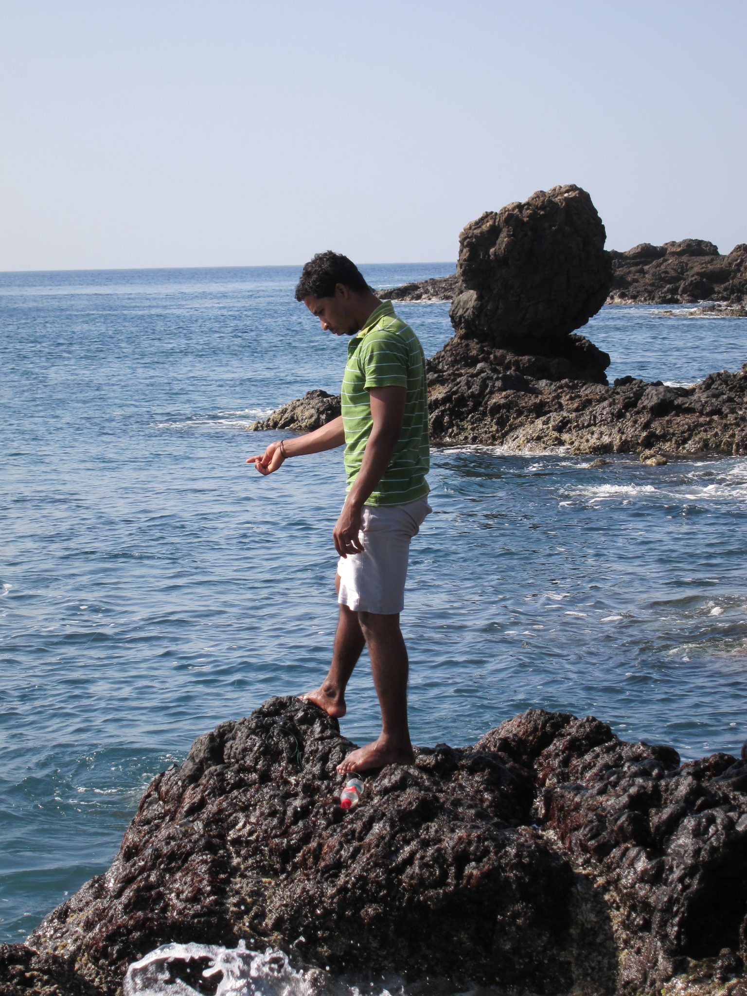 Piestājam netālu no okeāna būvlaukuma malā. Emanuels aiziet līdz celtniekiem un atgriežas ar sauju armatūras stienīšu. Es atkal apvaldu ziņkārību un neko nejautāju. Nokāpuši lejā no kalna, nonākam pludmalītē, kas nosēta ar tukšām plastmasas pudelēm, nav diez ko jauks skats. Tomēr man par prieku mēs nepaliekam šeit, bet lavāmies pa klintīm tālāk. Vienā vietā jāsagaida brīdis, kad vilnis atkāpjas un ātri jāsprūk klints otrā pusē. Tas man izdodas veiksmīgi, tāpat arī pārējā lodāšana pa klinšu radzēm.