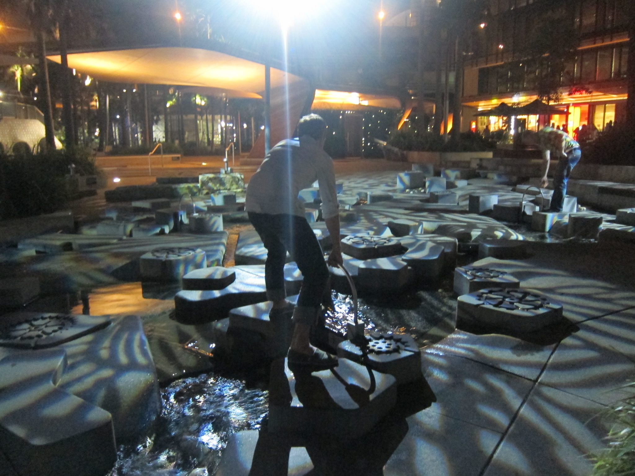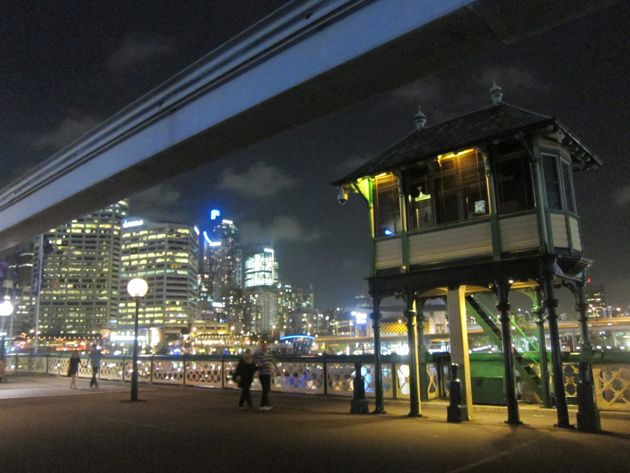 Tāpēc ir vajadzīgi vietējie. Es neapgalvoju, ka pati neatrastu šīs vietas, bet kopā ar zinātāju tas vienkārši notiek ātrāk un efektīvāk. Izejam caur restaurētu galeriju, kas bijis senais tirgus. To teju nojaukuši, bet tomēr prātīgi ļautiņi izdomājuši atjaunot veco ēku, kas ir izcili skaista. Aizejam līdz Darling harbour, pārejam pāri tiltam, kurš ik pa laikam tiek atvienots, lai dotu ceļu kuģiem. Bet tas nav paceļamais tilts, kā ierasts redzēt. Tilta daļas atbīdās uz sāniem, ieskaitot lielu sliedi, jo pār šo tiltu iet arī vilcienveidīgs braucamais. Izejam caur kolosālu “spēļu laukumu”. Tas būvēts, izmantojot fizikas likumus, un visas paaudzes var izmēģināt darbības ar ūdeni, pārliecinoties, ka fizikas likumi strādā joprojām. Piemēram, pagriezt Arhimeda ūdens pumpi.