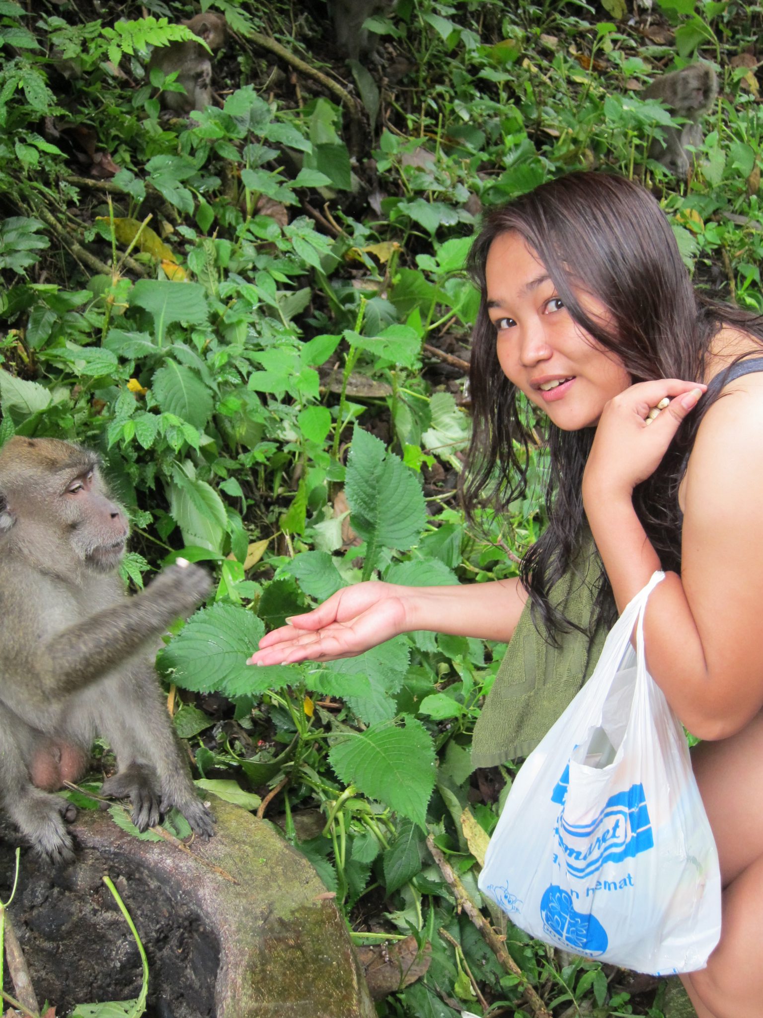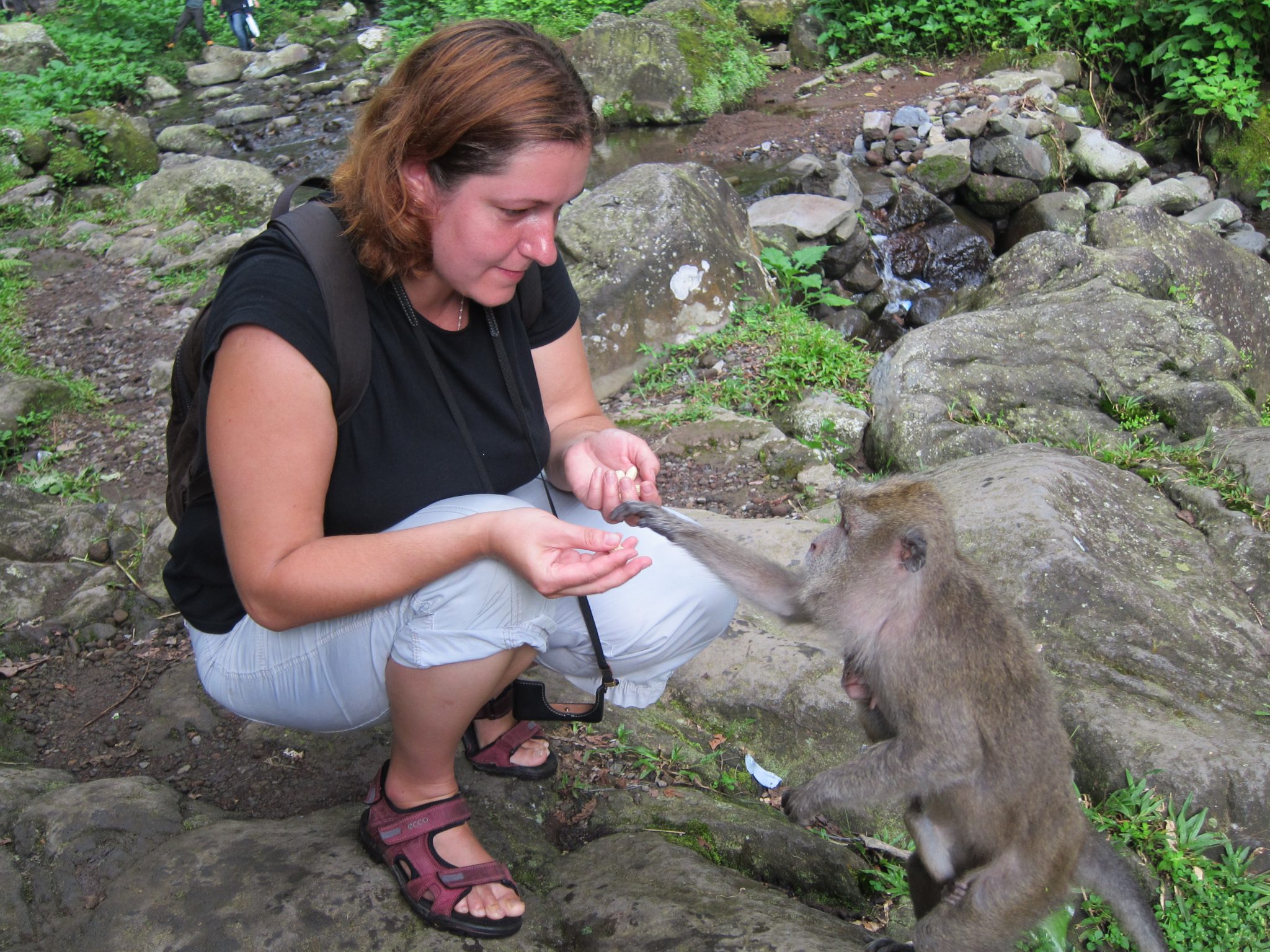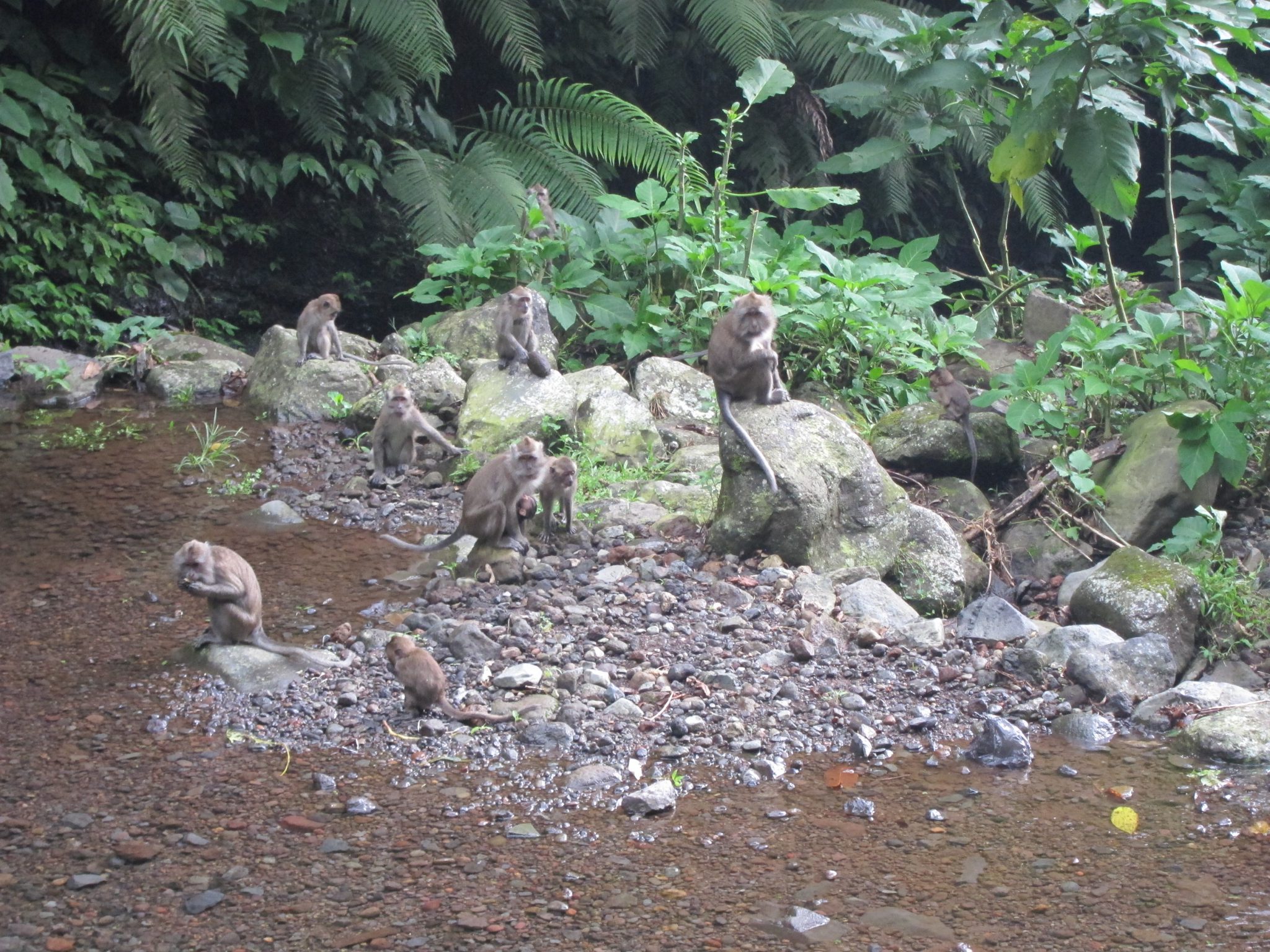 Pagājušies augstāk kalnos, sastopam mērkaķu baru. Tieši viņus arī meklējam, mums līdzi ir zemesrieksti, lai draudzētos ar zvēruļiem. Ēd no rokas. Labu laiciņu pavadām ķerot kadrus un barojot kustīgos radījumus. Brīdī, kad barvedis sāk kļūt nejauks, nolemjam, ka gana esam socializējušies ar senčiem, un visi zūdam kokos – mērkaķi uz vienu pusi, mēs uz otru.