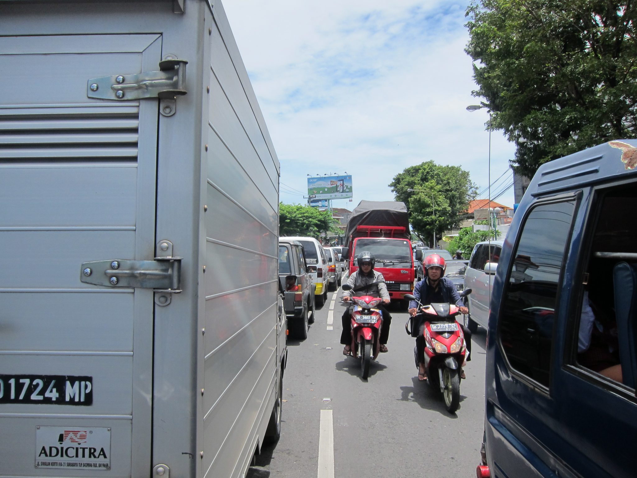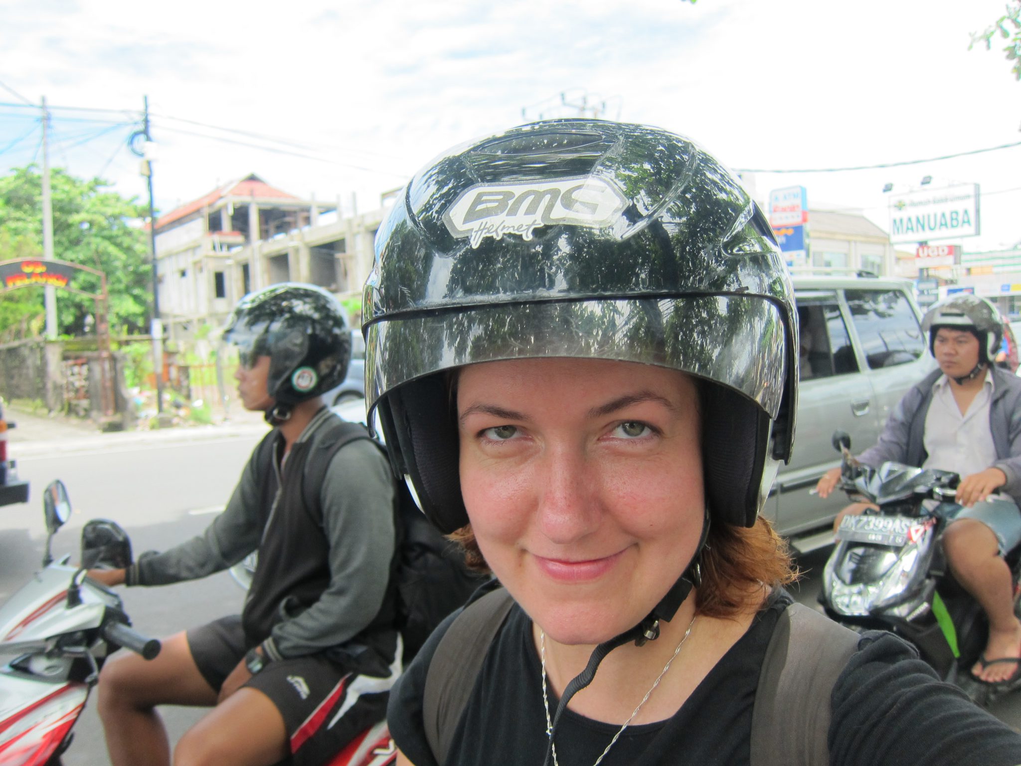 Sākumā ceļš ved caur apdzīvotiem reģioniem, apbrīnoju Rivfala prasmi izlavierēt caur blīvo satiksmi. Šitā tauta piedzimst uz motocikla. Jau priecājos, ka viņš ir pie stūres, nevis es. Tad ieliņas kļūst šaurākas un traucamies caur miestiem, kur katra trešā māja ir templis. Kad mājas pazūd un apkārt parādās vien rīsu lauki, es gavilēju. Jāatzīst, nu jau jūtos traki labi, ka nav jāstūrē un jālauza galvu par braukšanas virzienu. Es tik baudu apkaimi, fotografēju pa labi un pa kreisi, ik pa laikam aiz prieka uzsitot Rivfalam pa ķiveri. Vēl viņa ķiverē es iebūkšķinos ar savējo, kad tiek tā straujāk uzsākta braukšana vai piespiestas bremzes. Es daļēji piedalos arī motocikla vadībā. Redzot šķērsli vai bīstamu situāciju, saspiežu ciešāk Rivfala plecus (tā ir pusautomātiska reakcija), viņš pamatā uz to noreaģē, nometot gāzi. Visiem labi.