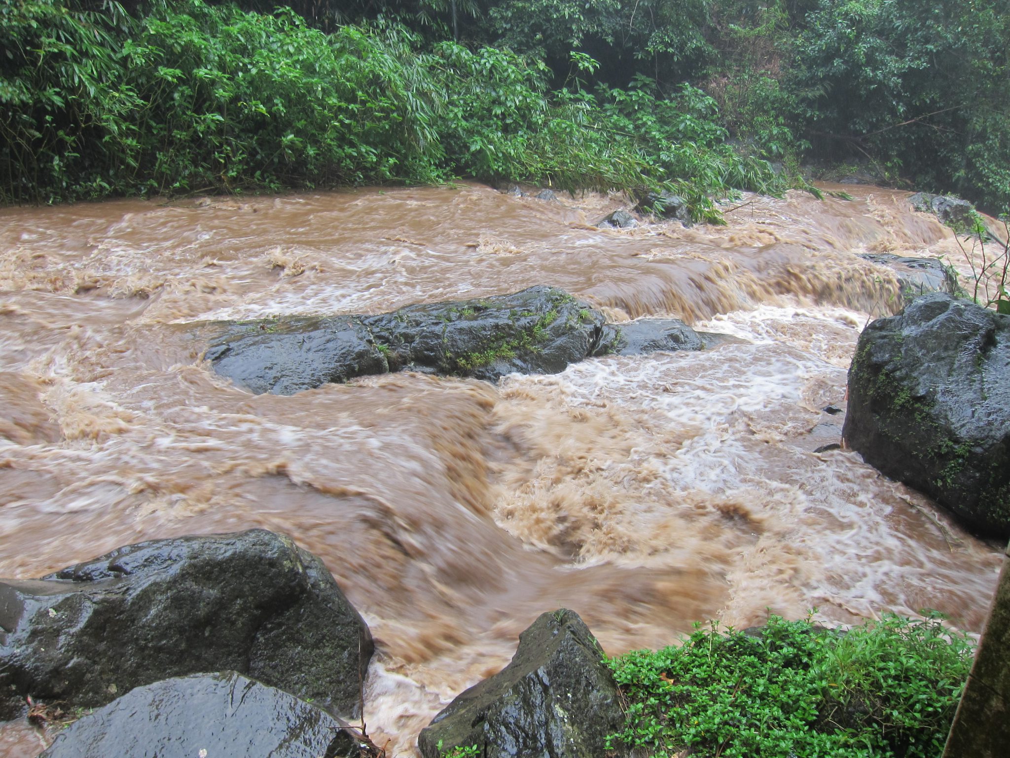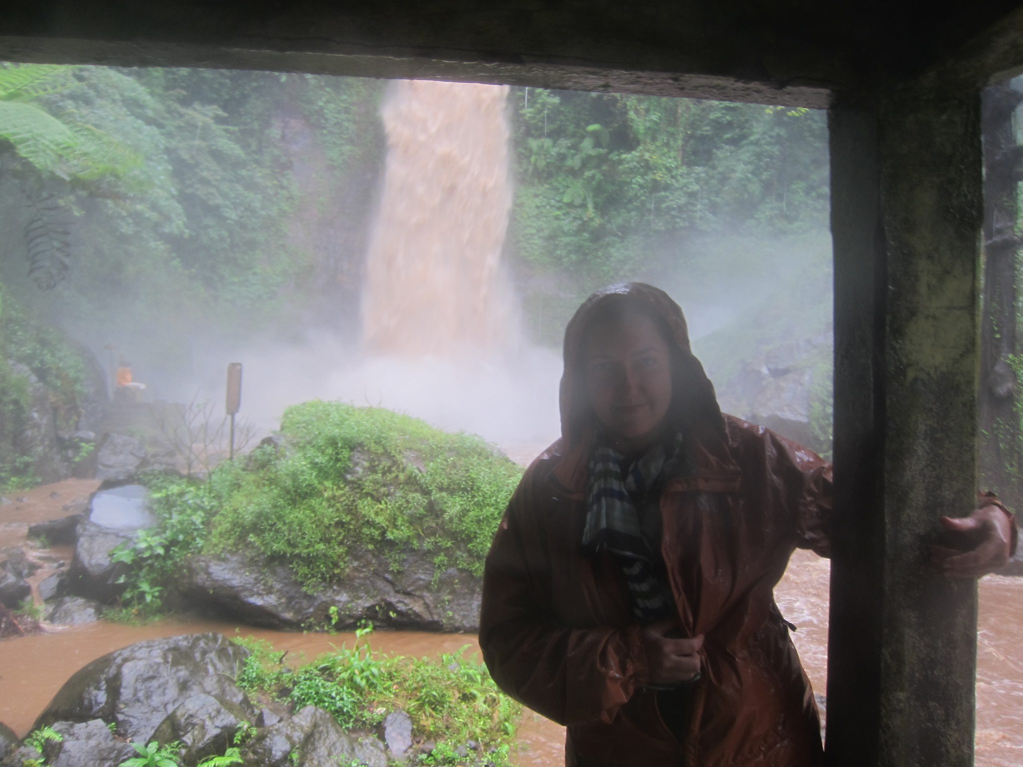 Esam atbraukuši līdz apskates objektam – ūdenskritumam. Pirms tam ieejam kafejnīcā iedzert karstu tēju un cerīgi gaidām, ka lietus piestās. Neizskatās, ka tas notiks šodien. Atstājam somu un ķiveres kafejnīcā, un brienam uz ūdenskritumu pa visu lietu. Īpaši nav ko zaudēt, esam gandrīz pilnībā slapji. Ūdenskritums ir varens. Parasti tas esot skaists, ainavisks pasākums, bet šodien pārvērties par mutuļojošu brūna ūdens straumi, kas ar milzu spēku triecas zemē. Tam nav iespējams pieiet tuvāk par metriem 30. Ar grūtībām uztapinu pāris slapjus kadrus un dodamies tālāk.