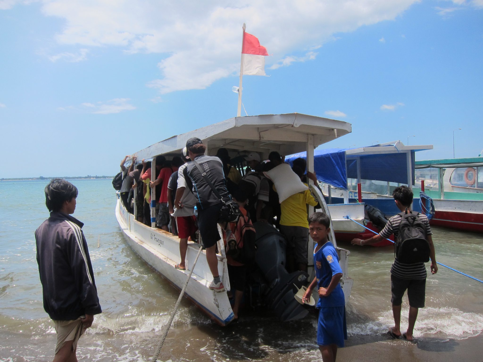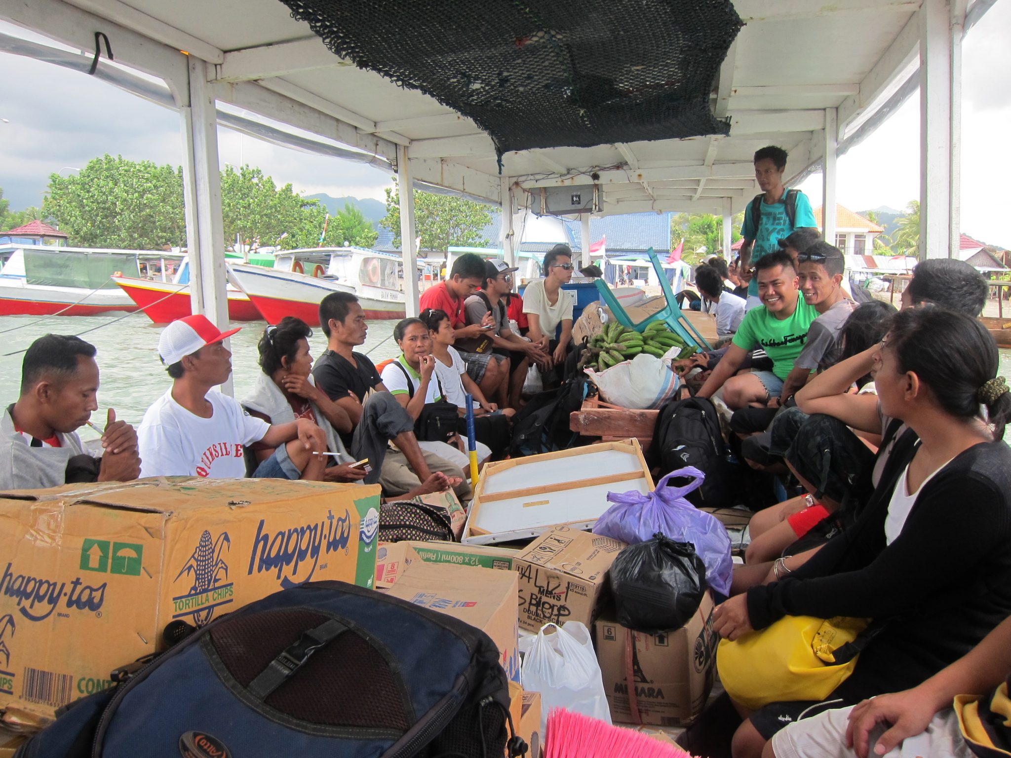 Kuģis jau ir piestājis un pasažieri brien uz to pa ūdeni. Atvairu visus kofera nest gribētājus un arī brienu uz laivu. Pie pašas laivas man kāds vīrs palīdz iecelt koferi laivā. Domāju, cik laipni, droši vien kāds no kuģa apkalpes. Iekāpju laivā un tad laipnais vīrs man prasa naudu. Par kofera pārvietošanu aptuveni 5 metrus. Saprotu, ka esmu nejauka pret iztālēm izslavētajiem laipnajiem indonēziešiem, bet veltu viņam frāzi: “Fcuk you”, paķeru savu koferi un pāri citiem pasažieriem, kastēm, groziem un banānu ķekariem, aizlaužos uz tukšo laivas priekšgalu.