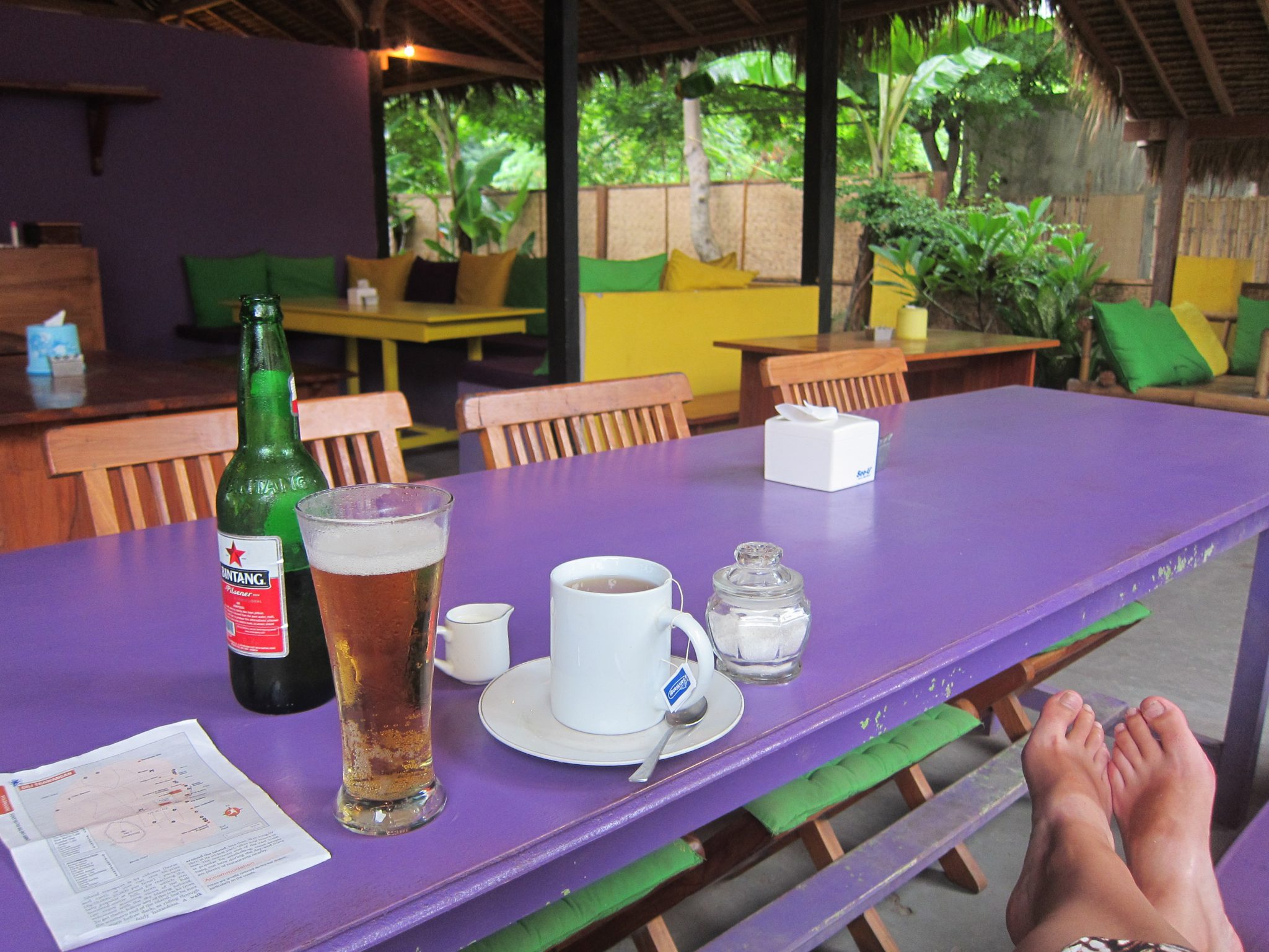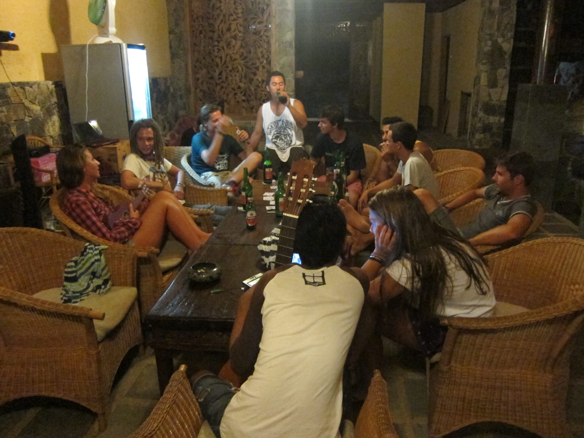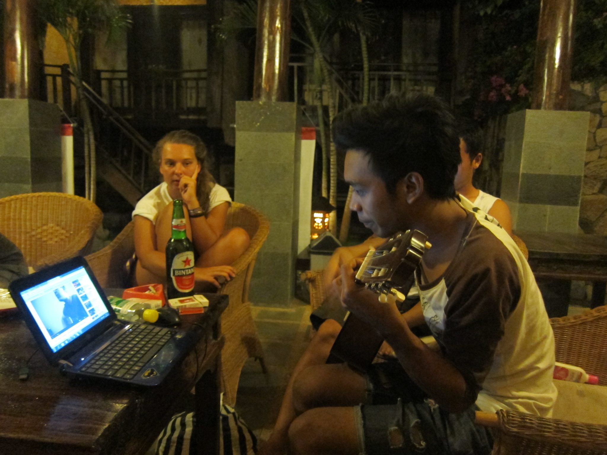 Dodos atpakaļ uz viesnīcu ar domu drīz iet gulēt. Man ir cēls mērķis no rīta piecelties tā agrāk un vēl izmest lociņu ar riteni pa salu, jo neesmu paguvusi to kārtīgi apskatīt. Esmu ceļā uz viesnīcu, kad visā miestā pazūd elektrība. Tas viņiem notiek visai regulāri. Ar mobilā lukturīti nonāku foajē un piesēžu pie pārējiem iemītniekiem, lai sagaidītu elektrības atjaunošanos. Kompānija ir jautra – kāda holandiešu meitene spēlē ģitāru un perfekti dzied, to pašu dara arī vietējais indonēziešu puisis no viesnīcas, citi pļāpā un spēlē kārtis uz dzeršanu. Ir tik jautri un interesanti, ka, lai arī elektrība jau sen ir parādījusies, gulēt aizeju ap pusnakti, kad citi aiztinas turpināt vakaru uz vietējo īru krogu. Kāds jauns, dredains puikiņš liek noprast, ka esmu mīkstā, ka neturpinu vakaru ar viņiem. “Nodzīvo līdz maniem gadiem, tad parunāsim”, nodomāju un eju gulēt. Jāatzīst, ka knapi noturējos, lai neaizietu ar jauniešiem. Nebūtu rīt tik agri izbraukšana, viņi vēl redzētu kā tantes tusē.