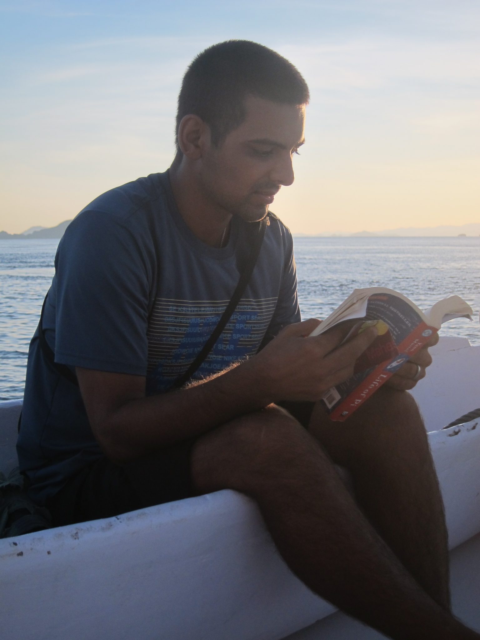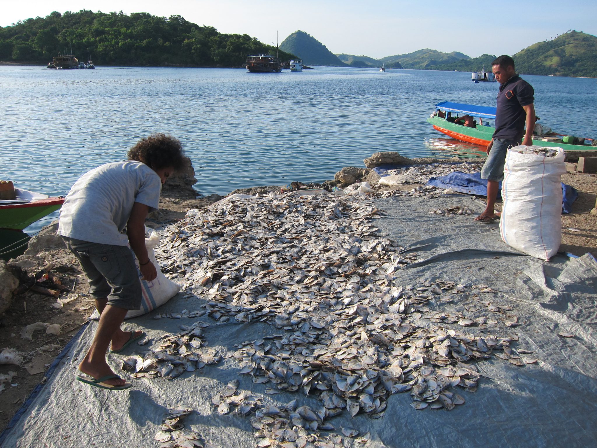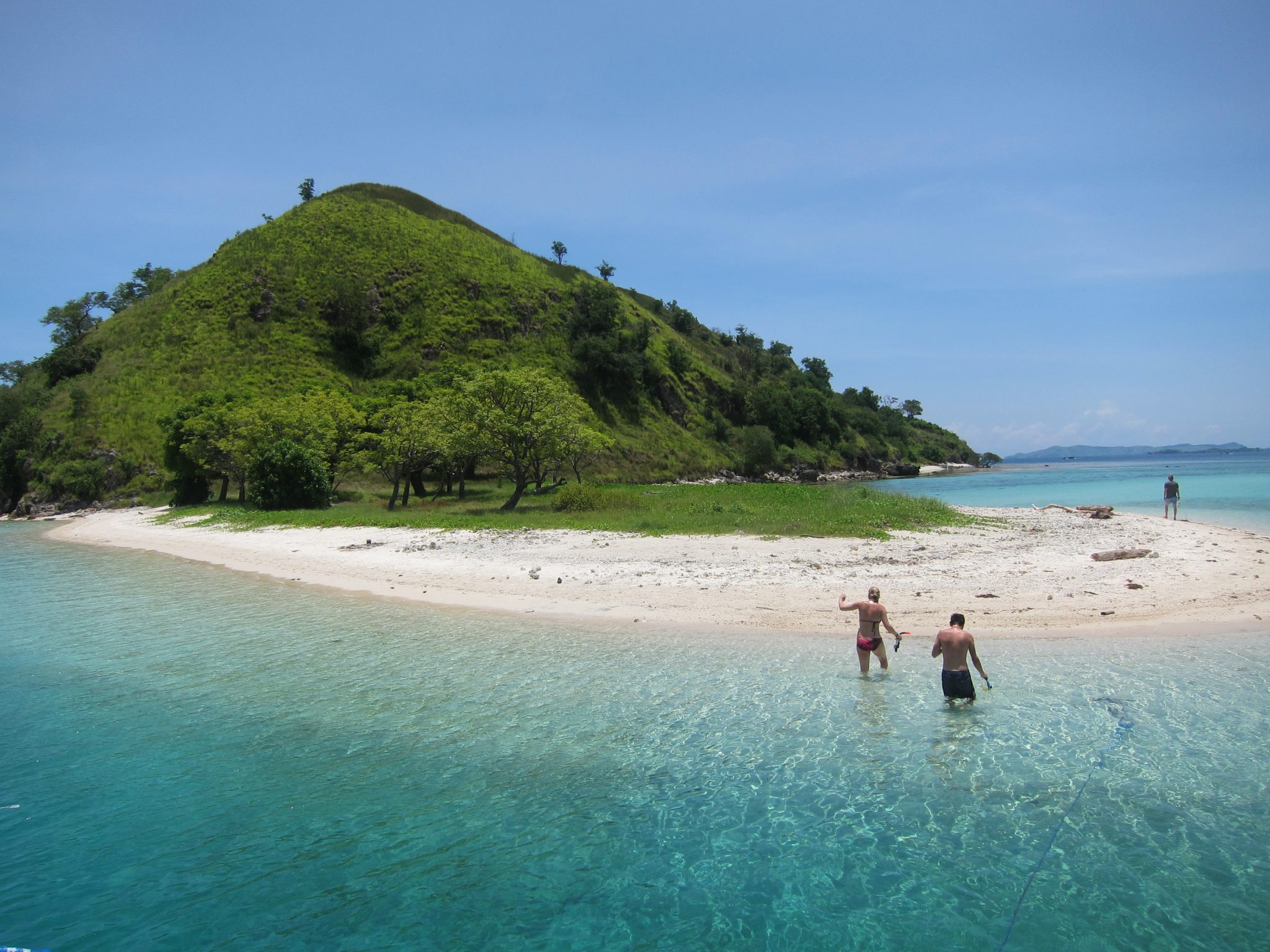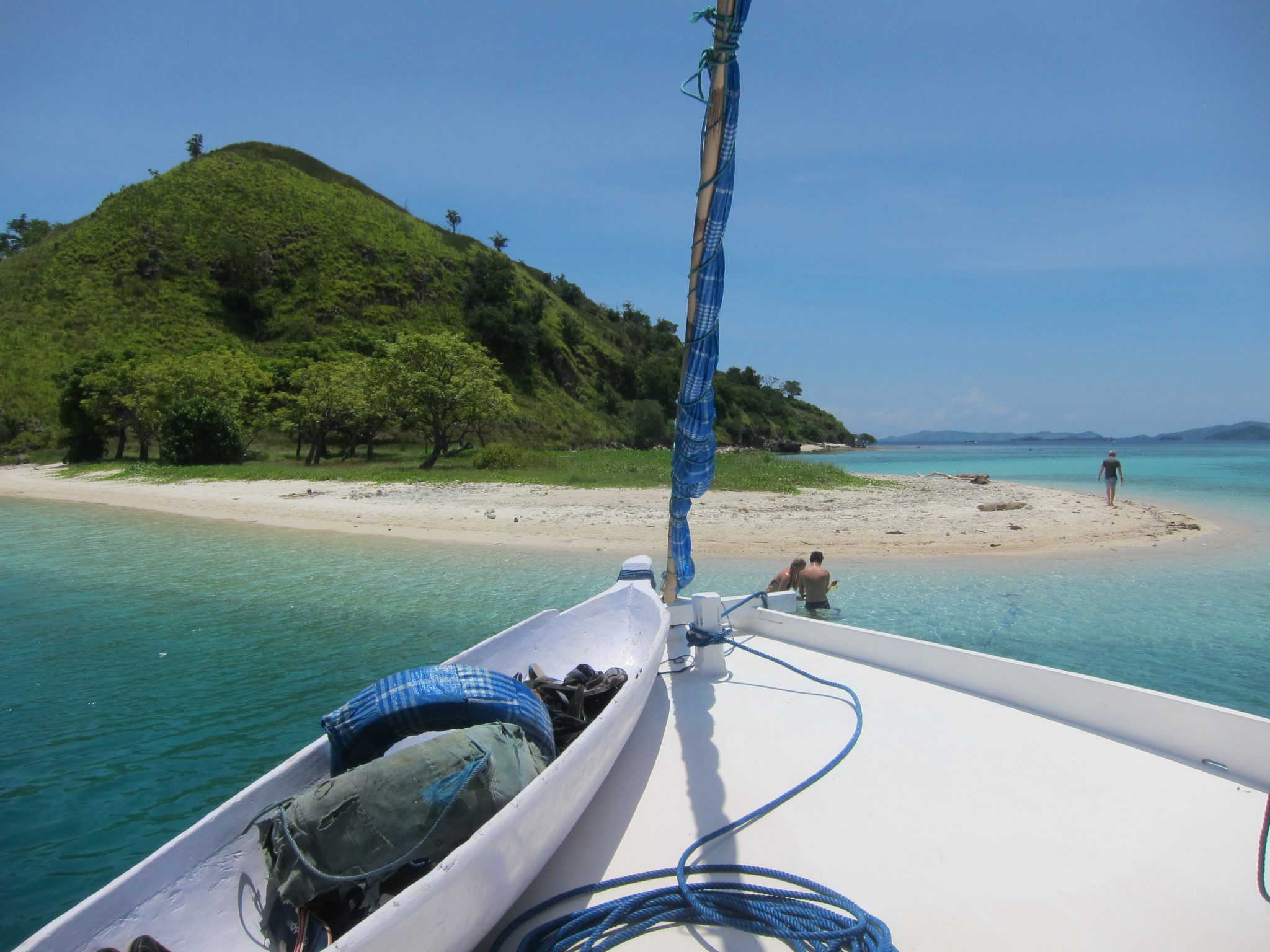 Pēc pūķiem braucam tālāk un piestājam pie mazas saliņas, lai pēdējo reizi snorkelētu. To es nelaižu garām un ar visu sāpošo muguru metos ūdenī. Šeit nav tik skaisti kā iepriekšējā vietā, bet tāpat brīnumu gana. Īpaši mani nesagatavotu pārsteidz kāda kvadrātmetru liela, plakana zivs, ko iztraucēju no snauda un kas aizskrēja pa jūras dibenu, ka smiltis vien noputēja. Es gan neredzēju, bet citi biedrīši sastapušies arī ar trim nelielām haizivīm.