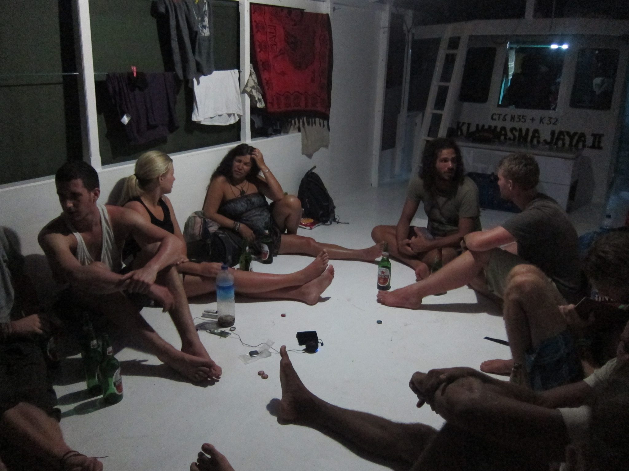 Es nevaru pagulēt. Paralēli apdegumiem, piezagusies vēl kāda liga. Izskatās, ka būšu pamanījusies pa visu šo burzmu saķert arī saaukstēšanos – kakls skrāpējas un ķeras. Tā ir saaukstēšanās sākuma stadija, kad siekalas jārij ik pēc piecām sekundēm un neko nevar padarīt. Ar lielām mokām iemiegu, lai pamostos nakts vidū un konstatētu, ka neizturami vajag čurāt. Tas tev nav piecelties no savas gultiņas un aizdipināt līdz mazmājiņai. Šeit tas nozīmē pa tumsu rāpties pāri kaudzei guļošu ceļabiedru, tad censties nenožauties, pa šauru lūku kāpjot uz klāja, un to neizdarīt arī pašā mazmājiņā, kur ir jālec no atejas sliekšņa uz pēdiņām, ja vien negribas pabradāt pa slapjo grīdu, kur var izveikt vieglu urīnterapiju kājām. Un es jau minēju, ka tas notiek melnā tumsā, turot zobos mobilo telefonu (kuram arī negribas veikt urīnterapiju). Un tad, absolūtā klusumā darot darāmo, domāt, cik no uz kuģa gulošajiem 26 cilvēkiem tu esi pamodinājis.
