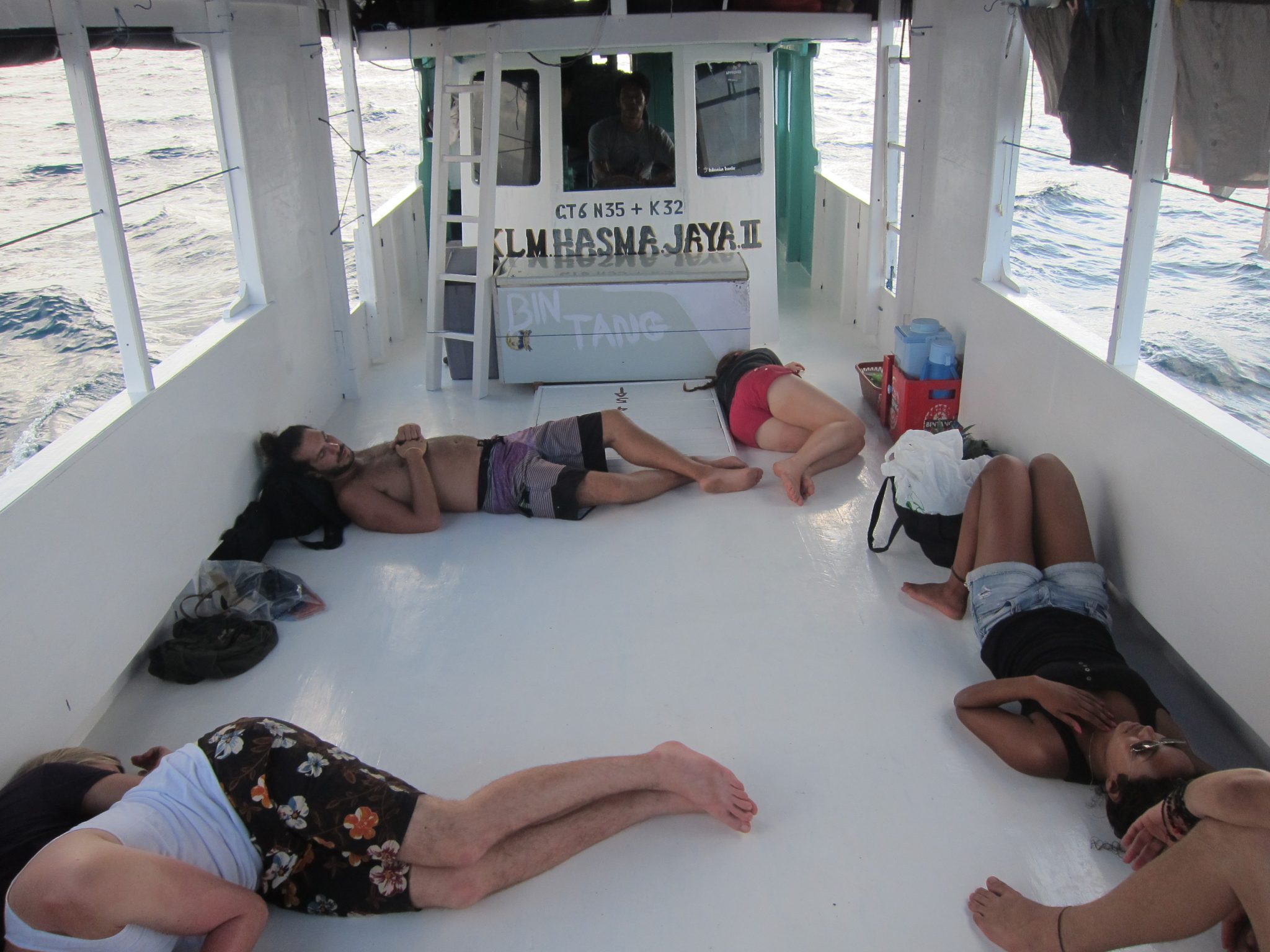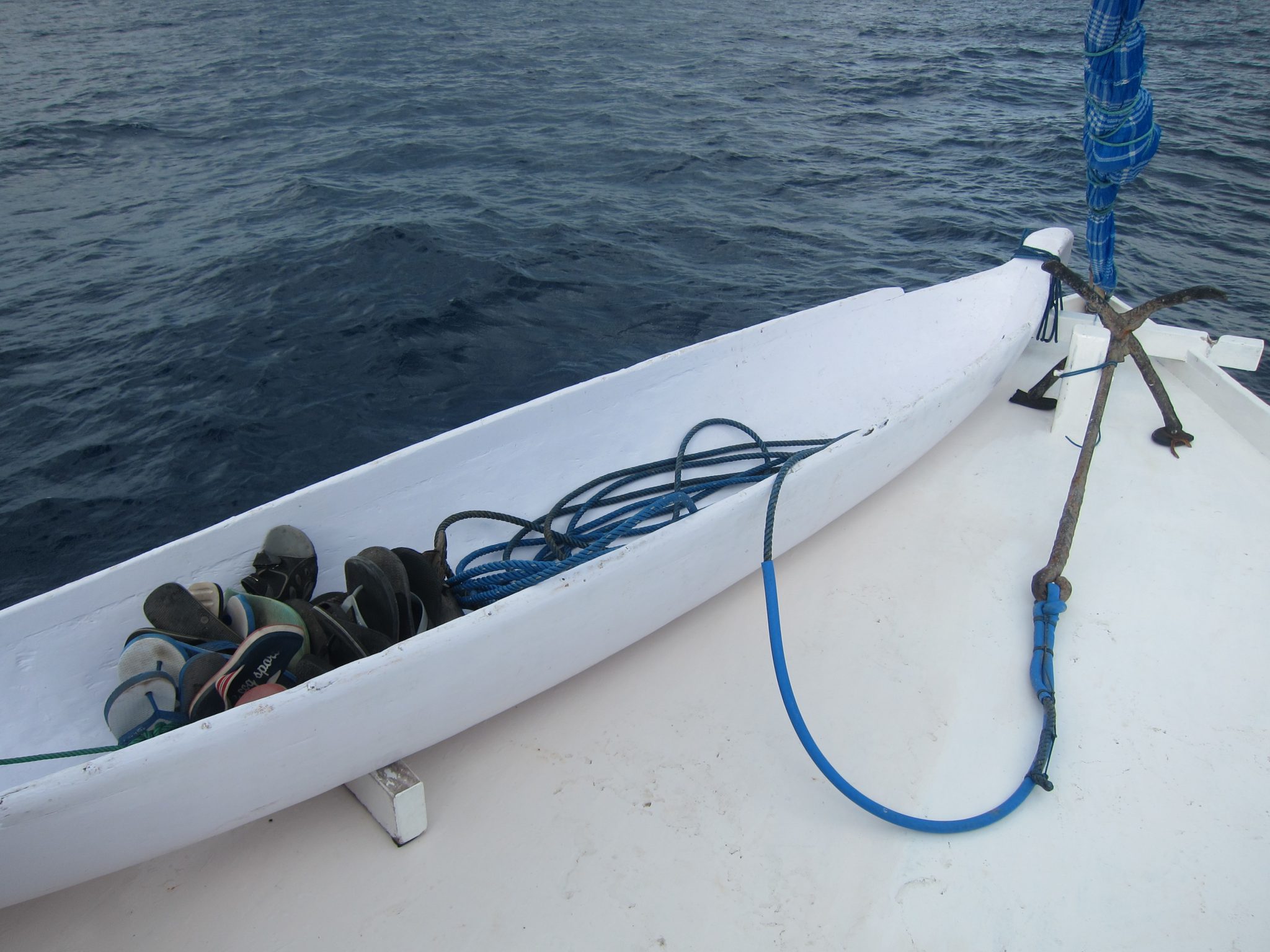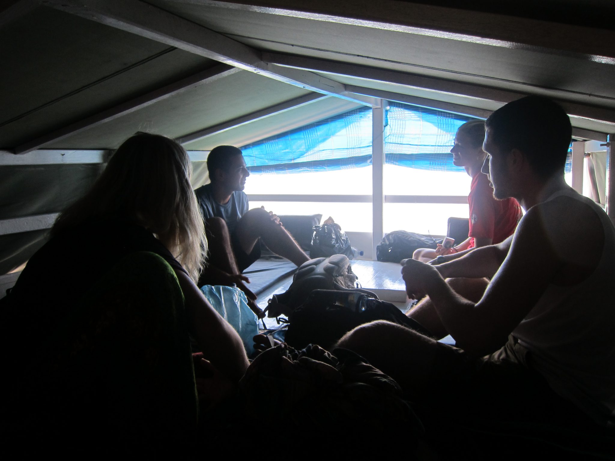 Kad piestājam, cenšamies uzminēt, kura laiva būs mūsējā. Neviena neizskatās diži glauna, bet, kad ieraugām, ka mūsu mantas tiek krautas uz pavisam mazas, baltas tupelītes, esam šokā. Neizskatās, ka tur vispār var satilpt, kur nu vēl dzīvot, 22 cilvēki – tik liela ir mūsu kompānija (nerunājot nemaz par apkalpi). Es izsaku cerību, ka šī laiva ir domāta, lai nogādātu mūs līdz īstajai laivai. Tomēr mans minējums nav pareizs – šīs ir mūsu īstās mājas. Citi, izvilkuši reklāmas bukletus, cenšas salīdzināt bildēs redzamos attēlus ar reālo dzīvi. Jāatzīst, ka kuģis sakrīt ar fotogrāfijās redzamo, vienīgi bildēs kuģis izskatās daudz labāk kā dzīvē (nolāpītais mārketings). Tualetes bildes gan nesakrīt. Bukletā uzzīmēts glīts pods, bet reālajā dzīvē vienīgā nokārtošanās iespēja ir caurums kuģa grīdā, no kurienes visi labumi pa taisno nonāk okeānā. Lieki piebilst, ka mazgāšanās iespēja neeksistē. Gulēšana notiek laivas otrajā stāvā, kur no matracīša līdz brezenta griestiem ir mazliet vairāk par metru. Guļam, protams, visi vienā telpā un pārvietojamies rāpus, cenšoties nenospiest kādu ceļabiedru.