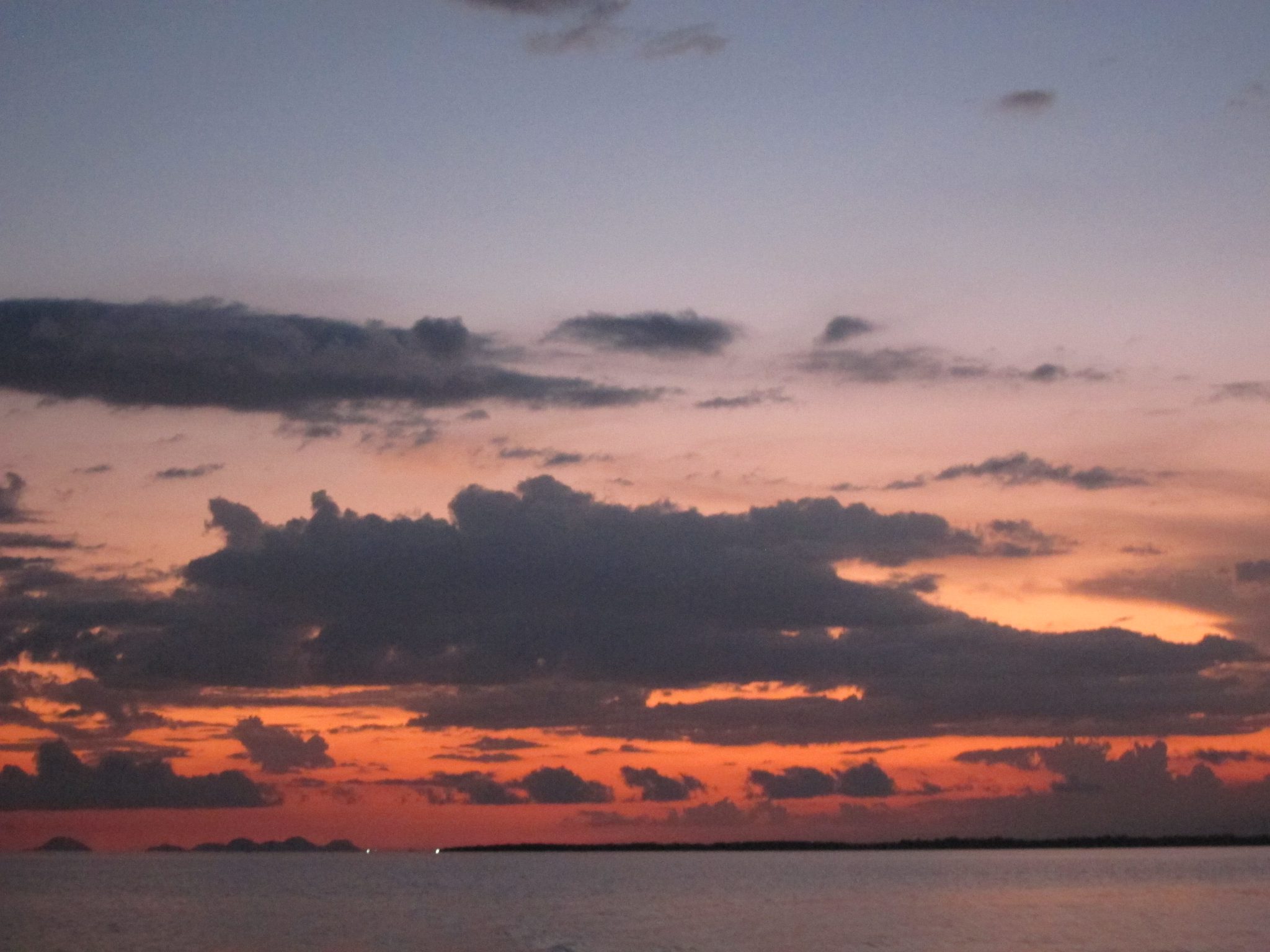 Kā nebūt iekārtojamies. Mūsu lielās somas tiek novietotas kravas tilpnē. Es palūdzu savu čemodānu nekur nenovietot, būs uz kā sēdēt. Kad vairums somu pazudušas no klāja un ļautiņi izklīduši pa laivu, vairs neizskatās tik briesmīgi. Daudzi atguļas un ieslīgst pēcpusdienas snaudā. Es izkaru uz striķa savas pusslapjās drēbes, kas top sausas un nedaudz sāļas nepilnas stundas laikā. Paņemam pa aukstam alum, vērojam zilo ūdeni, garām slīdošās salas un vienojamies, ka tomēr nav tik traki. Kad pievakarē sākas krāšņa saulrieta izrāde, esam jau pavisam laimīgi un apmierināti ar dzīvi.
