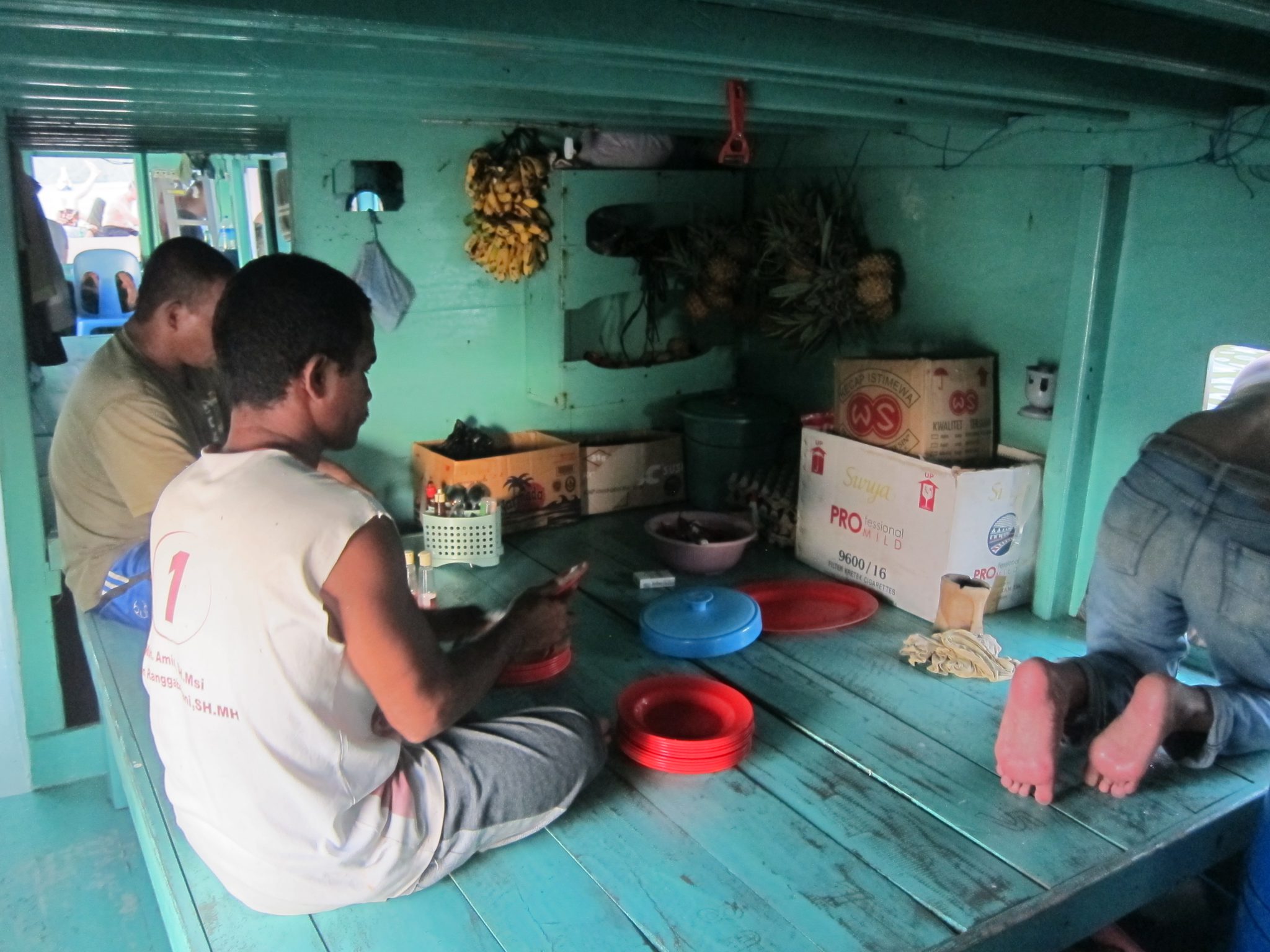 Pēcpusdienā atkal sitam kārtis un laiku. Vakarā pietauvojamies klusā līcītī un mums tiek izsniegtas makšķeres – auklas ar āķiem galos. Metode līdzīga kā esmu piekopusi Kaboverdē. Uzspraužam uz āķa vistas gabaliņus un gaidām rezultātus. Zivis knibinās, bet neķeras. Puse no mums izmakšķerē pa korallim, bet holandiešu meitene pat noķer divas zivis, kas gan tiek palaistas atpakaļ. Pie laivas piepeldējis suvenīru tirgotājs pačukst, ka neviens normāls cilvēks šajā vietā nemakšķerējot, tas jādara dziļāk līcī. Kad makšķerēt apnicis, gaidām flying foxes – lielos sikspārņus. Pēc saules rieta viņi arī sāk lidot no pretējā krasta klintīm un netālo mangrūvju audzi. Izskatās gana spocīgi.