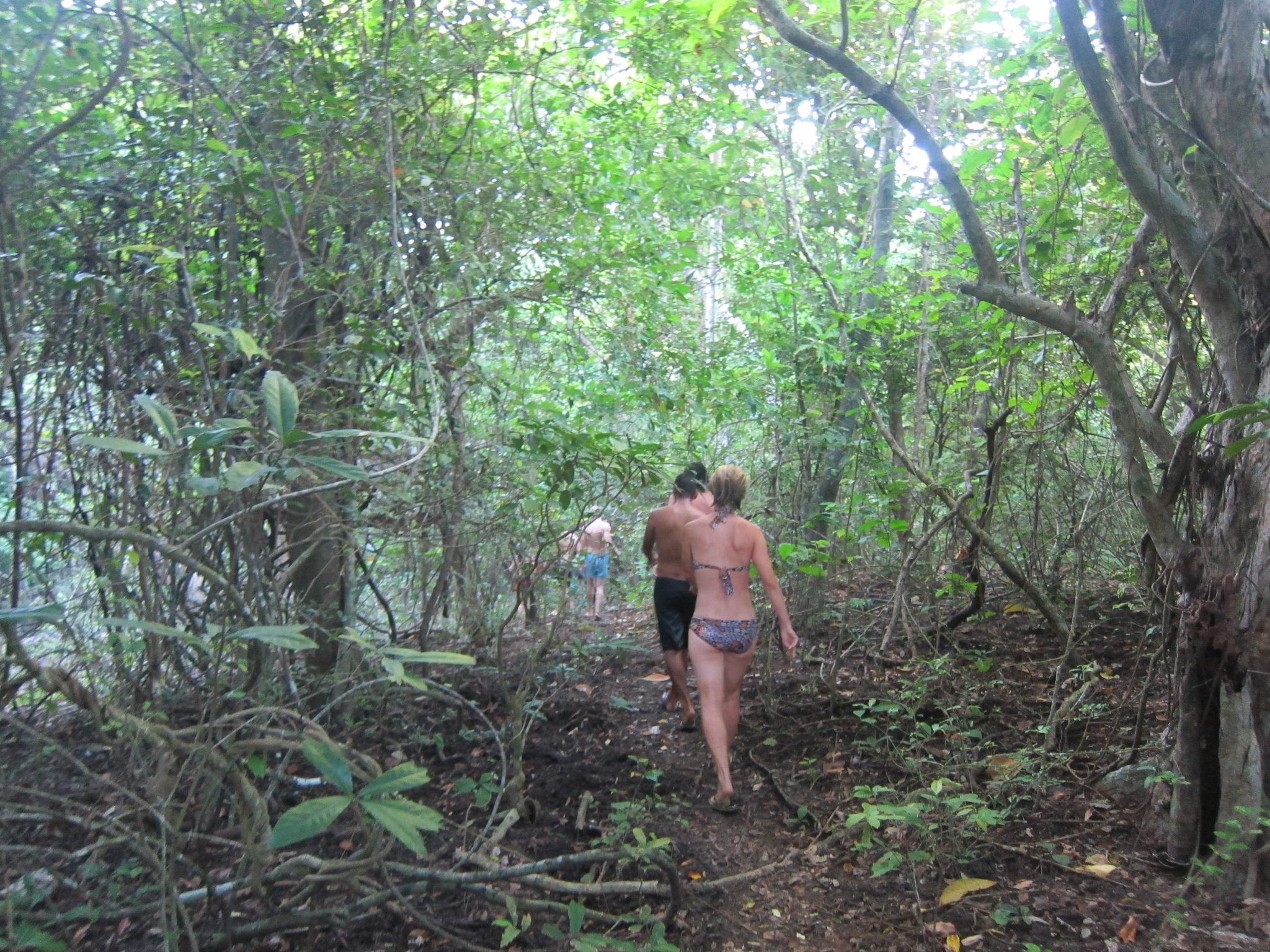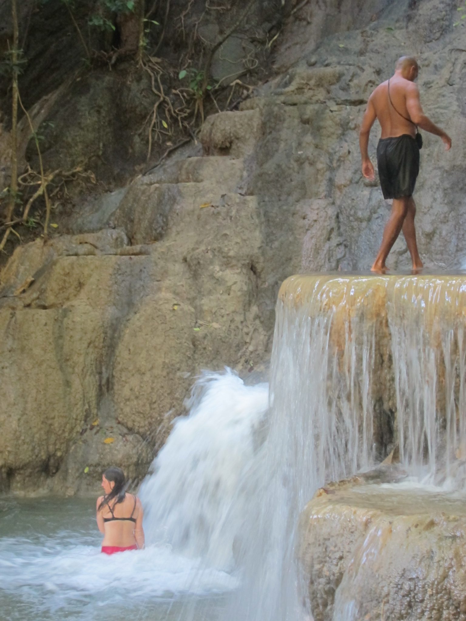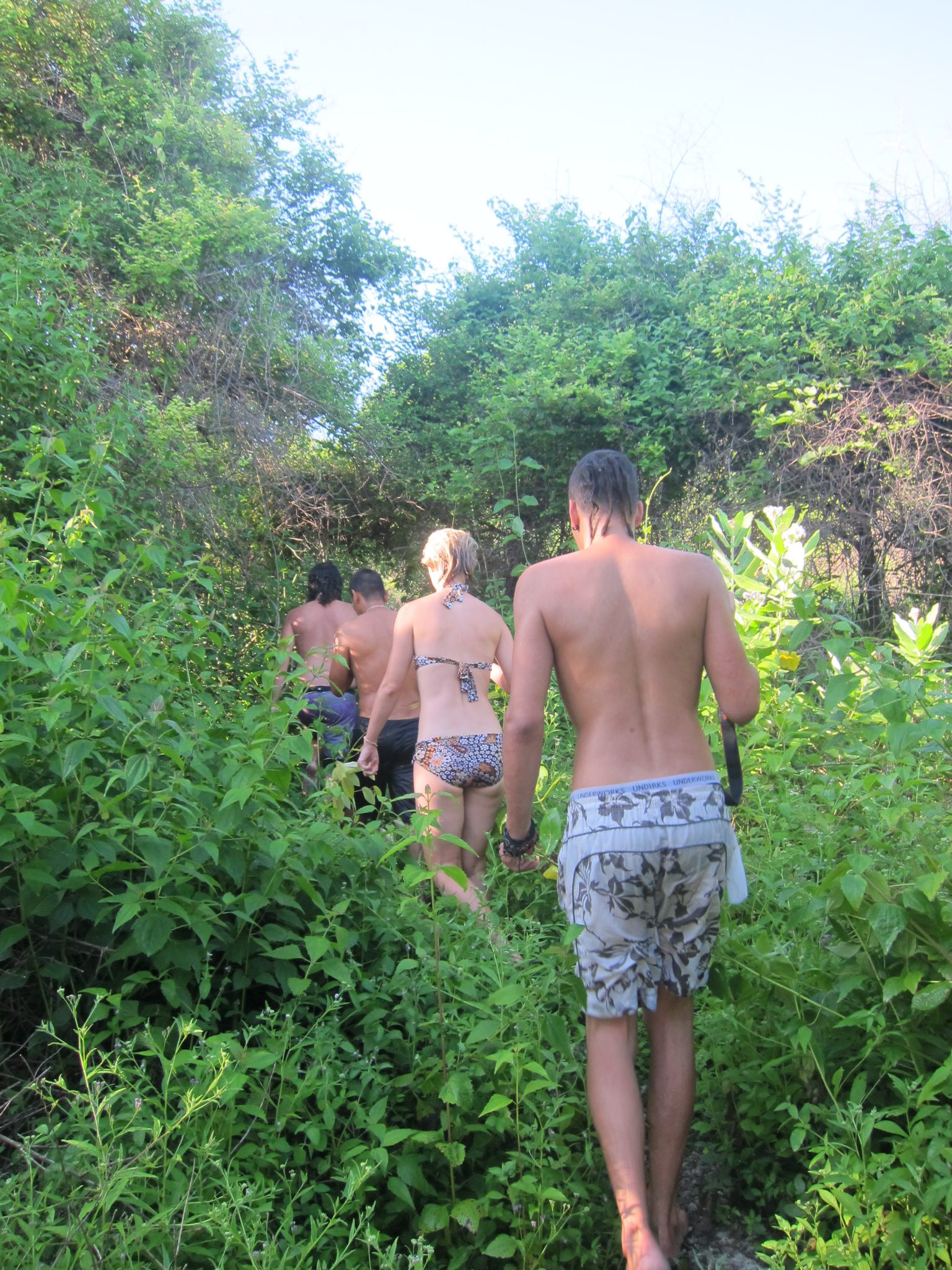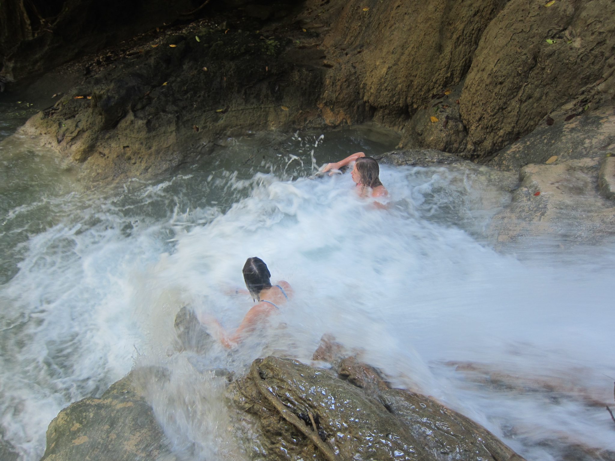 Pēc brokastīm pietauvojamies kādā līcītī. Mantas – apavus, šampūnu, fotoaparātu drīkstam salikt kastē, kas ar mazu koka kanoe laivu tiks nogādāta uz salas. Paši – lūdzu, leciet okeānā un peldiet uz krastu. To arī darām. Viens pēc otra, visi saplunkšķ iekšā ūdenī un airējas uz salu. Tur, pa džungļu takām, dodamies ūdenskrituma virzienā. Drīz tas ir klāt – īsts dabisks SPA ar muguras masāžu, džakuzi un citām atrakcijām. Vienīgi kājas drusku pinas pa koku saknēm un uz ūdenskrituma kopā ar mums par dušu priecājas mazi tārpiņi. Bioloģijas speciāliste atzīst, ka tie neesot diez ko bīstami. Ja nu kas, mūsu vidū ir arī divi ārsti.