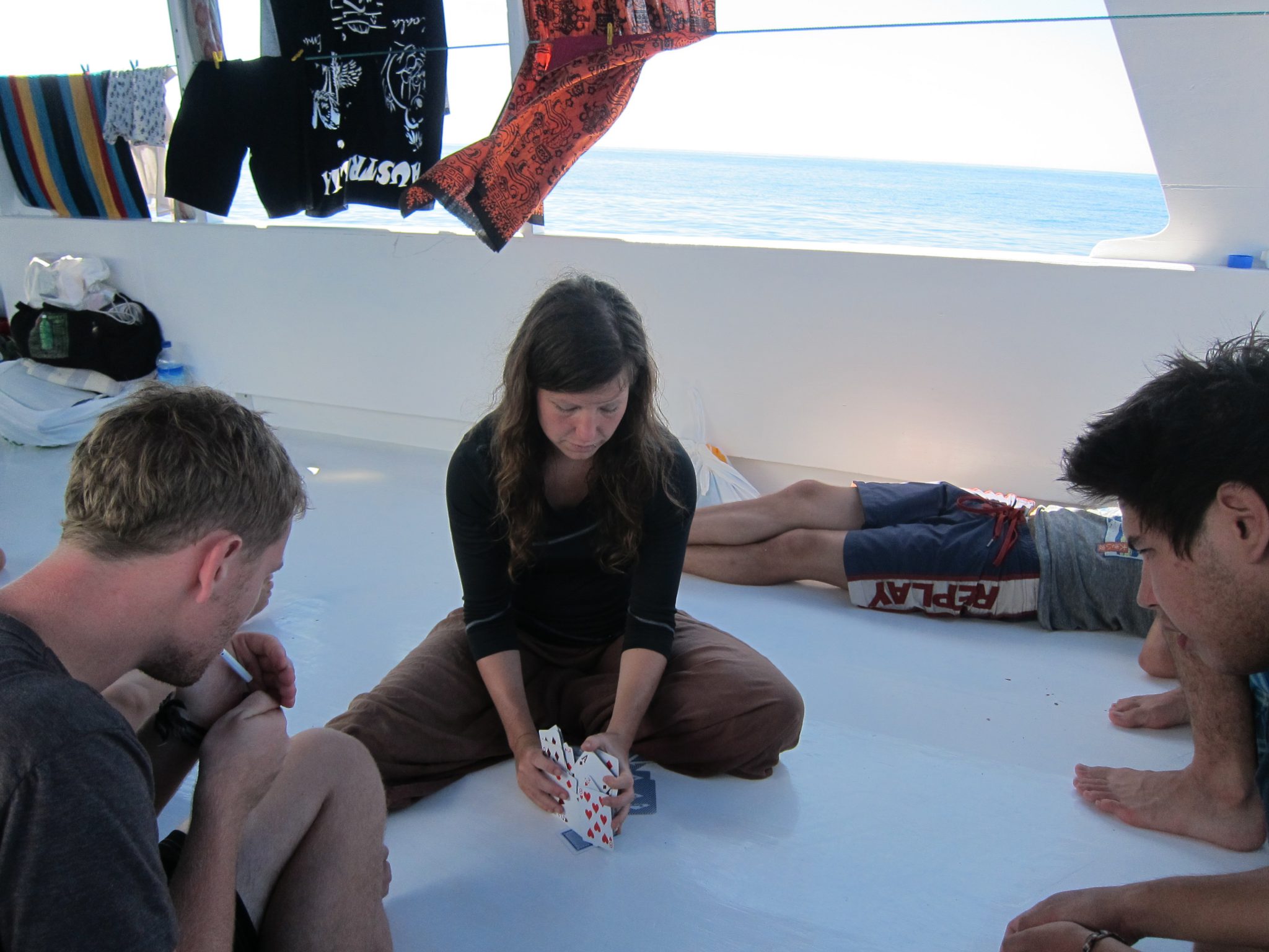 Sasēduši uz kuģa, turpinām ceļu. Ar pāris jauniešiem sitam kārtis, šie man iemāca vienu riktīgi interesantu spēli. Tā pienāk pusdienlaiks un šī ir pirmā ēdienreize, kas man iet pie sirds. Kad esam pieēdušies, nonākam snorkelēšanas vietā. Esmu mazliet noraizējusies, kā man veiksies, jo vienīgo reizi esmu snorkelējusi Amerikā un īpaši spoži man toreiz neklājās – vairāk sprauslāju un lēju ārā no maskas un trubiņas ūdeni, nekā lūkojos uz zemūdens pasauli.
