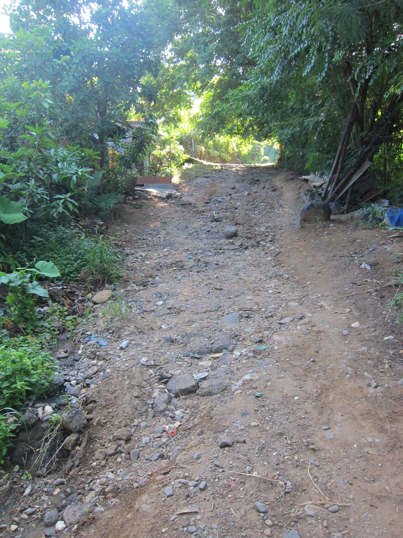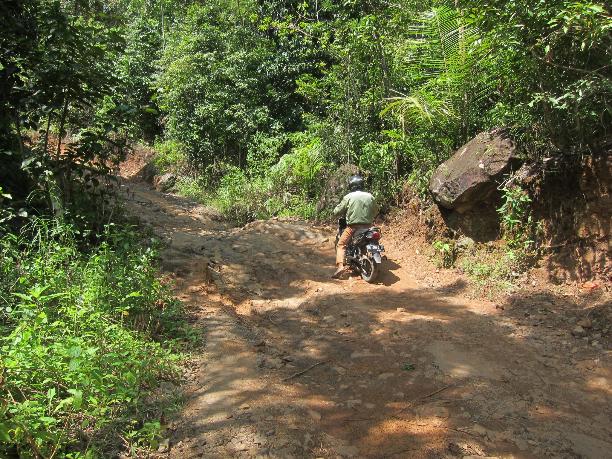 Sākumā ceļš ved cauri ciematiem, tad vijas kalnā, līdz kādā pagriezienā mēs raujam iekšā nelielā ceļā. Lieki piebilst, ka norāžu nav nekādu. Tā kā arī mans šoferis uz šejieni dodas pirmo reizi, viņš ik pa laikam piestāj, lai pavaicātu ceļu. Ceļš kļūst arvien draņķīgāks – parādās lielas bedres, stāvas, akmeņainas nogāzes, dubļu peļķes un tilti, veidoti no baļķiem. Aizvien biežāk kāpju nost no braucamā un ļauju šoferītim vienam izlavierēt caur aizdomīgākajām vietām. Galum galum, tomēr klāt esam. Mums uzreiz piesitas kāds vietējais un saka, ka būšot gids. Cik? 50 000. Pasūtu viņu dillēs un saku, ka gan jau kaut kā atradīšu ūdenskritumu arī pašas spēkiem. Un vienkārši dodos pa taku uz priekšu. Parasti uz šādiem objektiem ved labi iestaigāts ceļš un neredzu iemeslu, kāpēc man vajadzētu gida sabiedrību. Neraugoties uz manu skaidro noraidījumu, gids tomēr nāk līdzi. Pēc divdesmit metriem viņš paziņo “bamboo” (nevar būt), vēl pēc divdesmit: “rice field”. Fantastiska informācija, ko es darītu bez gida! Labi, labi, puisīt, ja vēlies, pastaigājies, neko es tev nemaksāšu.