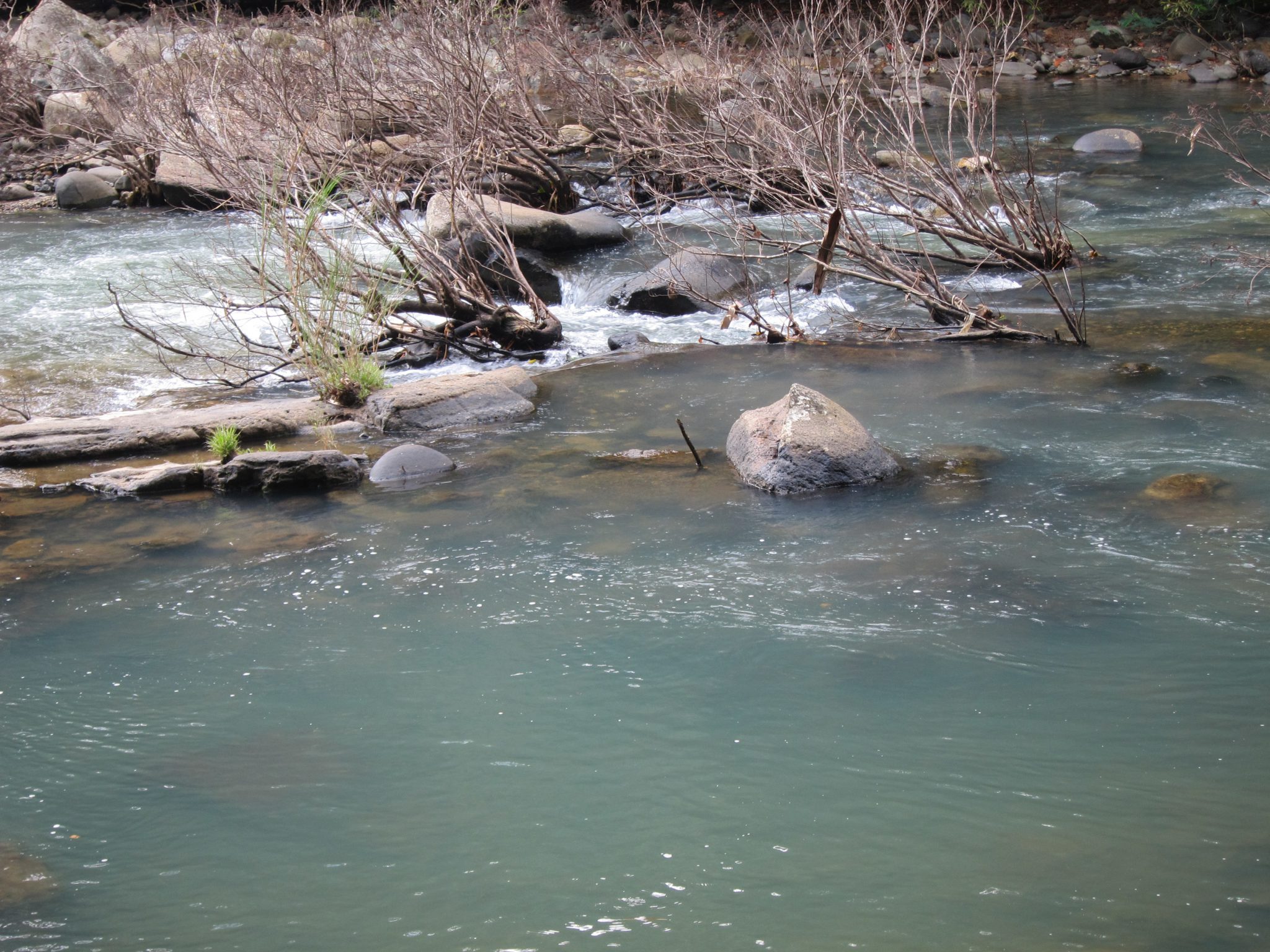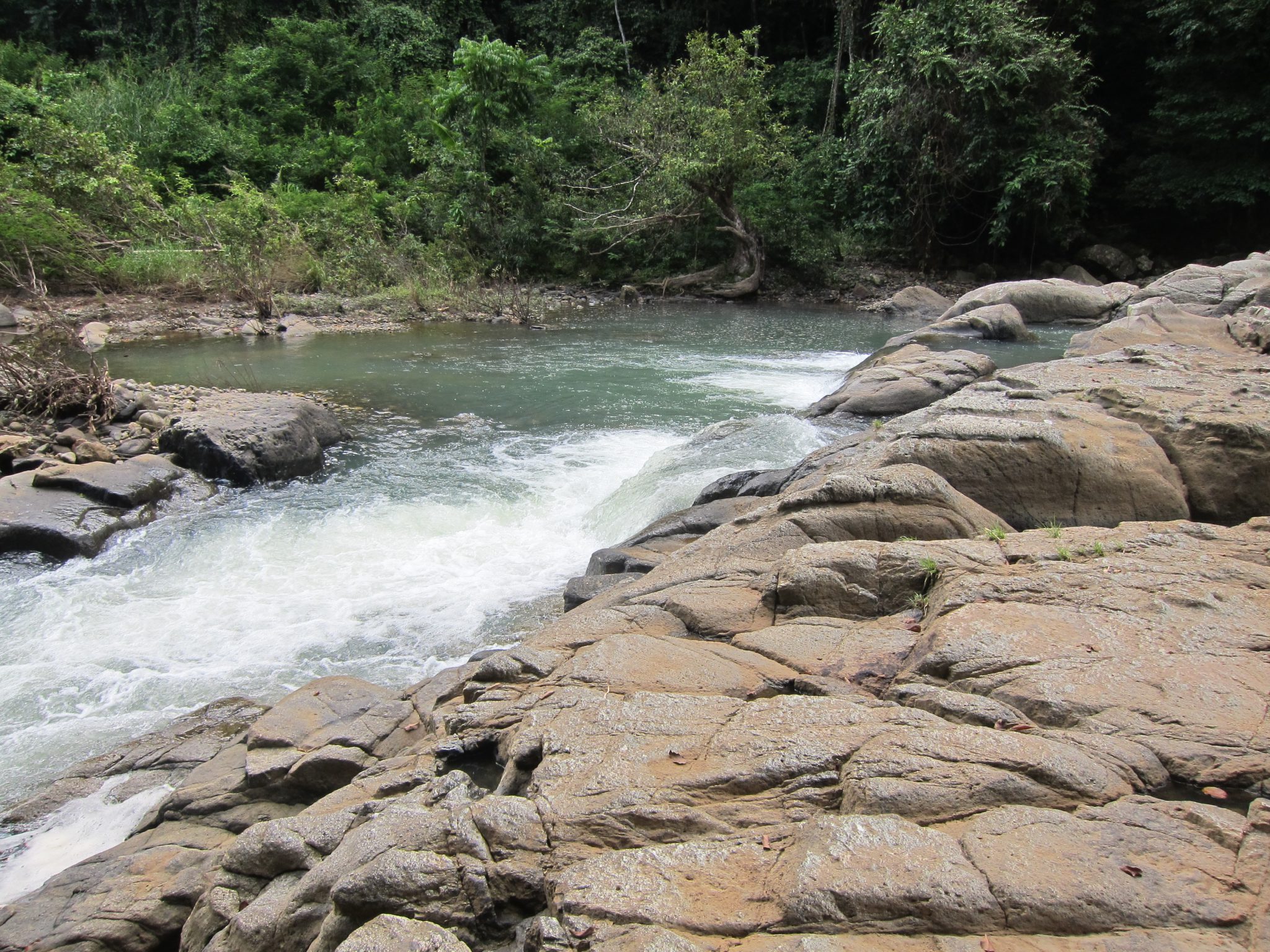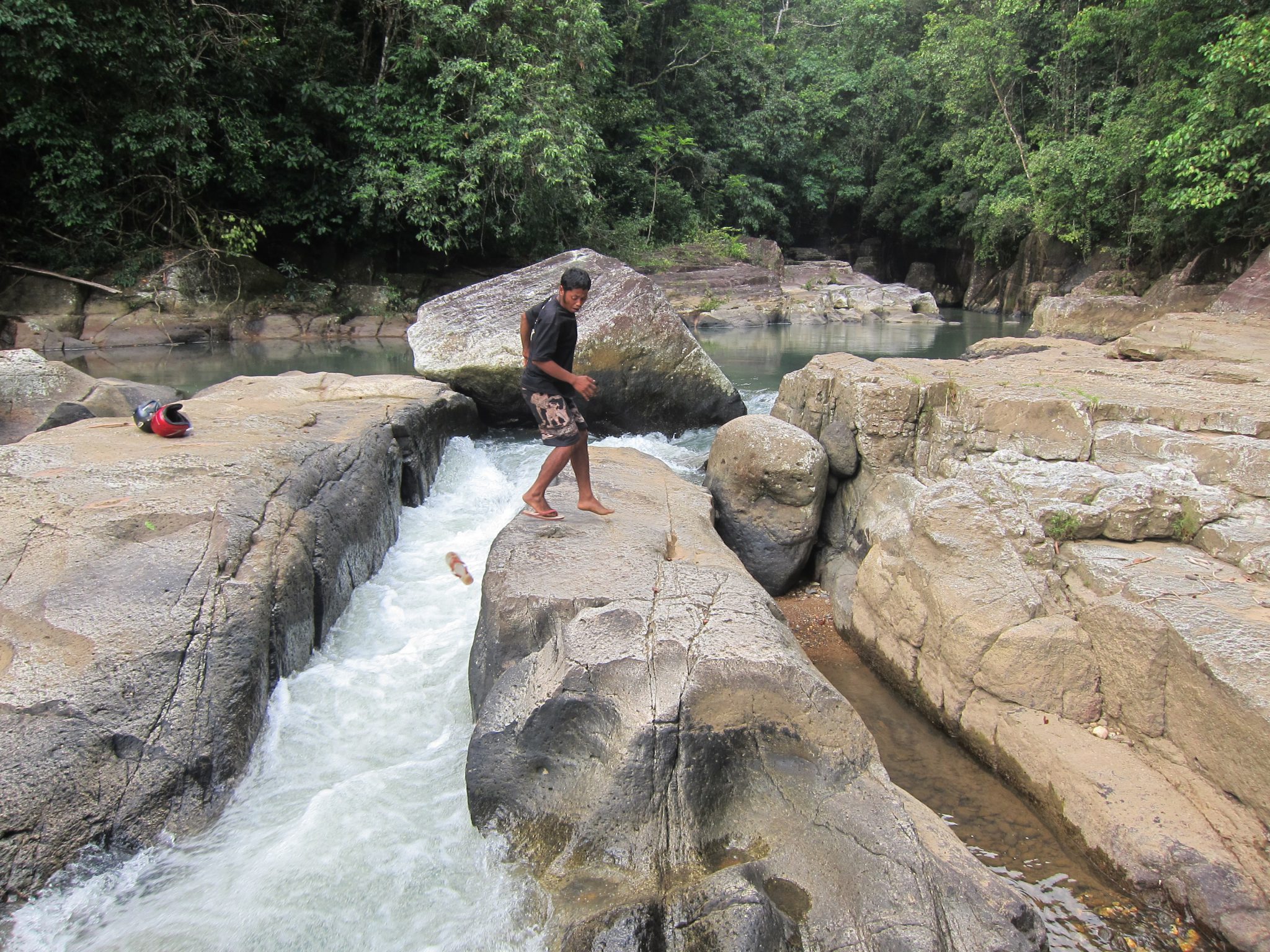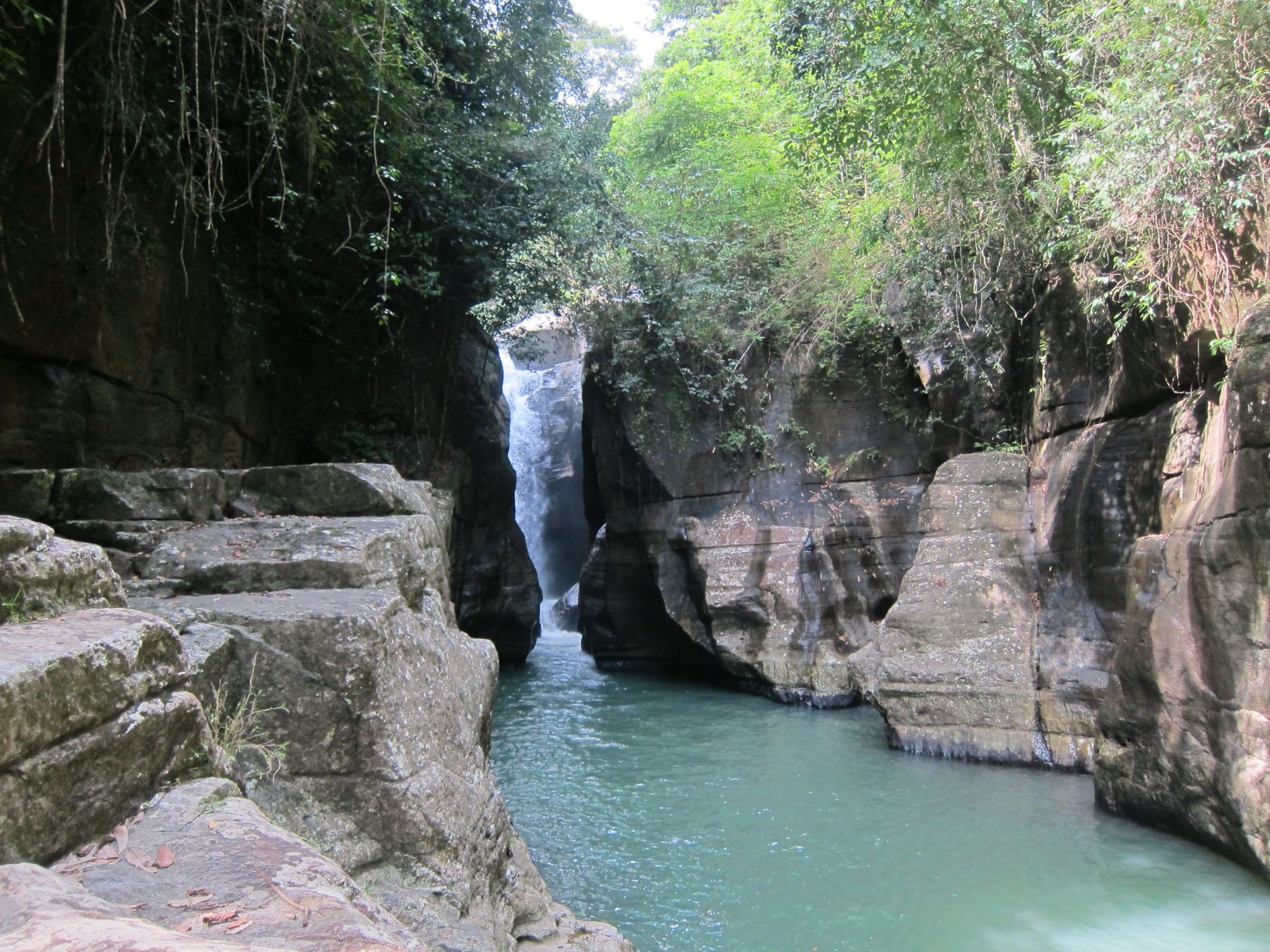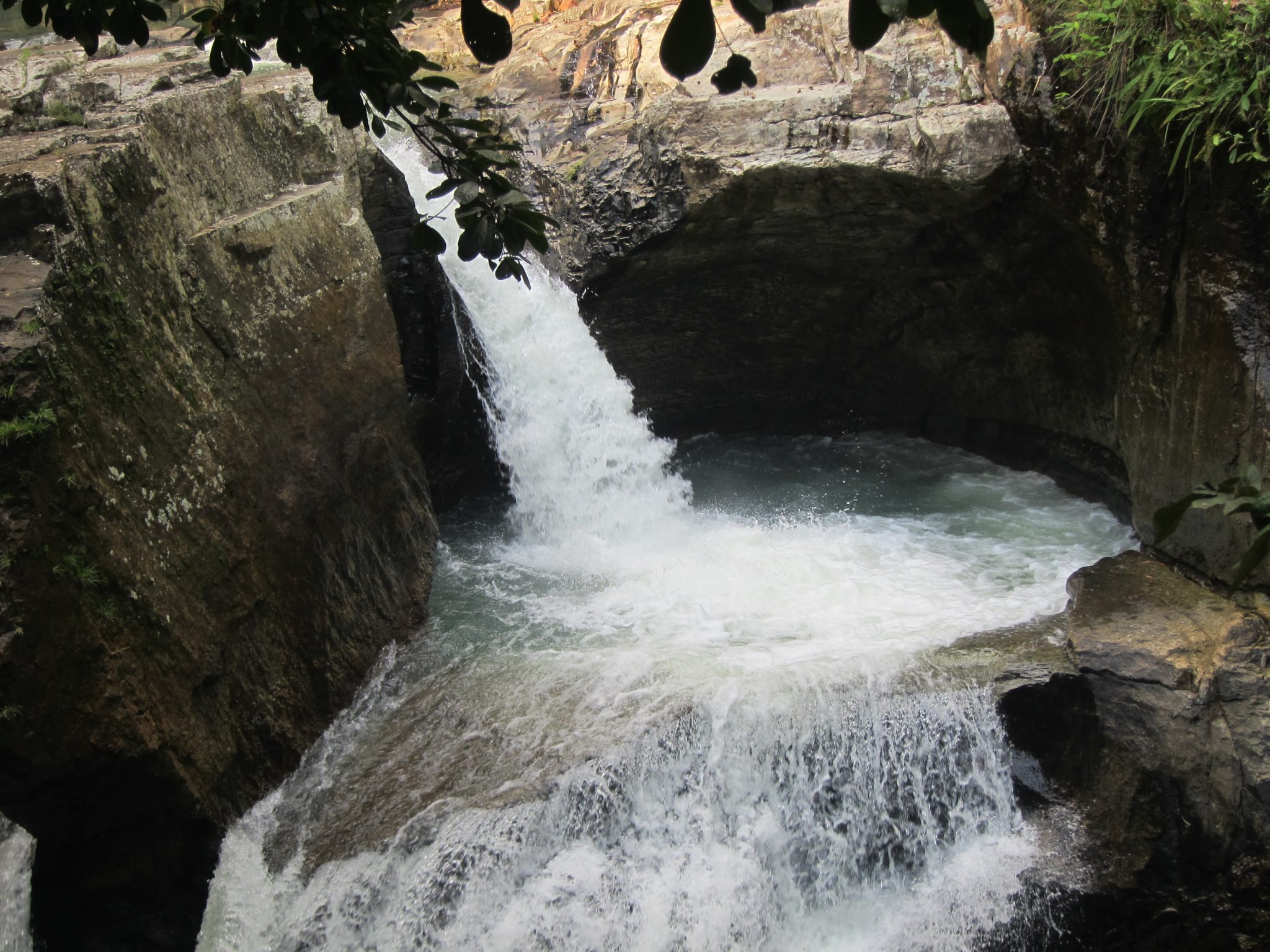 Ceļš kļūst arvien šaurāks, līdz pārvēršas tikko samanāmā džungļu takā. Bet taka joprojām ir vienīgā, līdz ar to domāju, ka ceļu spētu atrast. Tomēr, tā kā ejam jau vairāk kā pusstundu, nejūtos slikti, ka man pa priekšu dipina šoferis un vietējais. Krietnu brīdi kāpuši lejup, nonākam pie upes. Tālumā, starp klintīm, redzams arī neliels ūdenskrituma fragments. Lai tiktu pie ūdenskrituma, jāšķērso upe. Tas jādara, lecot pāri lieliem klintsbluķiem, zem kuriem šņākuļo baltas ūdens vērpetes. Tieku līdz vietai, kur jālec pāri vairāk kā metrīgai plaisai. Ja šo attālumu vienkārši noliktu uz zemes, pārlektu kā divi deviņi, bet šeit kaklu lauzt negribas. Paziņoju puišiem, ka nelekšu vis un mēģināšu tomēr paieties uz priekšu pa šo pašu krastu. To arī daru.