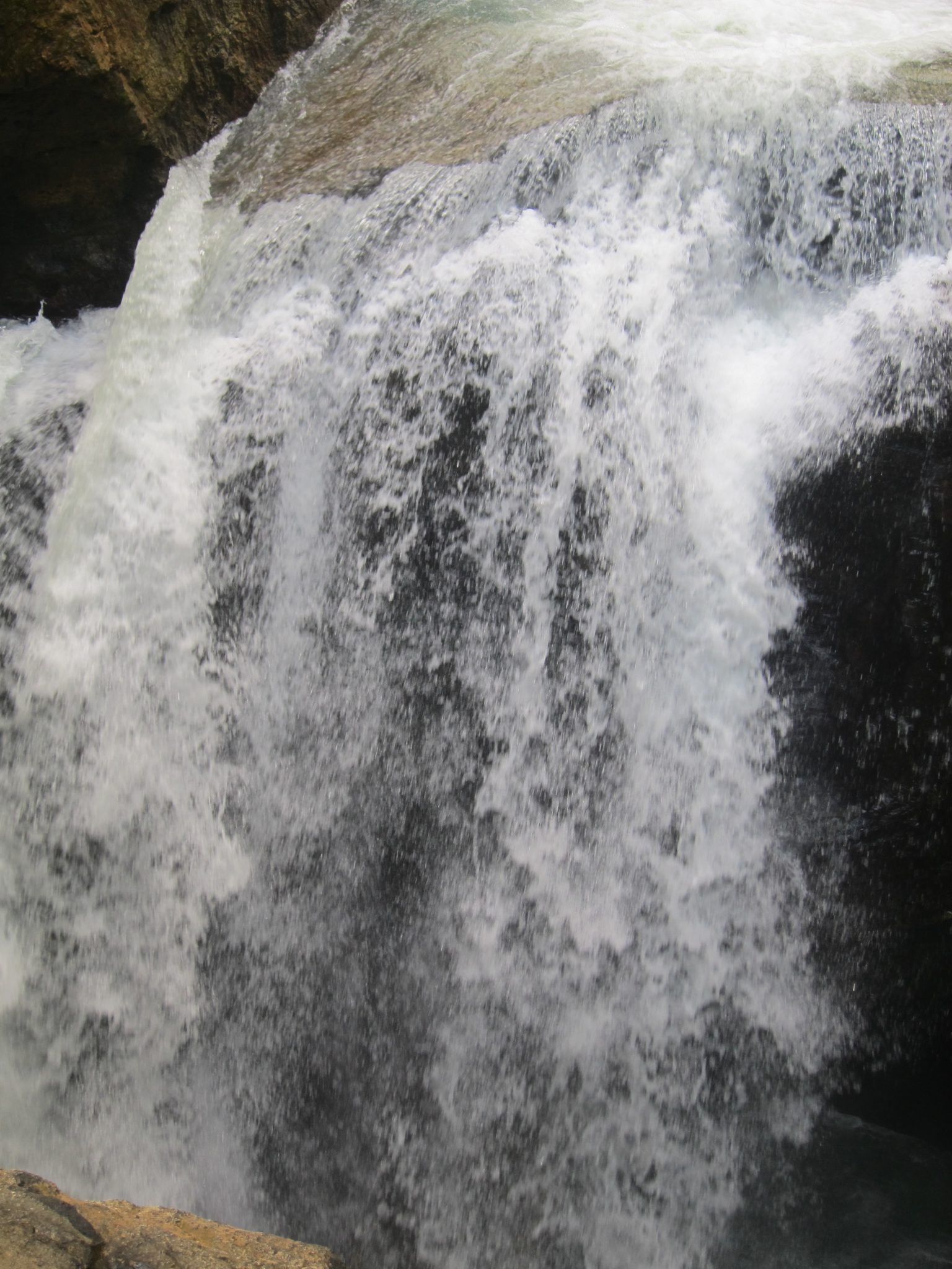 Turpinām kāpienu gar krastu, līdz nonākam lēzenā klinšu laukumiņā, no kura jau daudz labāk var redzēt ūdenskritumu. Klinšu ielokā pie mūsu kājām skalojas ūdenskrituma izgrauzts ezeriņš. Gids prasa – vai es vēloties šeit ielēkt. Es saku, ka viņš nedraudzējas ar galvu. Tad šis nomet kreklu, ieskrienas, atsperas pret klinšu malu un lido lejā. Plunkš! Izskatās vareni. Skatos kā viņš, veikli kā pērtiķēns izrāpjas uz klints malas (izskatās. ka tur ir tādas kā trepītes) un pēc pusminūtes atkal stāv man blakus, žilbinādams savus baltos zobus.