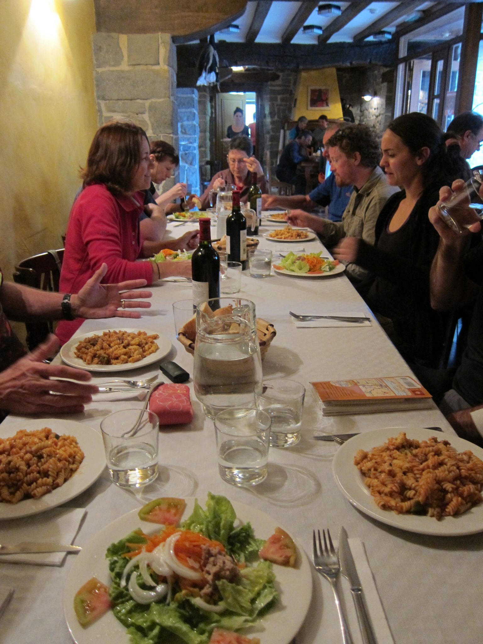 Lēnām ir pienācis vakariņu laiks un mēs pasūtām, ko katrs vēlamies no piligrimu ēdienkartes. Es šoreiz otrajā izvēlos zivi, bet, kad ieraugu kārdinošo gaļas sautējumu ar brūniem, ceptiem kartupelīšiem mērcē, dikti gribu to. Bet nu jau pa vēlu, kas pasūtīts – pasūtīts. Kā par spīti, zivs nav garšīga un pāris vārītās kartupeļu šķēles ir ūdeņainas. Mazliet ieēdusi, griežu zivi uz pusēm un – konstatēju, ka tā vidū ir jēla. Mazliet pietēlojot neapmierinātu klientu, pasaucu oficianti un saku, ka šito es neēdīšu gan un vispār man nav vairs ticības viņu zivs pagatavošanas prasmēm, lai dod man arī gaļas sautējumu. Un šī atnes ar un es tieku pie sava kārotā mielasta un kārtīgi pieēdos.