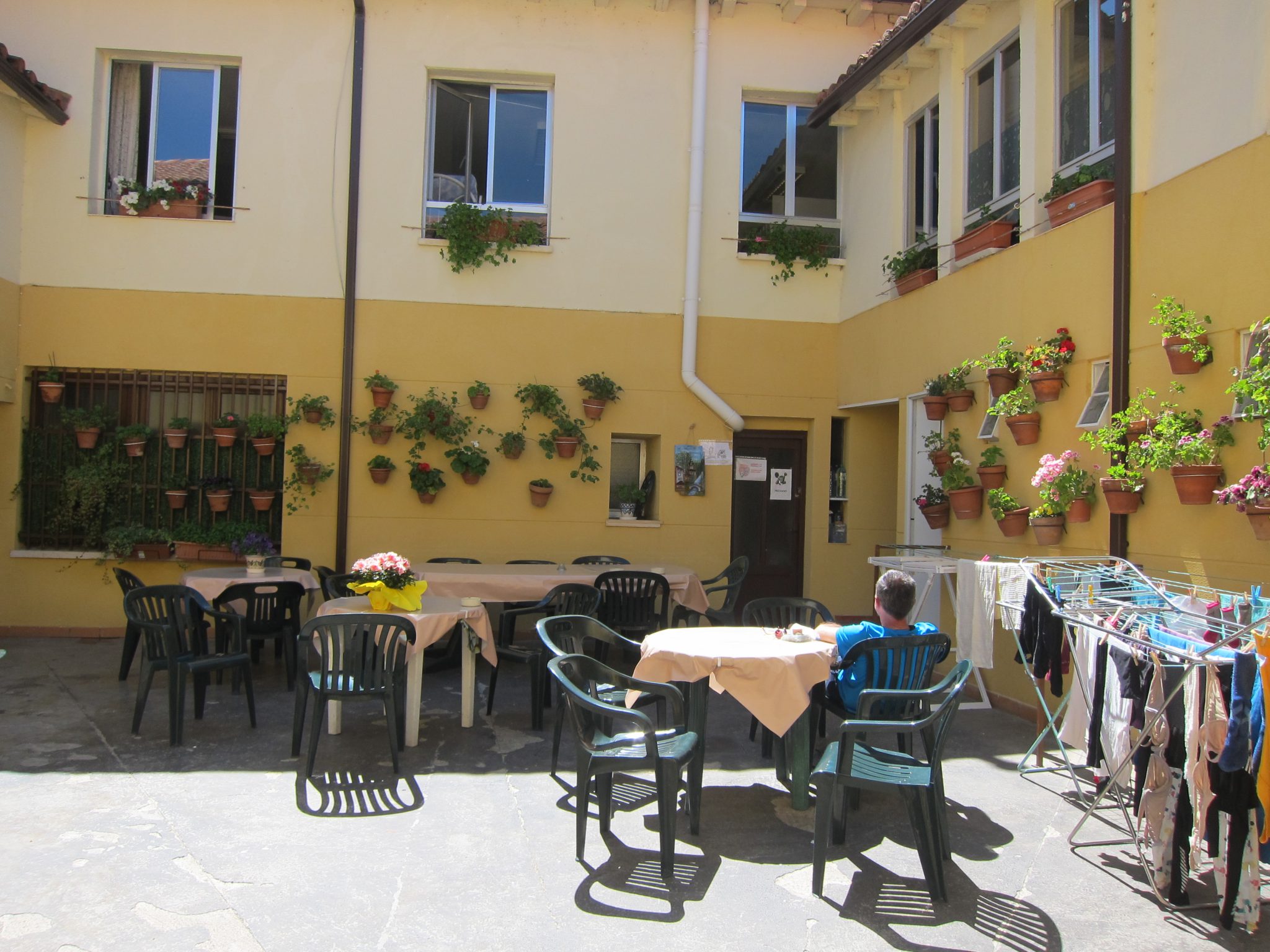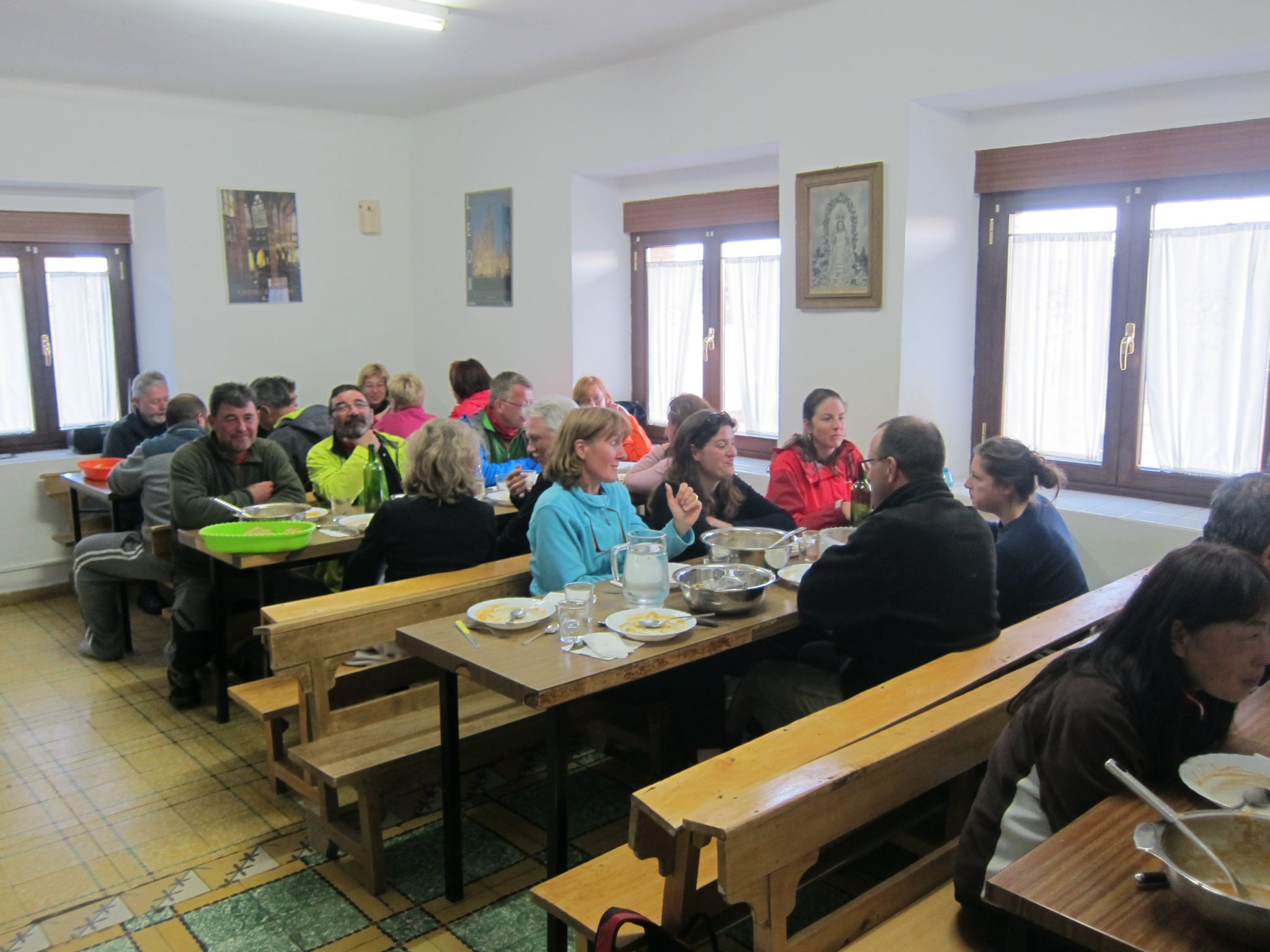 Alberģē atgriežos mirkli pēc astoņiem vakarā. Kad ienāku virtuvē, visi jau sēž pie galdiem un ir notiesājuši salātus. Atvainojos par nokavēšanos un ar prieku konstatēju, ka man ar vēl palicis salātu pikucītis vienā no bļodām. Kamēr domāju – nez vai būs vēl kaut kas ēdams – tiek ienestas lielas, kūpošas bļodas ar kartupeļu sautējumu mērcē. Pēc tā jau jūtamies labi paēduši, bet vēl pie apvāršņa parādās lēcu virums. To gan izdodas tikai mazliet nogaršot, jo vēders nav bezizmēra. Lai gan, kā izrādās, viens jogurtiņš, kas tiek piešķirts saldajā, tur ietilpst gan. Ļoti vienkāršas, bet gardas vakariņas. Tās pagatavojuši baznīcas brīvprātīgie. Viens no tiem – kungs gados, vakariņās sēž man iepretim. Izrādās, viņš ir itālis, pirms teju 10 gadiem pats gājis Camino, juties šeit ļoti labi, un pirms neilga laiciņa nolēmis atgriezties Camino tuvumā un strādāt par brīvprātīgo.