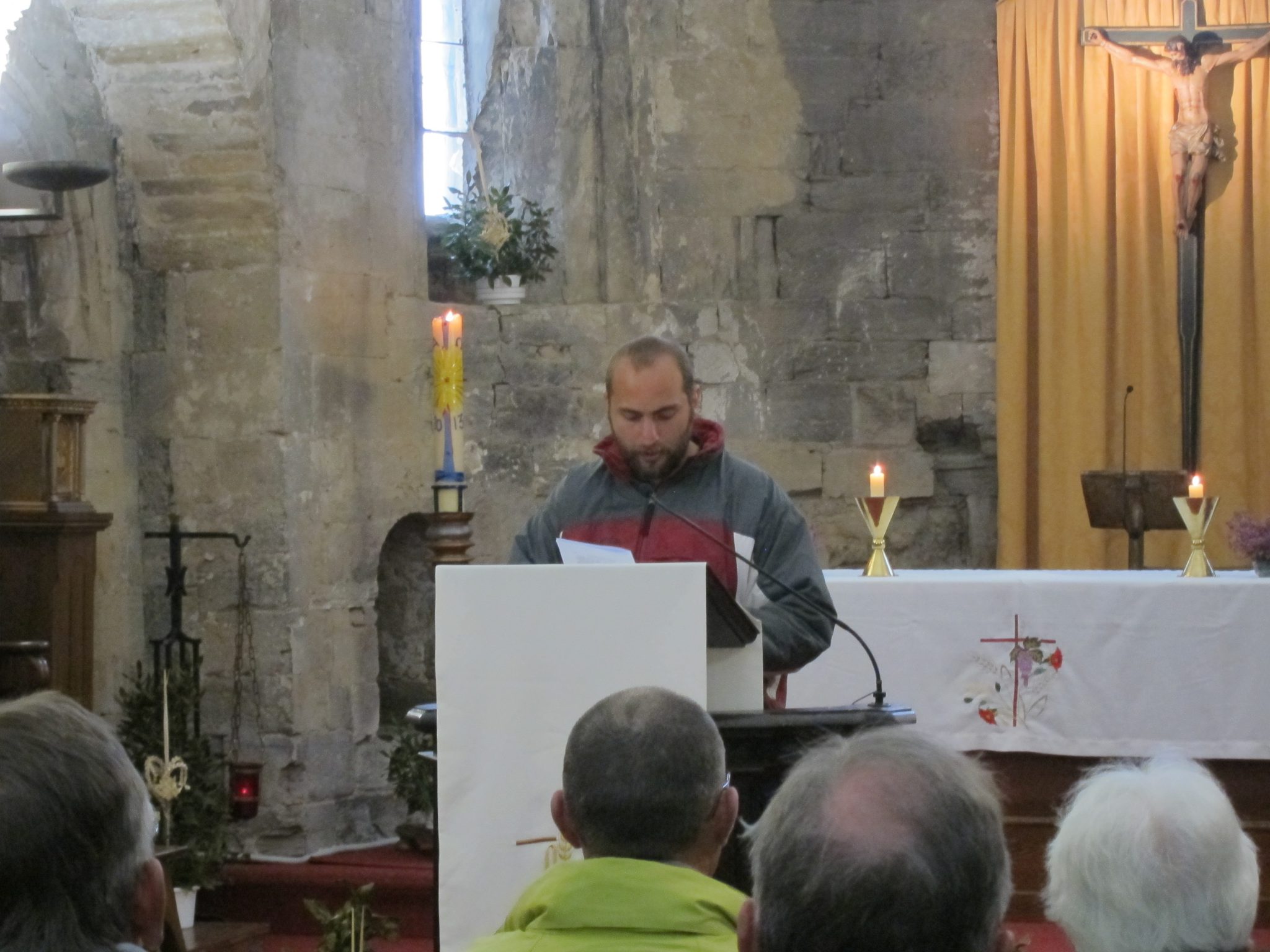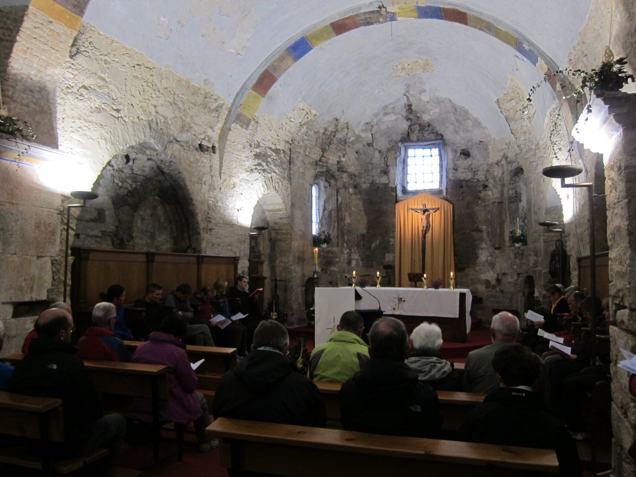 Septiņos pāris vīri melnā uzsāk dziedājumu, daži, kas saprot, kas jādzied, latīniski piebalso. Kādu brīdi padziedājuši i sēdus, i stāvus, ļaudis pievēršas runāšanai. Četri svētceļnieki, katrs savā valodā – vācu, franču, angļu un spāņu – pasaka pāris teikumus. Spāņu lasījumu veic mans draugs Markos. Pēc tam vēl mācītājs drusku parunā angliski un spāniski, un tad pasākums ir galā.