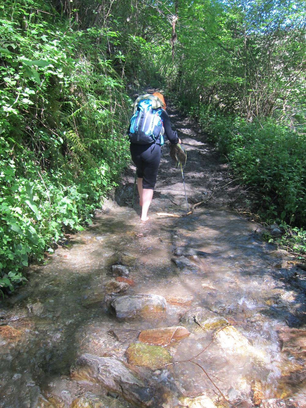 Esam norāpušās lejā no pirmā kalna, kad taka mūs pārsteidz nesagatavotas, pēkšņi pārvēršoties upē. Novelkam zābakus un brienam pāri. Tad parādās nākamā problēma. Upe sadalās vēl divās straumēs, arī ceļi ir vairāki. Ok, vienu var saukt par ceļu, pārējās ir dubļainas takas. Upes krustpunktā krūmos ieaugušas pāris akmeņu ēkas, liecinot, ka šeit kādreiz garām gājuši stipri vairāk svētceļnieki.