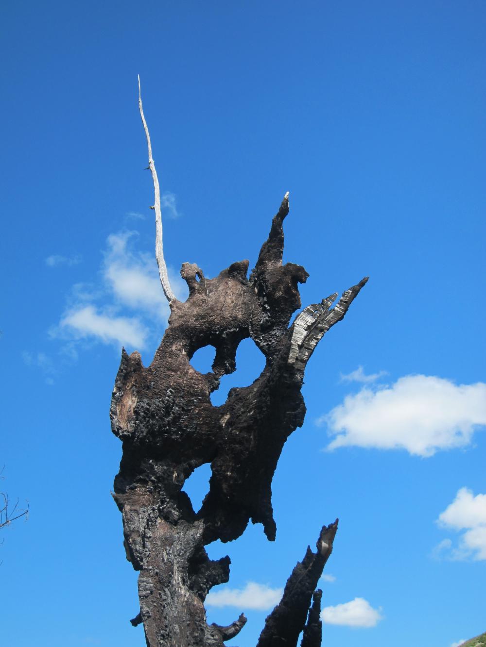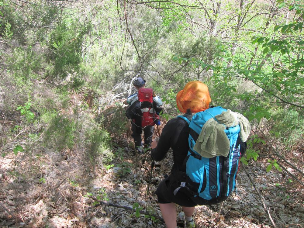 Pēc kolektīvas apspriedes tiek pieņemts lēmums doties tālāk pa dubļaino taku. Uztraušamies kādu gabaliņu pa stāvu nogāzi un tad brienam pa platu, lapām klātu ceļu. Viss šķiet labi līdz brīdim, kad šis ceļš vienkārši izbeidzas klajumā. Un neturpinās ne uz vienu pusi. Varam iet atpakaļ un varam iet pēc azimuta. Izvēlamies pēdējo. Izskatās, ka uzkāpsim krūmiem apauguša kalna virsotnē un tad jau redzēsim, kur ir ceļš. Laužamies cauri krūmiem, kazenājiem, brīžam jātiek augšā pa stāviem klinšu bluķiem. Tā kā man, atšķirībā no pārējiem, nav lielās somas, esmu kalna galā pirmā. Uzkāpju un sāku smieties. No kalna virsotnes visapkārt redzamas vien citas kalnu augšas un vēl biezāki krūmi. Citi gan nesmejas, bet ir dusmīgi. Īpaši tie, kuriem ir šorti un kazenāju radītas asiņainas švīkas uz kājām.