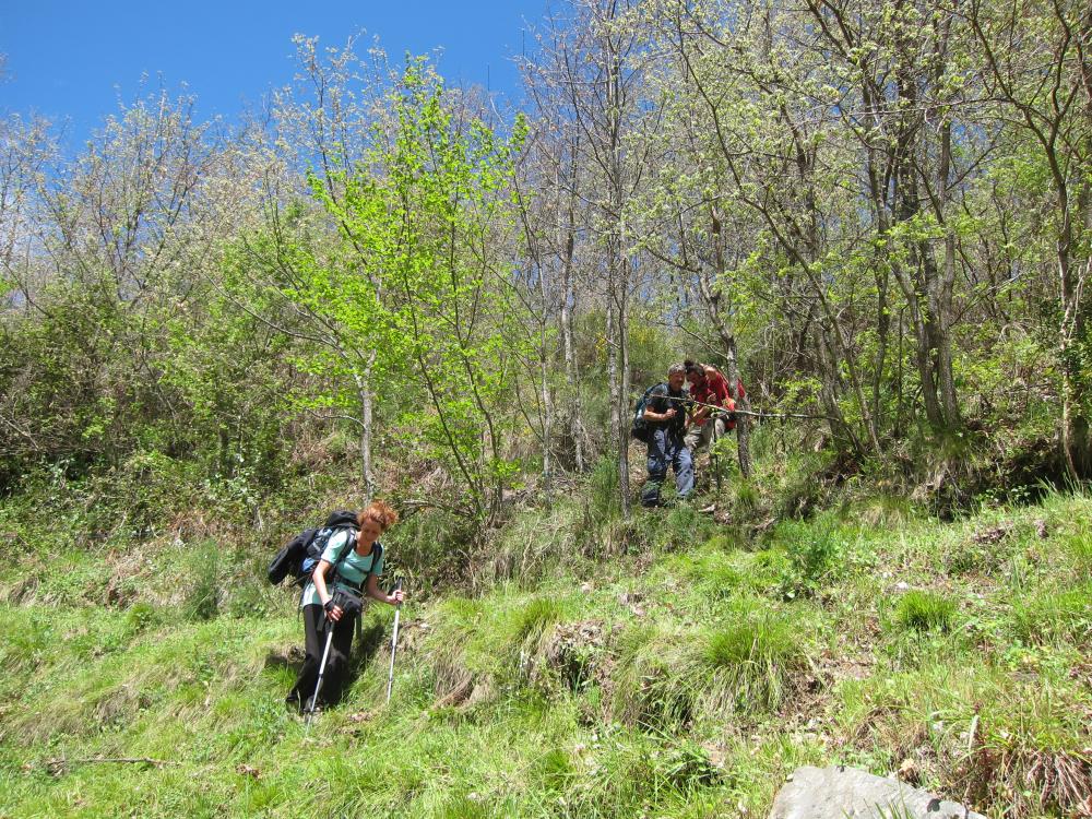 Laužamies pa kalnu uz priekšu līdz beidzot tiekam līdz glītai pļavai. Šķērsojam pļavu un esam… uz mistiskā kārtā esam trāpījuši uz pareizā ceļa. Tas vijas augšup un ceļa malās aug majestātiski milzu koki un redzamas mūra drupas. Pēc krietna kāpiena esam kalna augšā pie vientuļas baznīcas.