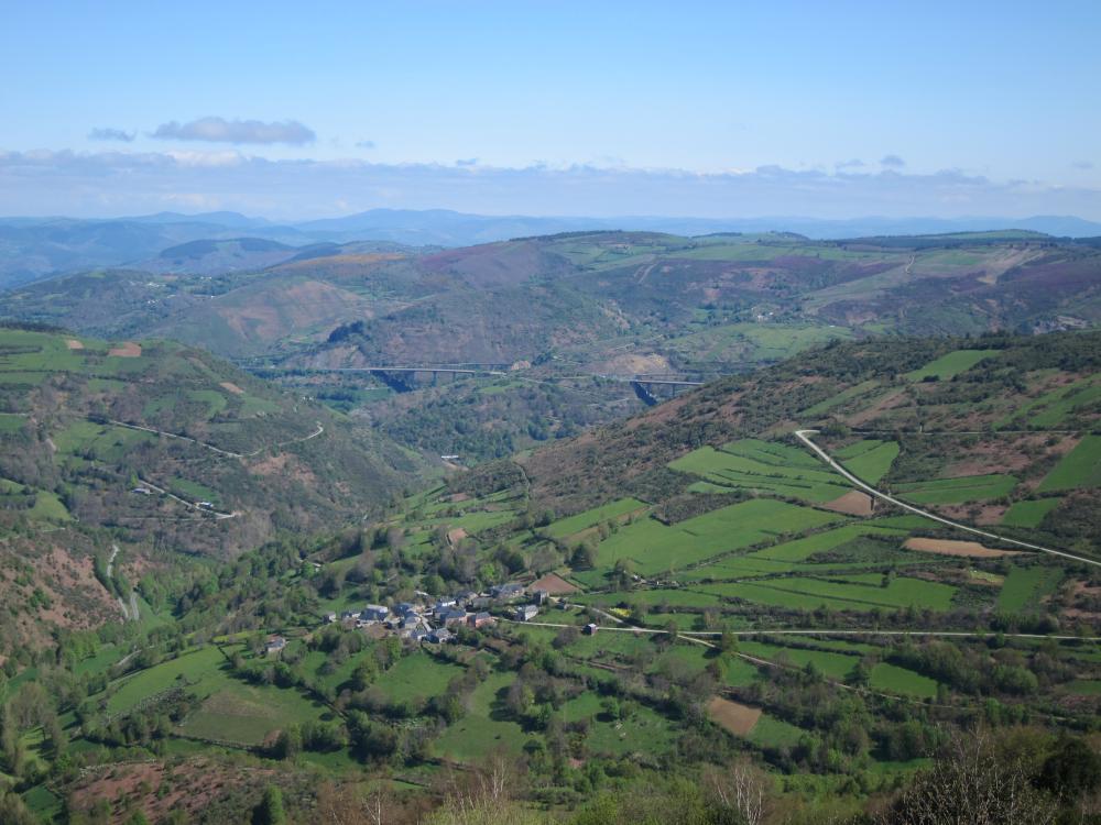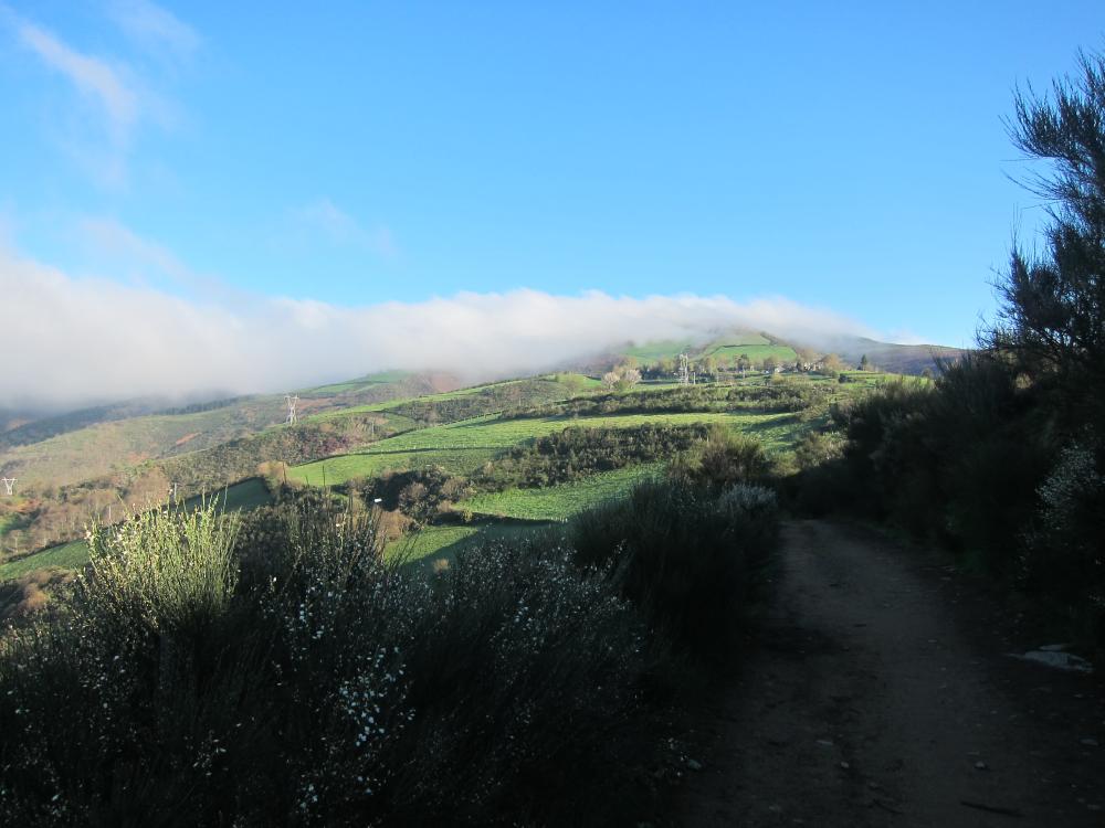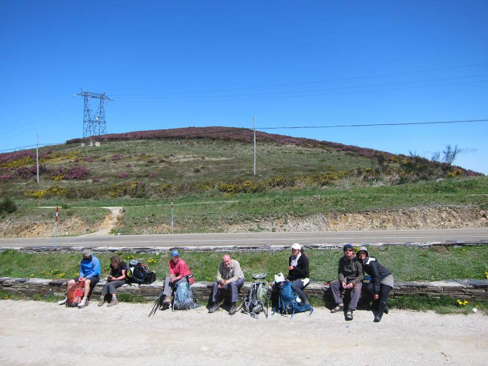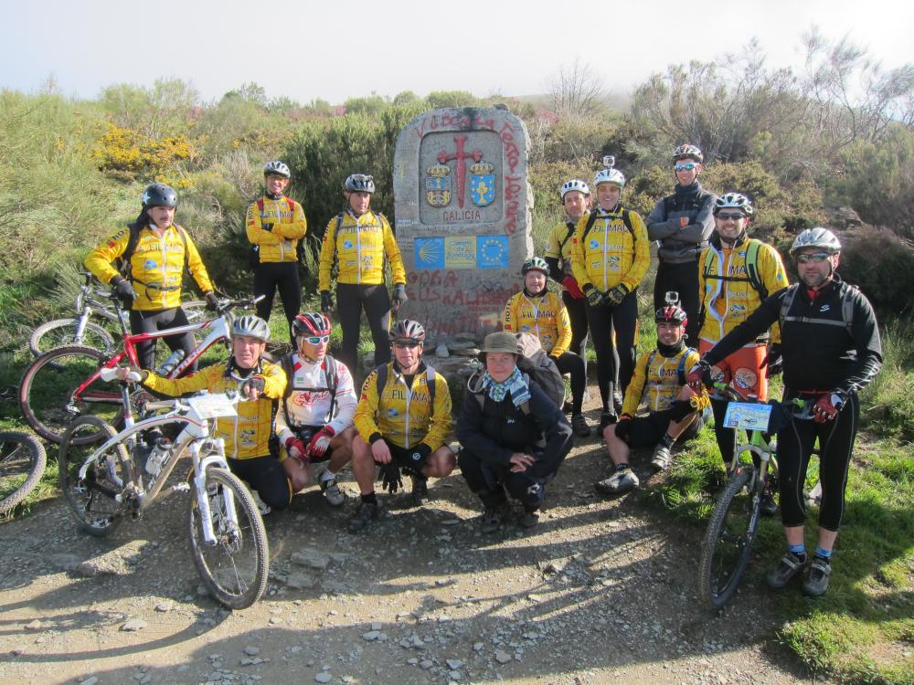Lēnām rāpjos kārtējā kalnā, kura galā nolemju iedzert tēju un apēst bageti. Kamēr ieturos, vēroju kā ceļam pošas mani vakardien sastaptie riteņbraucēji. Viņi līdz Santjago tiks trīs dienās, mērojot vairāk kā 200 km. Tāds nedēļas nogales pasākums. Turpinu ceļu nākamajā kalnā, kad pamanu, ka arī riteņbraucēji izvēlējušies kalnu taku, nevis autoceļu. No malas izskatās dikti grūti, droši vien ir arī. Šie pabrauc man garam, bet pēc nākamā līkuma redzu šos satupušus ap robežzīmi, kas vēsta, ka ierodamies Galīcijā. Es piedāvājos šos nobildēt visus kopā, viņi par to dikti priecājas un pēc tam aicina mani arī ar šiem nobildēties, par ko es, savukārt, sapriecājos.
