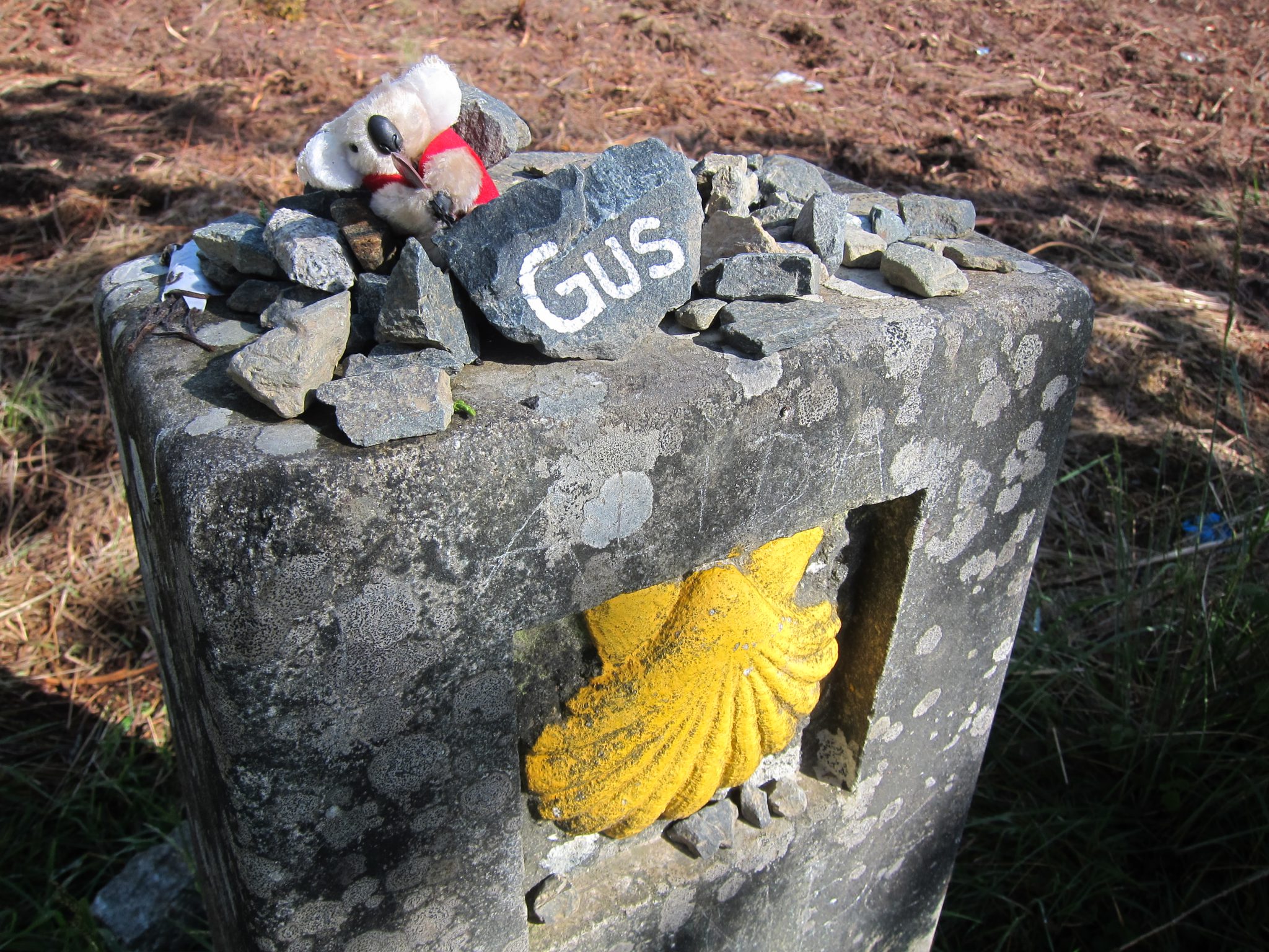 Esmu tikusi līdz pusceļam, kad kādā ielejā ieraugu stāvam puisi ar velosipēdu un videokameru. Sākumā domāju, ka viņš uzlicis uz statīva kameru, lai sevi nofotografētu. Tad piefiksēju, ka ap viņu ir daudz lielāka “saimniecība” un viņš šeit gribētājiem iespiež “pasē” savu zīmodziņu. Man paiet krietns brīdis pļāpājot ar jaunieti, kamēr pamanu, ka viņam vienas kājas vietā ir protēze. Viņš smejas un rāda zīmodziņā – tur esot redzama arī viņa protēze. Puisis Jonats no Rumānijas ir veiksmīgi startējis kā atlēts paralimpiskajās spēlēs, bet tagad braukā pa Camino ar velosipēdu, cilvēki ziedo viņa projekta atbalstam šeit, Camino vai mājas lapā (http://www.ionutpreda.com/). Viņš, pajautājis no kurienes esmu, šķirsta savu biezo ziedotāju kladi un grib man parādīt kādu ierakstu no pagājušā gada, kur esot ziedojis kāds no Latvijas. Šķirsta viņš ilgi un es jau gatavojos vērt vaļā muti un teikt, ka būs jau labi, lai viņš nemeklē, kad ieraugu no kalna nākam trīs cilvēkus. Eds, Sems un… Sesilja! Seko priecīgais apkampšanās rituāls, drīz garām iet arī austrāļu kungi – iemūžinu visus kopā ar sportistu. Tikmēr Jonats ir atradis meklēto ierakstu un paziņo, ka tas tomēr esot no Igaunijas. Tā kā esmu valsts ziņā “rets eksemplārs”, Jonats mani aicina pie kameras ierunāt īsu tekstiņu savā valodā, ko es, protams, ar prieku izdaru.