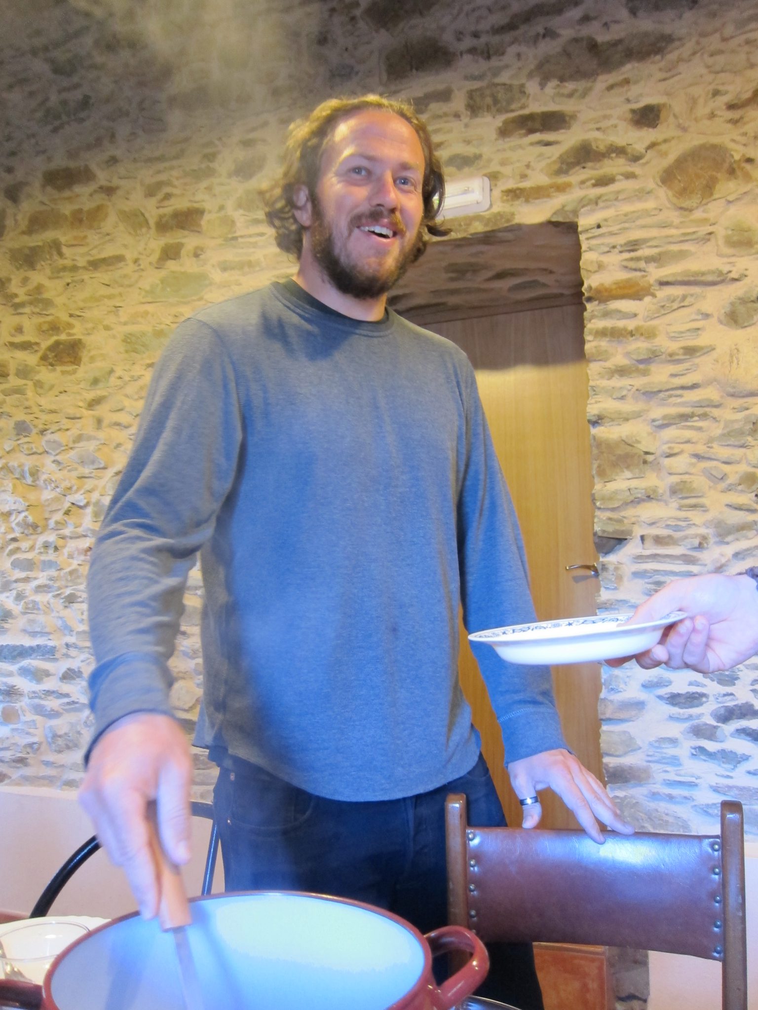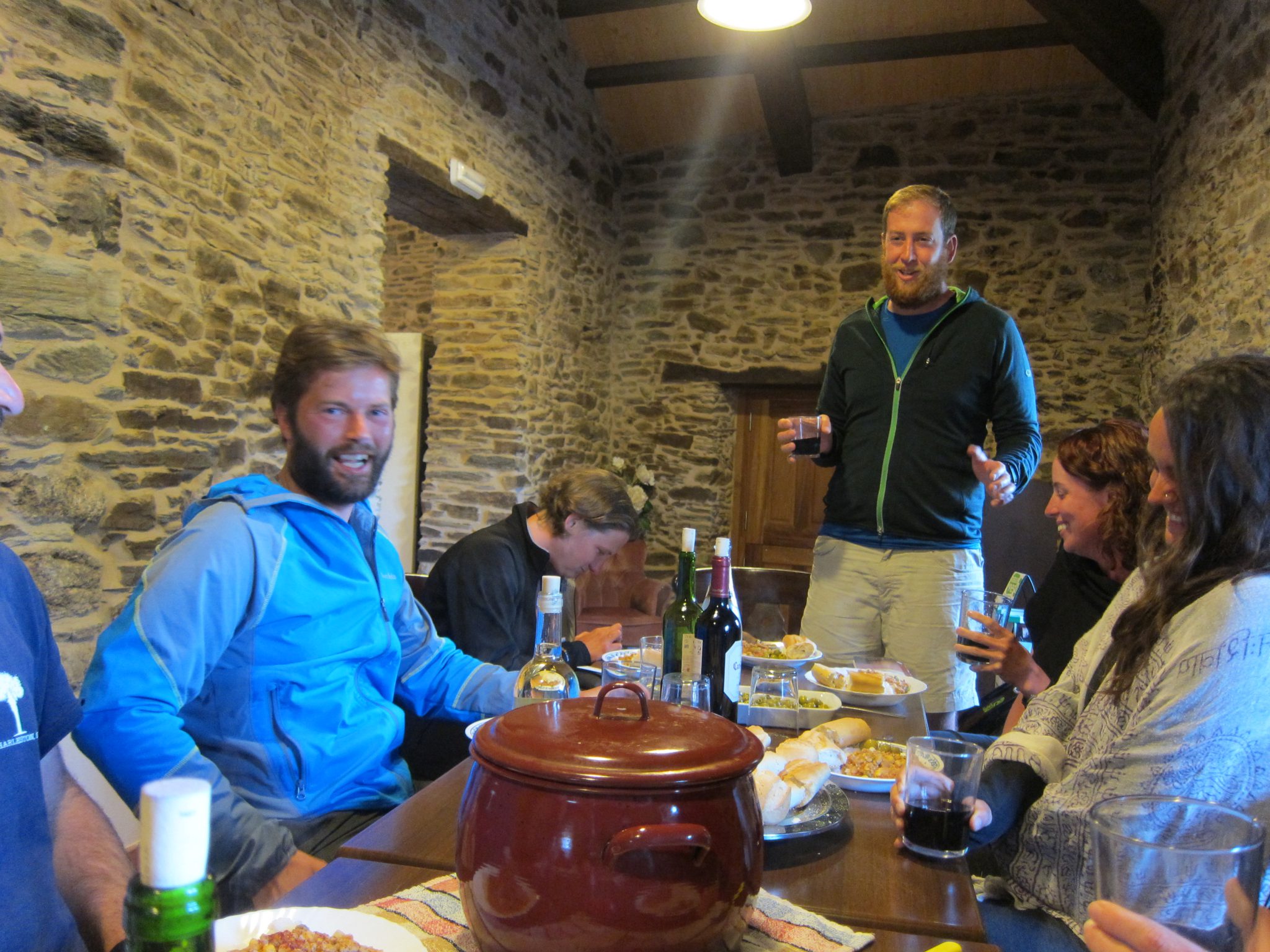 Pirms vakariņām pie glīti servēta galda, Tims tiek aicināts teikt uzrunu. Viņš runā par Ceļu, tulznām, kopā pavadīto laiku un draudzību. Viens no kompānijas saņem ziņu no paziņas, kas nesen sācis iet Ceļu, ka viņš nav varējis dabūt vietu alberģē jau kaut kur Ceļa sākumā. Nākamais tosts tiek uzsaukts pa jokam nosodot visus, kas sākuši iet vēlāk kā mēs. Rītdienas naktsmītnē nebūs virtuves, tāpēc šīs ir pēdējās, kopīgās pašu gatavotās vakariņas Ceļā.