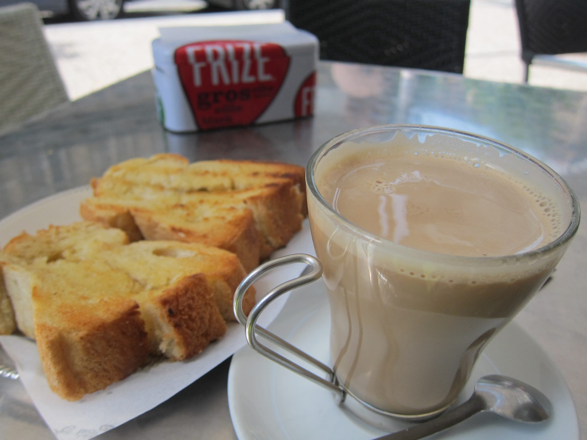 Sākumā “sabļaujamies” no blakus galdiņiem, bet, ar mērķi parādīt dažas Santjago ceļa bildes, piesēžu pie šiem. Runājam par Ceļu, ceļošanu un latviešiem – kuri ir visur. Saruna aizvirzās līdz ārzemju latviešiem un viņu latviešu valodai. Pastāstu par savu tikšanos ar latviešiem Austrālijā, un dzirdu stāstu par kādu Amerikas latvieti, kura apguvusi latviešu valodu ārpus Latvijas, kā rezultātā nav zinājusi tādus, pie mums pašsaprotamus vārdus kā “luksofors”. Viņai bijis pazīstams apzīmējums, tulkojums no angļu valodas – “satiksmes gaismas”. Un vēl izcilāks bijis apzīmējums sastrēgumiem – “satiksmes ievārījums”!