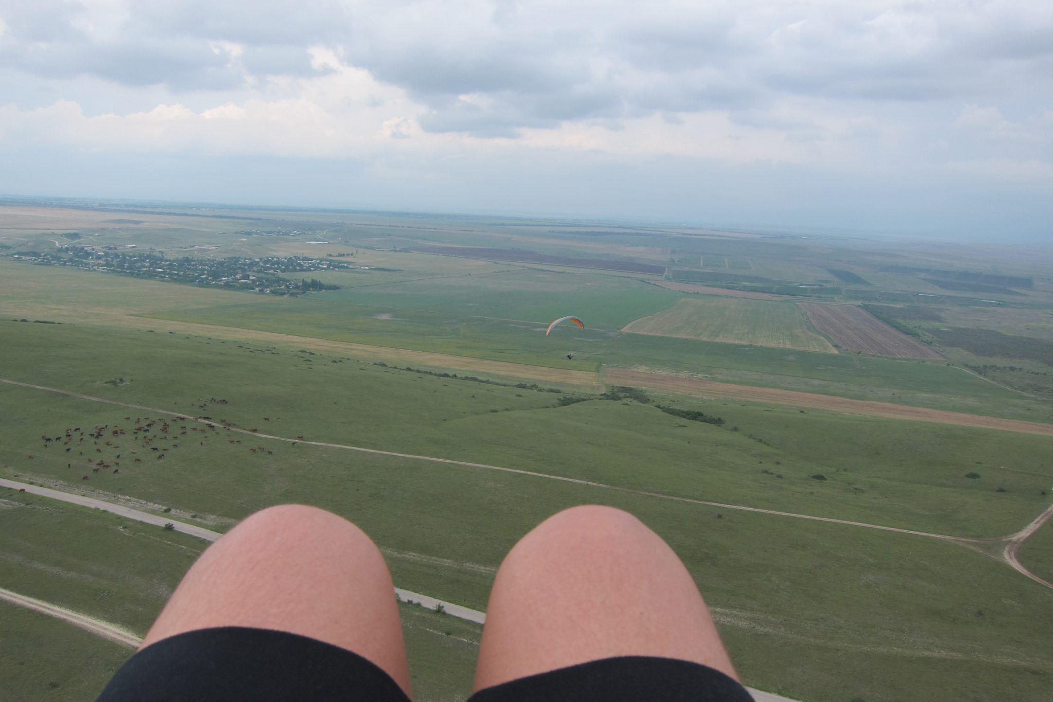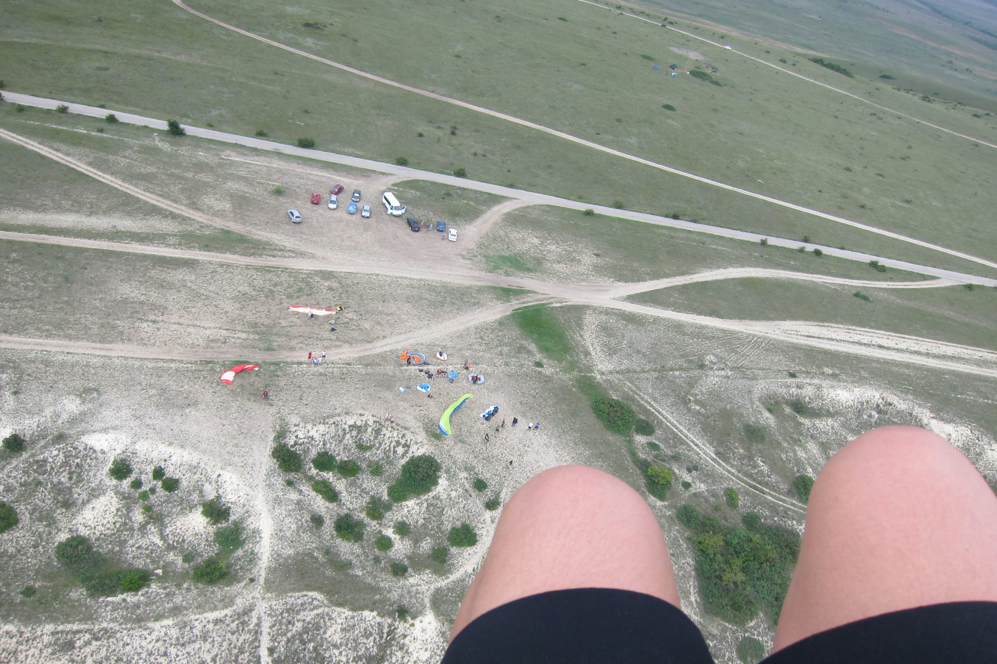 Tad sākas pasākums, no kura man mazlietiņ bail – nosēšanās. Var just, ka Sergejs sāk virzīt paraplānu “na posadku”. Arī lejas džeki sāk iespringt un skriet pretim. Tomēr vējš iegriežas no otras puses un paraplānu neizdodas nosēdināt. Mēs atkal pārlidojam kalnu korei un esam ielejā. Sergejs rūpīgi tver vismazākās vēsmiņas un palēnām, palēnām atkal virza mūs kalna plaknes virzienā. Ar otro reizi nosēšanās izdodas un mēs nokrītam kā pieneņpūkas zālē – maigi un liegi. Es pateicos Sergejam par piedzīvojumu, viņš atzīst, ka šoreiz lidot bijis izaicinoši, līdz ar to arī interesanti.