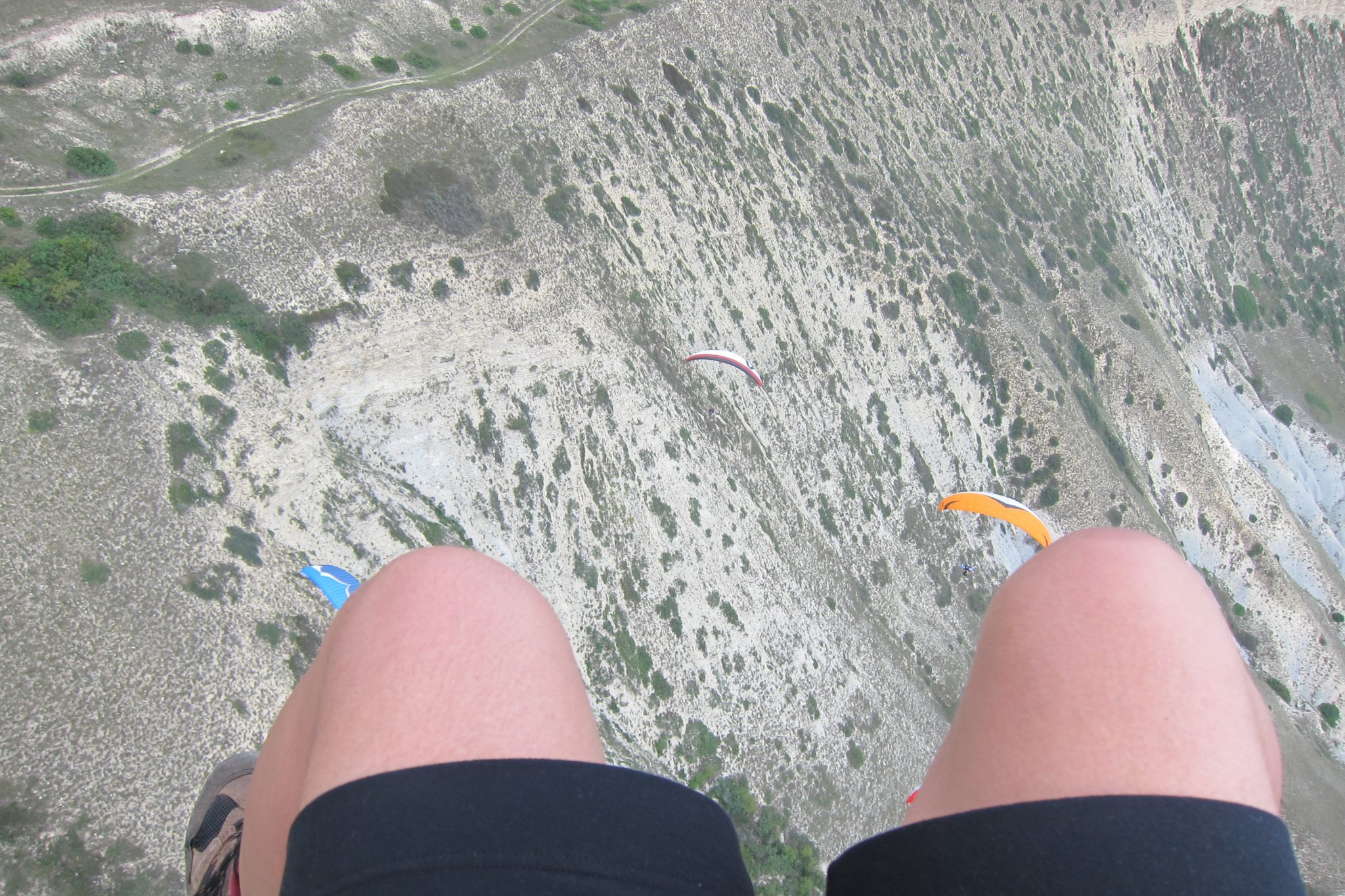 “Nu, labs ir, mēģinās”, Sergejs ir izlēmis un es tieku iestiprināta “bērnu sēdeklītī” un piekabināta priekšā Sergejam. Tāda īsta pārliecība, ka pacelsimies, man nav, un trakākais – man šķiet, ka tādas nav arī Sergejam. Vējš ne tā iegriež buru un mēs pāris metrus šķībi nosteberējam pa zāli, līdz kompanjoni mūs satver un, ar mātes vārdu pavadīti, tiekam ievilkti pareizajā, klints malas virzienā.