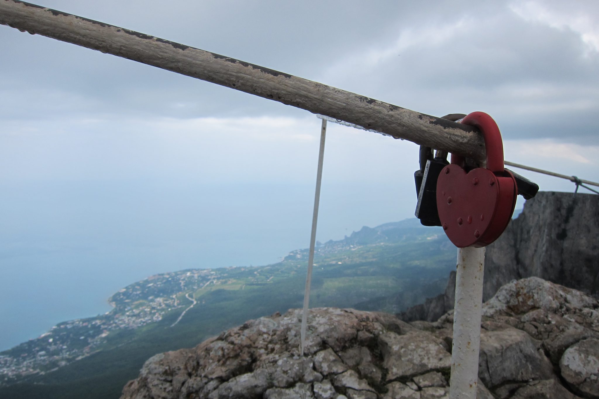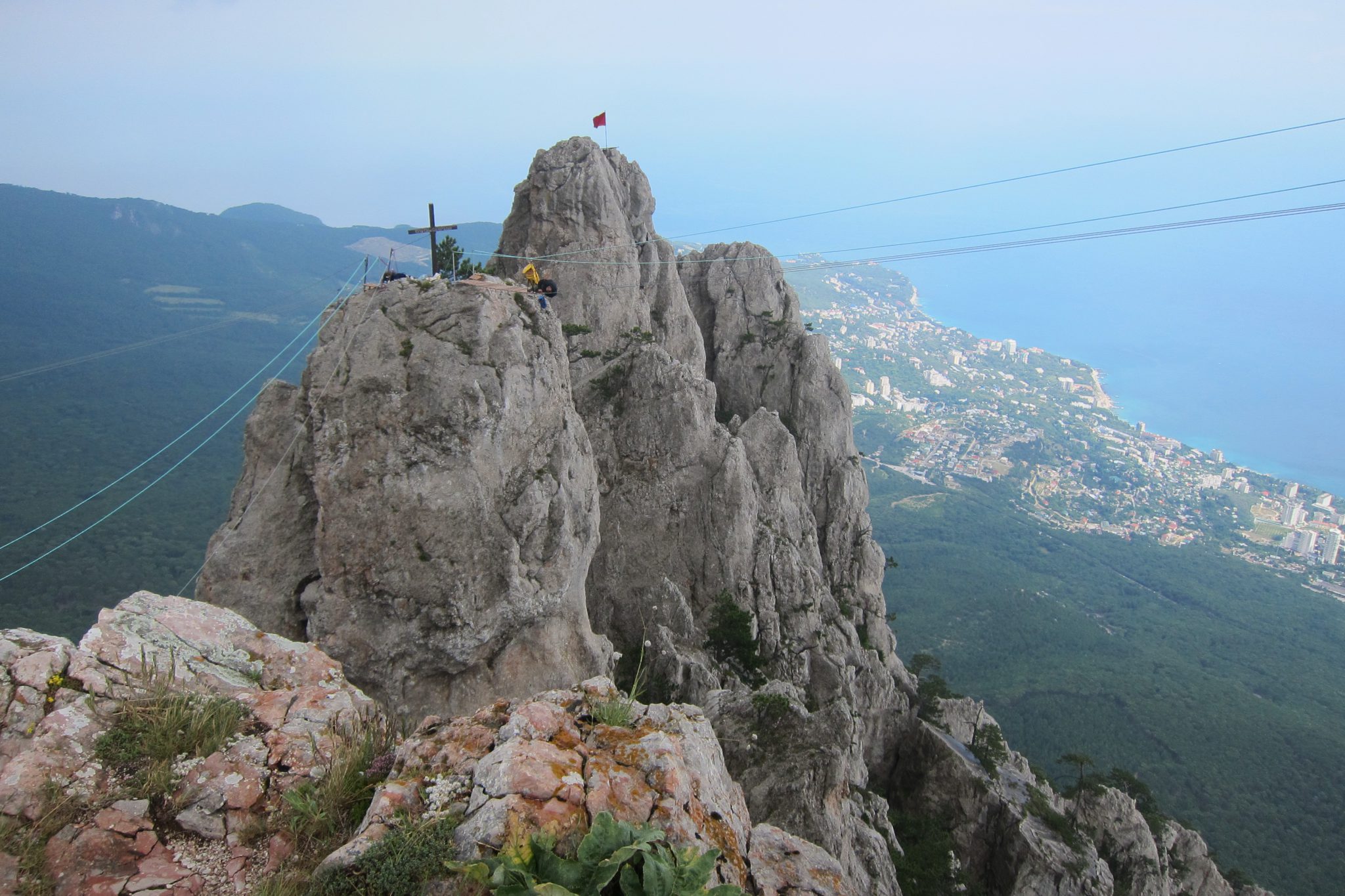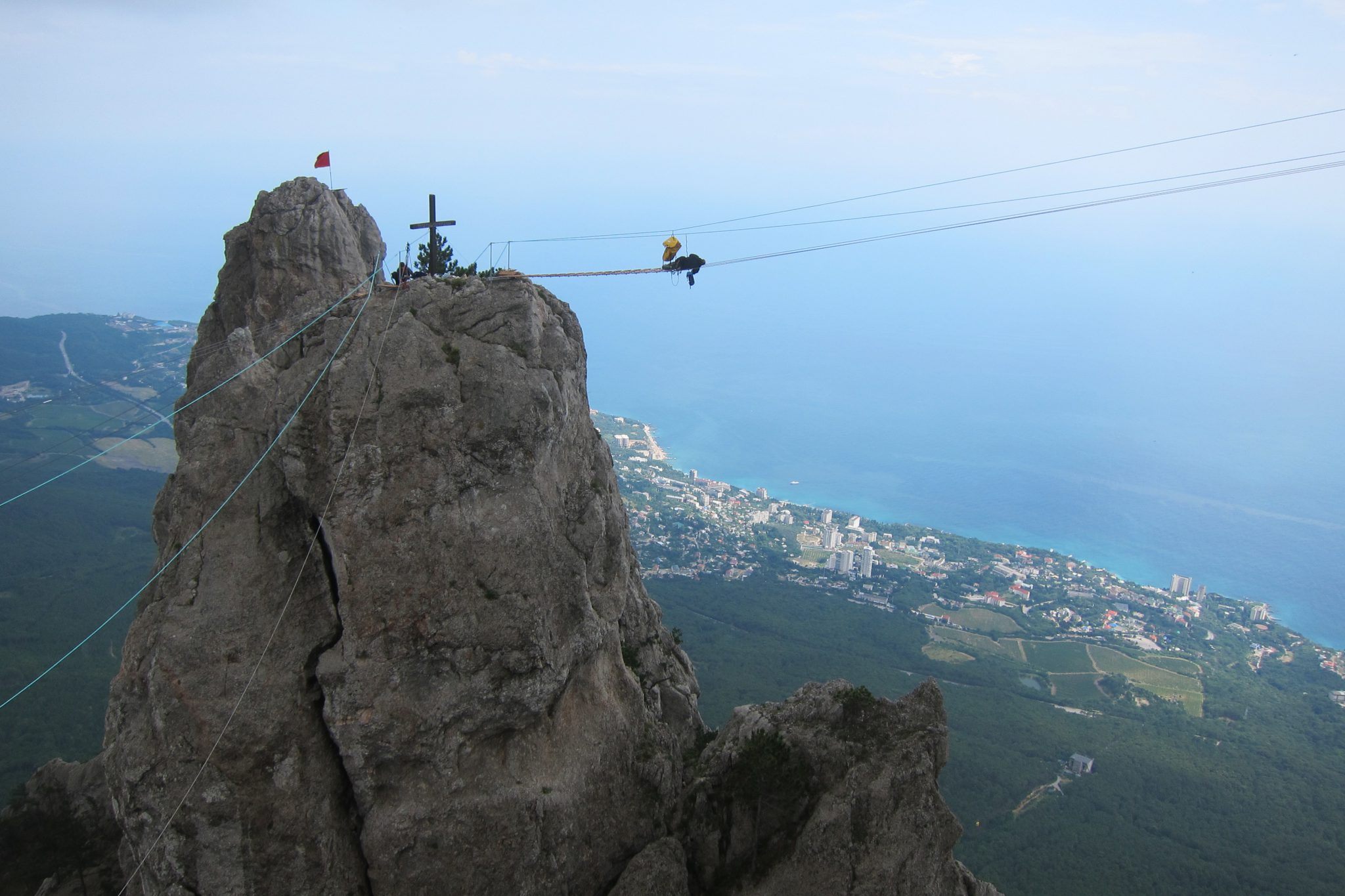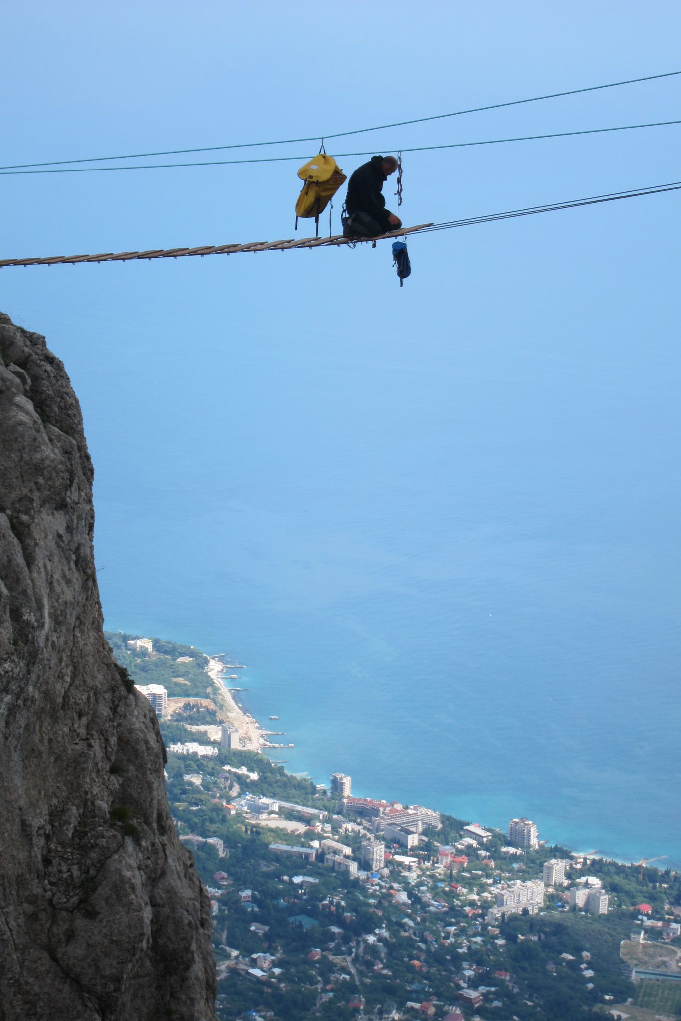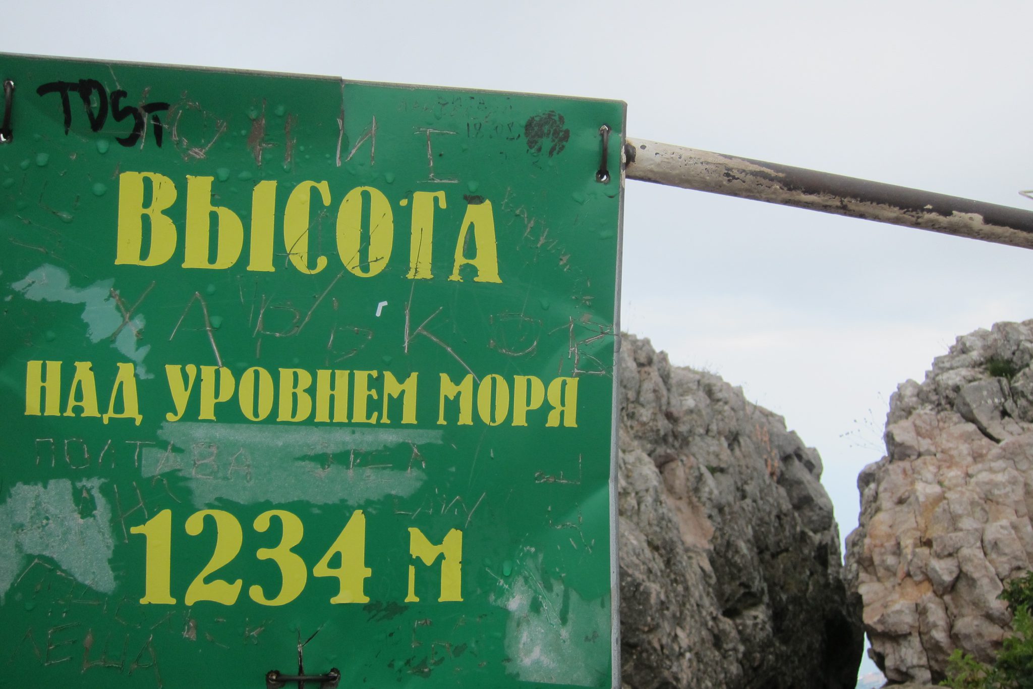 Iesākumā nolemju uzkāpt līdz šejienes augstākajam punktam. Tur “nokāš” vēl 20 grivnas. Pa akmeņainu un dubļainu taciņu var tikt līdz klintīm, un vēl pēc gabaliņa esmu augšā pie cipara, ko viegli atcerēties: 1234 metri virs jūras līmeņa. Uz blakus esošās klints smailes uztupināts krusts un uz šo vietu tiek būvēti gaisa tiltiņi. Man galva reibt un kājas tirpst vien skatoties uz vīrieti, kurš stiprina pie trosēm dēlīšus.