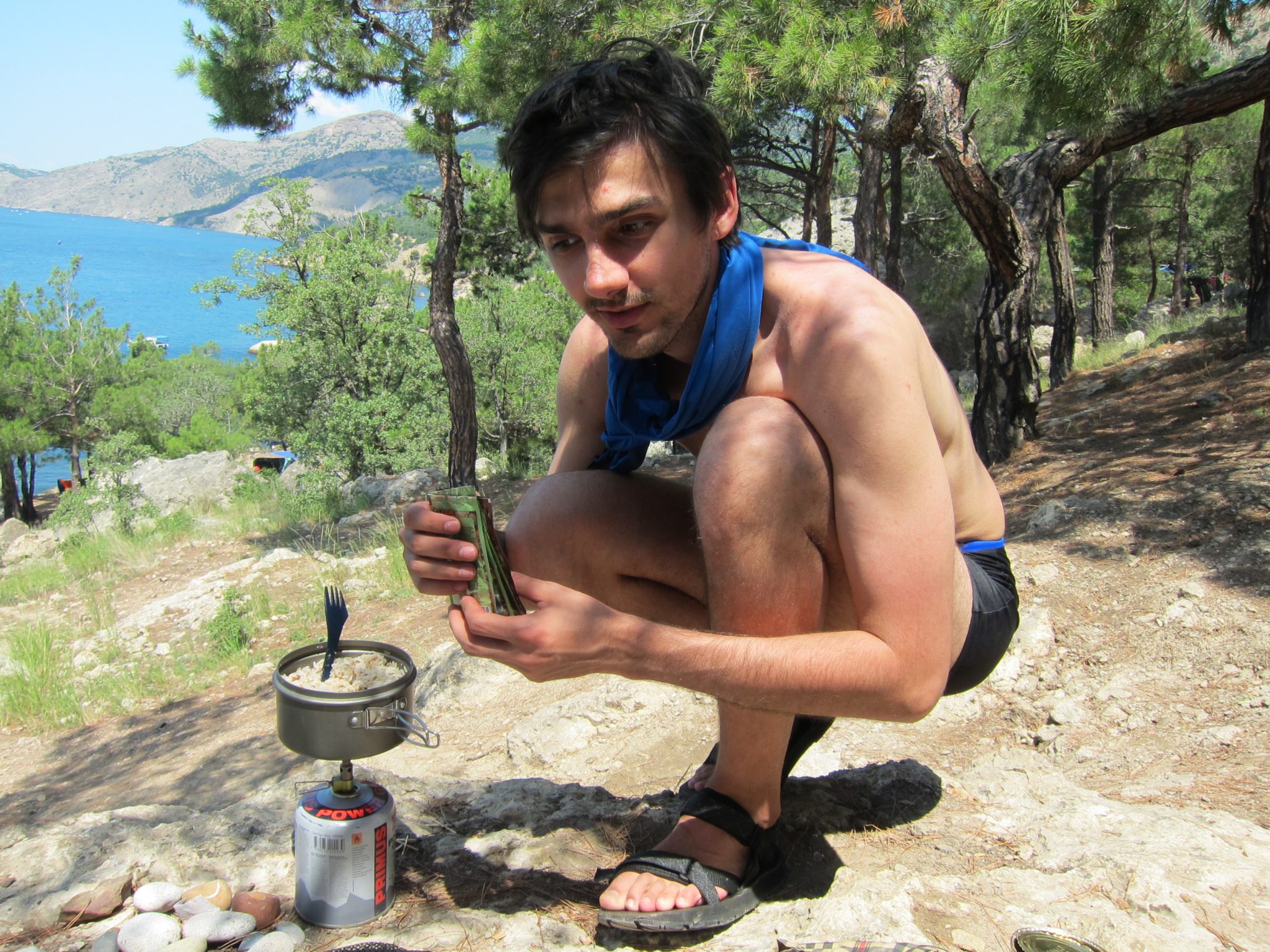 Mēs no šīs atrakcijas izvairījāmies, jo puišiem bija līdzi mazie gāzes baloniņi, attiecīgi mēs ēst gatavojām uz gāzes plītiņas. Laikam gan attiecināt vārdu “mēs” būtu godīgi tikai uz ēšanu, jo gatavoja Aleksandrs. Mēs tikai pamanījāmies piededzināt rupjmaizi un izkausēt vienu plastmasas karoti, jo mēģinjām pagatavot ķieģelīša grauzdiņus šprotu eļļā. Tā nebija gudra doma. Attaisnojumam varam vien teikt, ka tā nebija mūsējā, bet mēs ar savu izpildījumu pilnībā pierādījām iepriekš izteiktā apgalvojuma patiesumu.