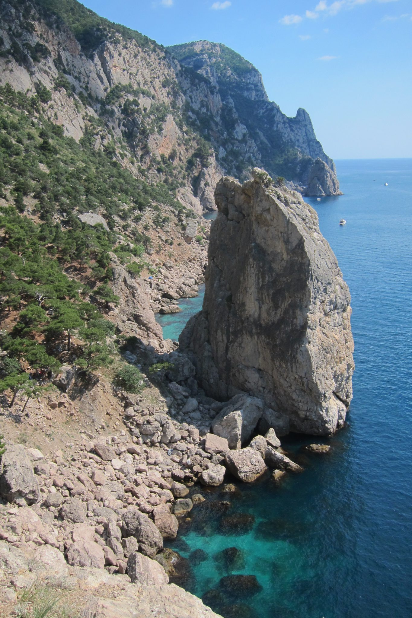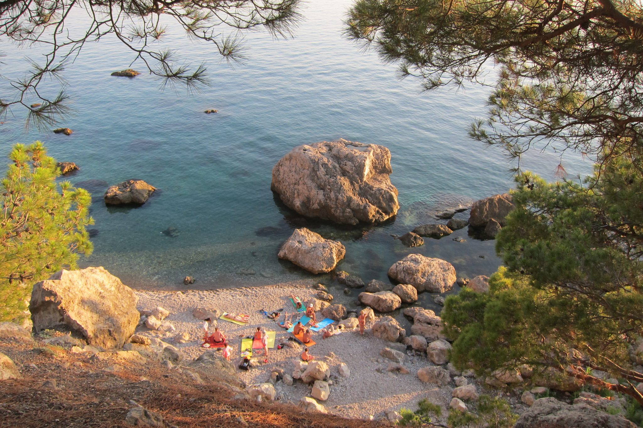 Tad bija vēl divas ievērības cienīgas atrakcijas. Lai tiktu līdz jūrai peldēties, pa īsāko ceļu jākāpj lejup metrus divdesmit, trīsdesmit, rāpelejot pa klints bluķiem, vai arī jāmēro diezgan garš apkārtceļš, kas arī nav rožu ziedlapiņām kaisīts. Tad, lai iebristu jūrā, jābūt faķīram vai rūdītam lauciniekam, jo smilšainas pludmales vietā zem kājām ir asi oļi. “Basas kājas, asi oļi, vai cik grūti man”, var gaudot čigānmeitas dziesmu vai mesties četrāpus vēl nepieskaroties ūdenim. Es darīju abus. Kad tiek iekšā un var laisties peldus, tad gan ir feini – ūdens šajā krastā ir silts un ļoti dzidrs. Sāļš gan arī, jāatzīst. Lielie piekrastes akmeņi ir īsti piemēroti, lai tajos uzrāptos un tad lektu jūrā. Pamatā to darīja mazi puišeļi un slaiki jaunieši. Un es.