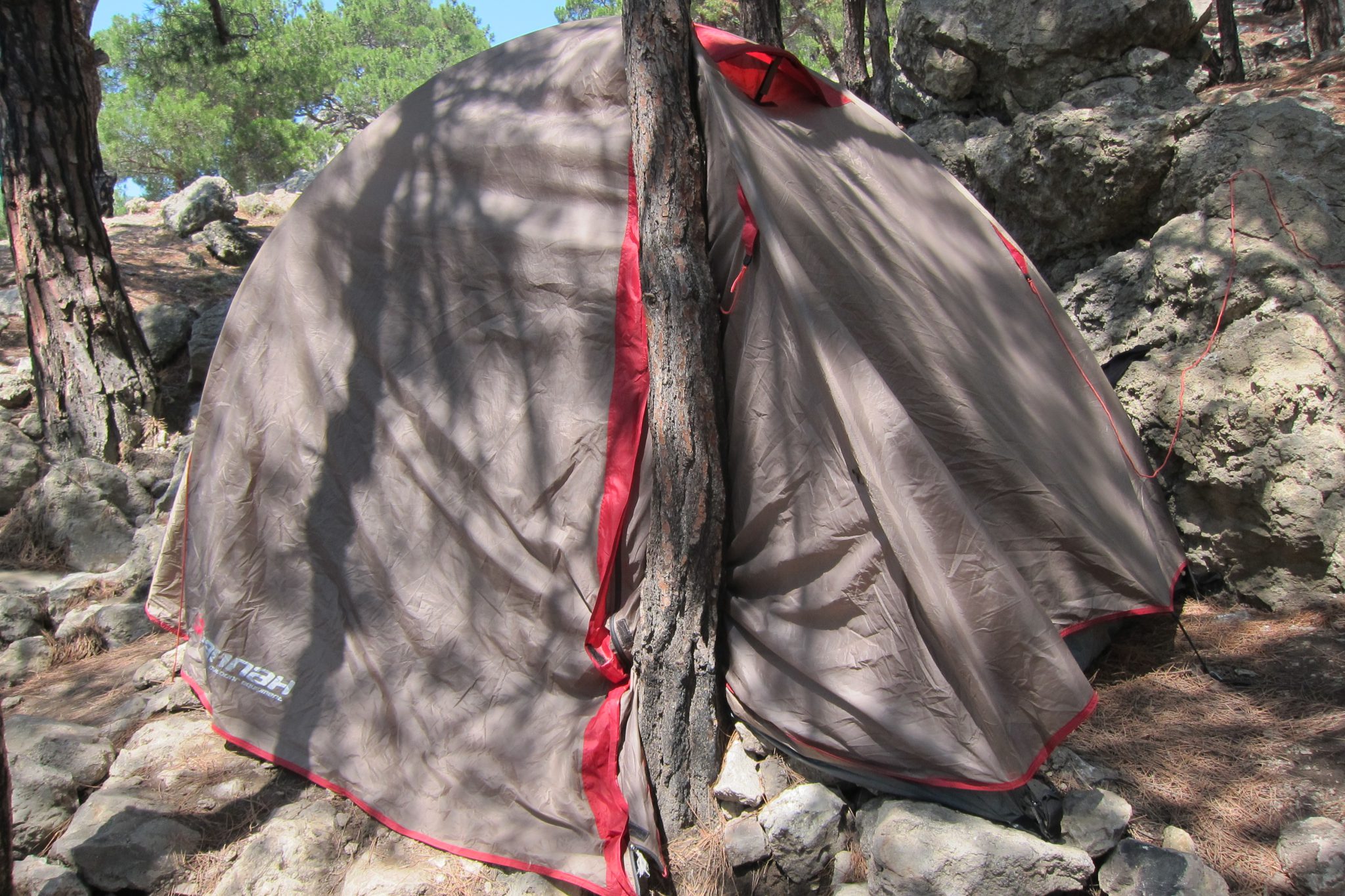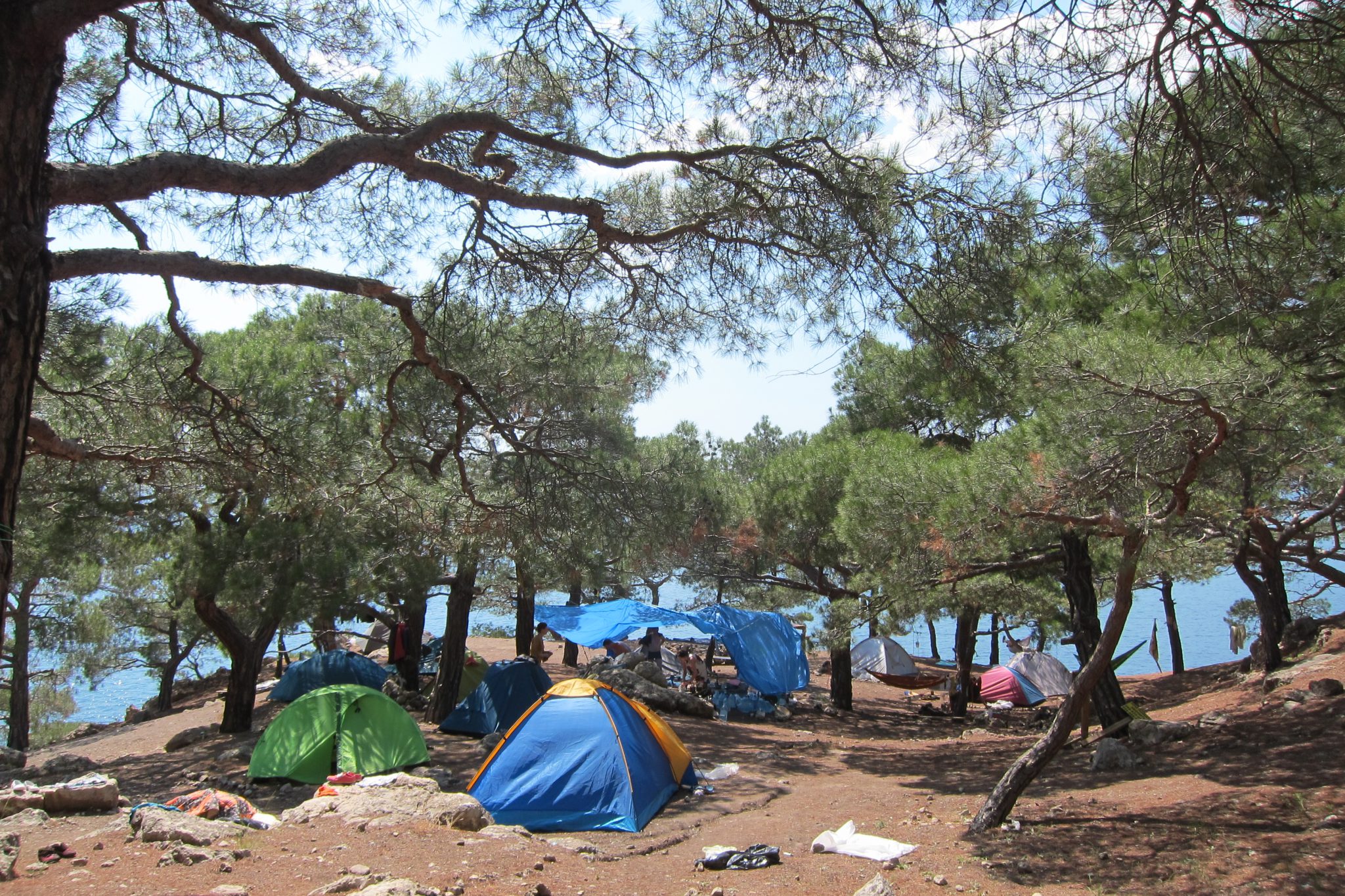 Jūras klinšainais krasts ir biezi apdzīvots. Teju katrā līdzenajā vietā, kuru šeit nav daudz, jau slejas telts. Mums vēlajā vakarā izdevās atrast mazu, skujām noklātu pleķīti starp divām priedēm un palielu akmens bluķi. Īsti līdzena virsma arī šeit nebija un parasti naktī apgūlāmies vienā telts malā, bet no rīta modāmies otrā.