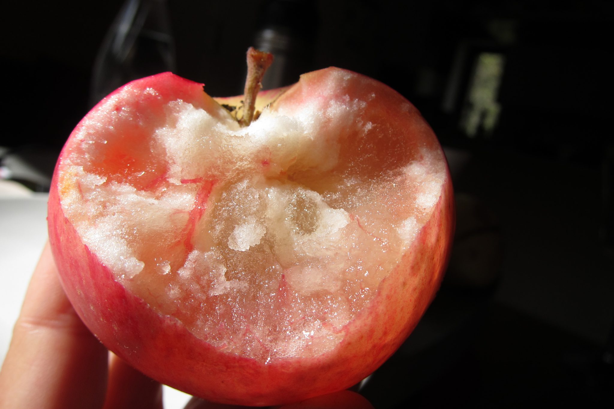 Madonas laukos krūmi sodīti ar sadedzināšanu sārtā un āboli no karstuma vēl kokā izcepušies. Un citi paši pārsprāguši no lepnības vai gatavības. Citi nobūkšķināti zemē. Citi rūpīgi pa vienam lejā nožonglēti. Viens bračka otram bračkam, otrs bračka man, es grozā, grozs mašīnā.