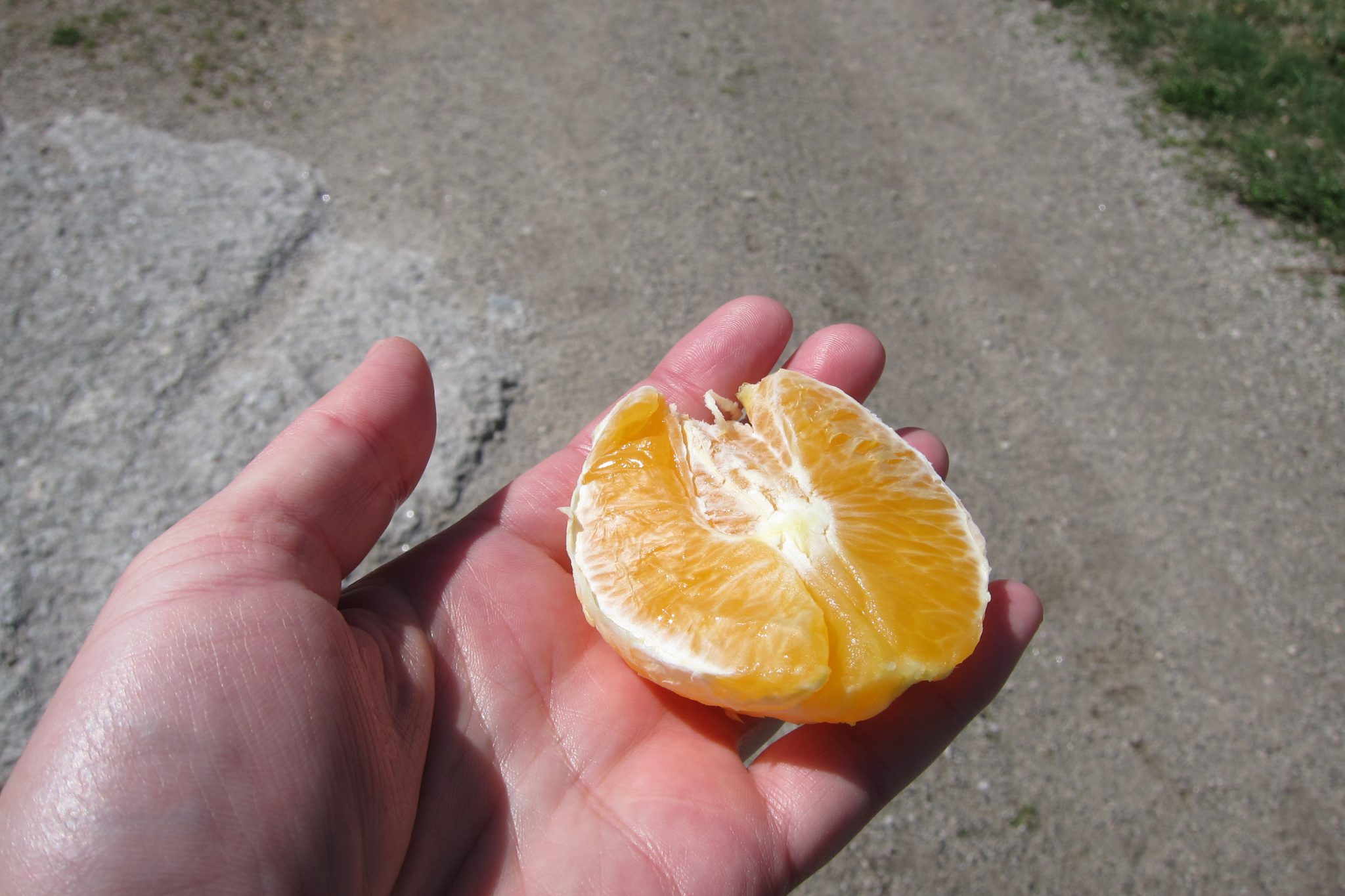 Līdz pulksten vieniem nesatieku nevienu ceļabiedru. Bet vienos, aiz kāda līkuma, stāv mans “you eat” franču kungs un, protams, stumj aiz vaiga. Ieraudzījis mani, viņš no prieka sāk teju jodelēt. Esmu gatava saderēt, ka arī viņš nevienu šodien vēl nav redzējis. Mirkli pašausmināmies par grūto vakardienu un tad viņš man prasa, kur es šonakt palikšot. Kad atbildu, ka nezinu, viņš sāk smieties. Vispār frančus dikti uzjautrina fakts, ka es neko nerezevēju. Kā arī tas, ka ceļoju pa Francijas laukiem, nezinot franču valodu. Bet, kā saka – so far, so good – viss, kā parasti, atrisinās vislabākajā veidā un man nav ne mazāko iemeslu sūdzēties. Uz atvadām kungs man sniedz trešdaļu apelsīna. Sākumā atsakos, bet viņš tik uzstājīgi saka “for you, for you”, ka labs ir – paņemšu ar. Bija gards, jāatzīst. Apelsīns ir uzkurinājis apetīti un drīz piesēžu pie kādas ciet esošas naktsmītnes paēst pusdienas – bageti ar olu un sieru. Tikmēr kungs mani ir panācis un jau gatavojas pievienoties uz kafiju, bet uzzinājis, ka šī vieta ir ciet, aizsteidzas tālāk.