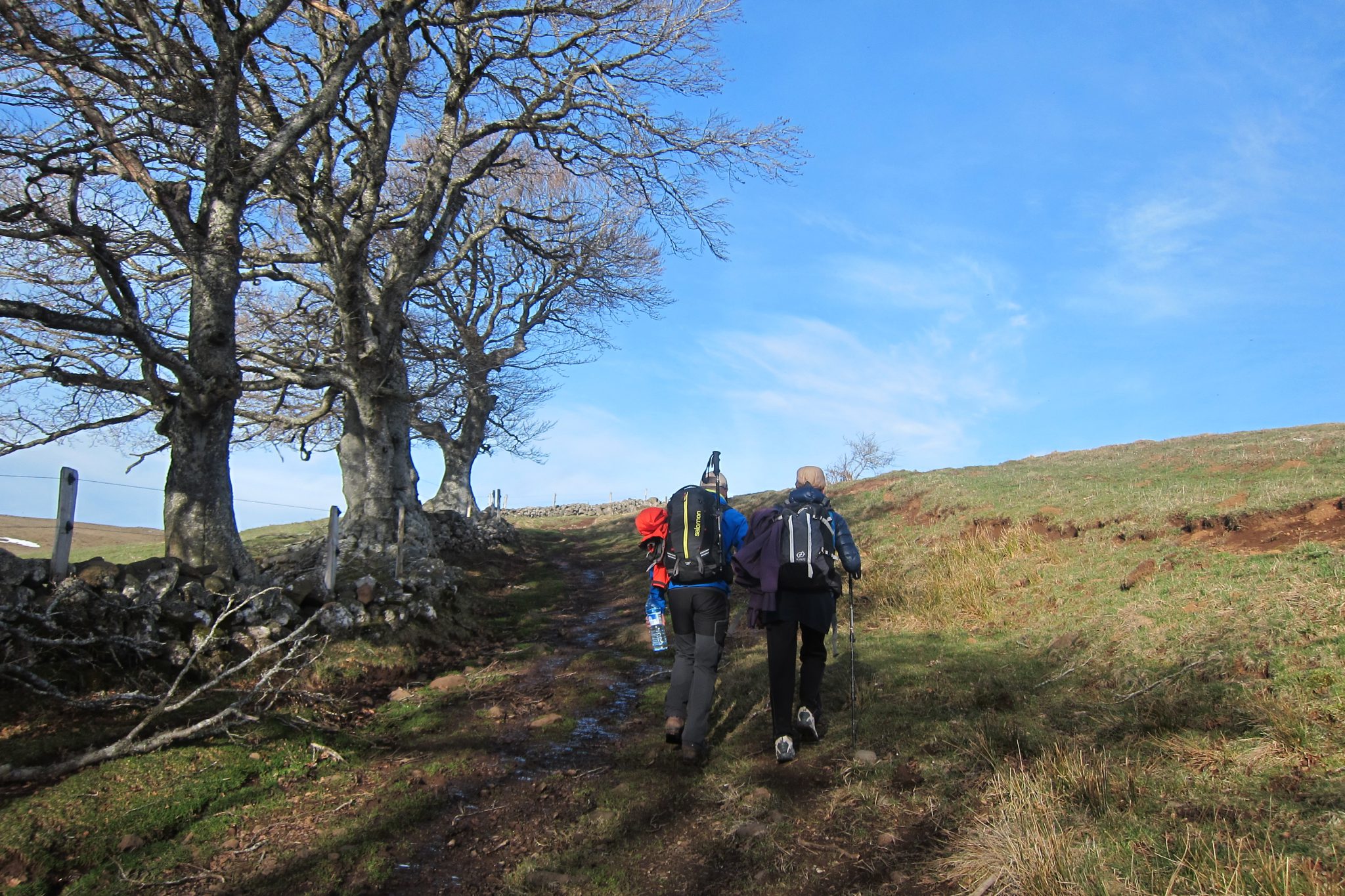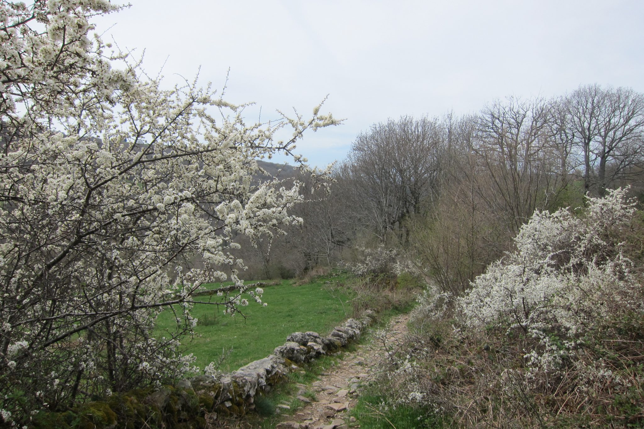 Kad ceļš sāk atkal vīties lejup, top zaļāks līdz ar katru noieto kilometru. Kokiem parādās lapas, zāle ir zaļāka un acis (un degunu) priecē arvien jaunas, tikko atplaukušas puķes. Gribu tās nofotografēt tuvplānā, bet ir divas problēmas. Pirmā – nav viegli noliekties vai pietupties ar lielo somu. Otrā un galvenā – mana dzirdināšanas sistēma ir sagājusi grīstē un kolīdz šļūciņas uzgalis nav vertikāli, no tā līst kā no pārpilnības raga. Tas reāli kaitina. Pat mazliet saliecoties uz priekšu, viss līst laukā un, ja netīšām gadās nolikt somu ne gluži vertikāli, arī tad var gadīties slapjš pleķis zem tās. Vispār esmu apmierināta ar saviem Gandrā iegādātajiem ceļošanas pričendāļiem, bet nu šis gan ir fēlers.