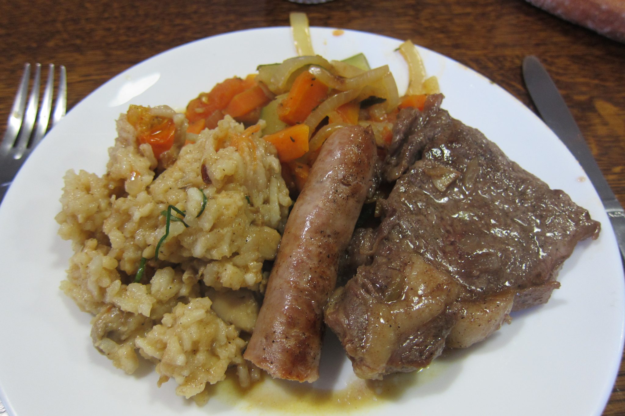 Kad atgriežos žitā, virtuvē viss notiek. Pirms brīža vīri ar savu gatavošanas entuziasmu bija pat ugunsdzēsības signalizāciju iedarbinājuši. Īsi pēc septiņiem vakariņas ir galdā un šovakar mielojamies ar gaļu un desiņām, risotto, dārzeņu sautējumu, sparģeļiem un vīnu. Baigi lēti no galviņas nesanāk, tāpat kā vakar – ceineris no deguna, bet ēdiens ir gards un var pieēsties, cik lien. Palikšana žitā maksā 14, 50 eiro un nauda vienkārši jāsaliek aploksnē uz galda.