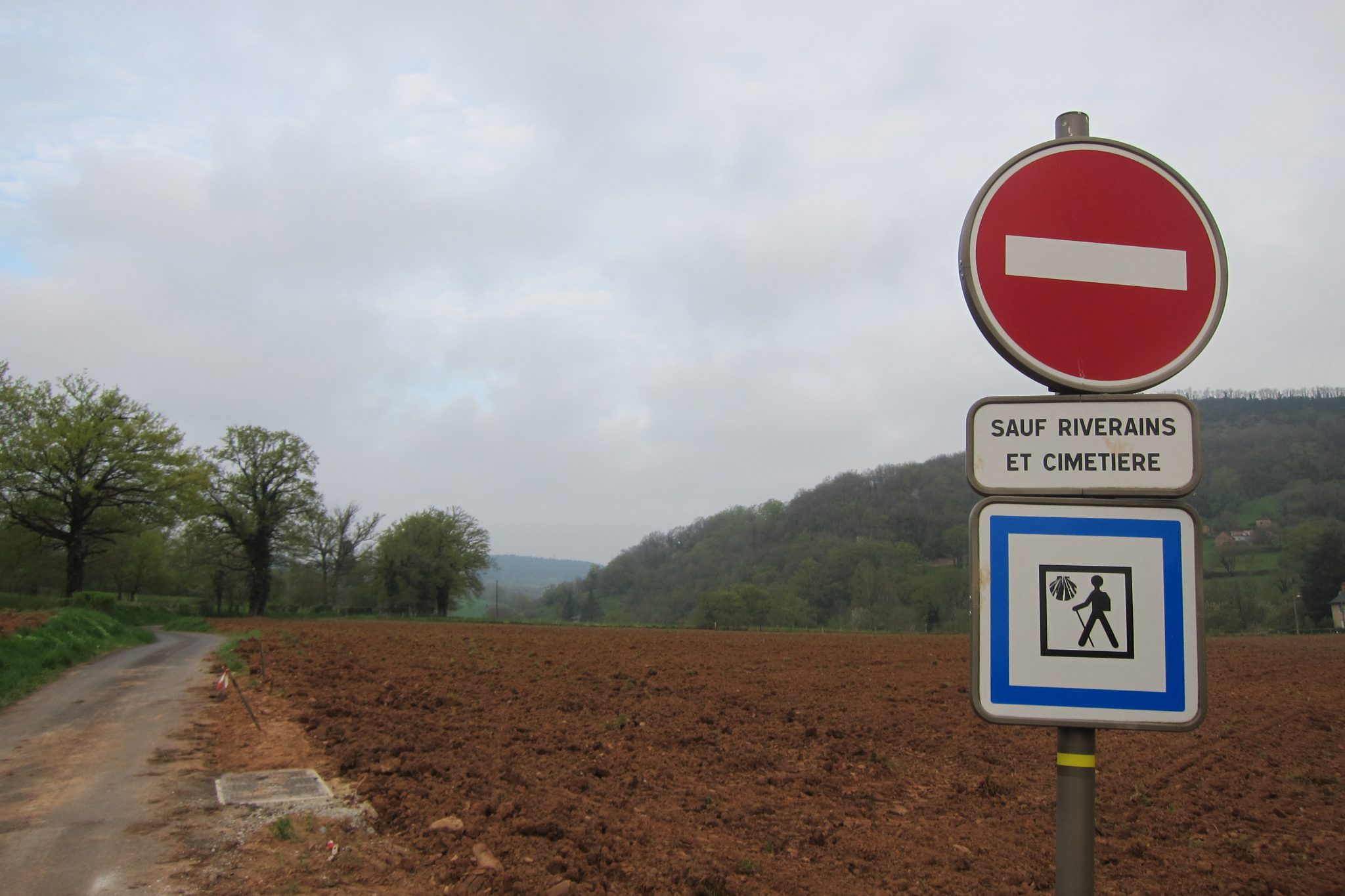 Kad pilsēta paliek aiz muguras, atkal sākas kāpiens stāvā kalnā. Pie tā mani apdzen pāris ceļinieki. Nokāpjot no kalna sagaida cits triks – dubļiem klāta taka, pa kuru nevar paiet, neiegrimstot teju līdz potītēm. Kādu brīdi mīcos pa dubļiem, tad man apnīk, pārkāpju dzeloņdrāšu žogam un atlikušo daļu noeju pa kādu pļavu. Apavi, protams, tapuši daiļi bez gala. Tomēr kādam franču kungam tie ir vēl krāšņāki. Apstājamies pie ūdens krāna un es turu piespiestu krānu (citādi tas netek), bet kungs ar abām rokām berž apavus. Viņš man arī piedāvā piepalīdzēt, tomēr nolemju savus zābakus zem krāna tomēr nemērkt, jo atšķirībā no kunga, man tie vēl ir sausi. Gan jau pa zāli pabridīšu un notrausīšu lielumu, pārējo vakarā, vakarā.