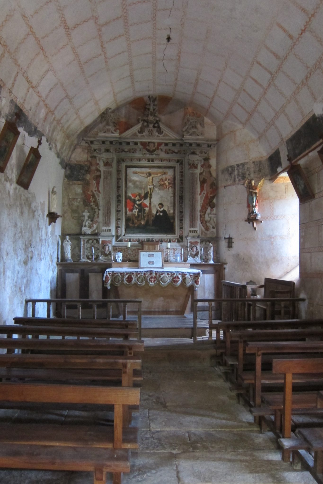 Pēc tam Ceļš ved caur kādu vietu, kuru nokristu par puķu pilsētu – tās te zied kupenām visās malās, neticams krāšņums. Te ir arī kāda 12. gadsimta kapella, kurā var arī ieiet iekšā. Par šo iespēju man jāpateicas franču kurpju kungam, jo es pati nebūtu iedomājusies paraustīt durvis, baidīdamās tās izgāzt no eņģēm. Kapella ir maza mazītiņa – ar plaisām griestos un nolupušu apmetumu, bet tieši tas pastiprina autentiskuma un senatnīguma iespaidu. Pēc tam omu uzlabo ceļmalā stāvošs ēzelis – pārmaiņas pēc šis nevis man apzviedz, bet velta varen ēzelisku smaidu.
